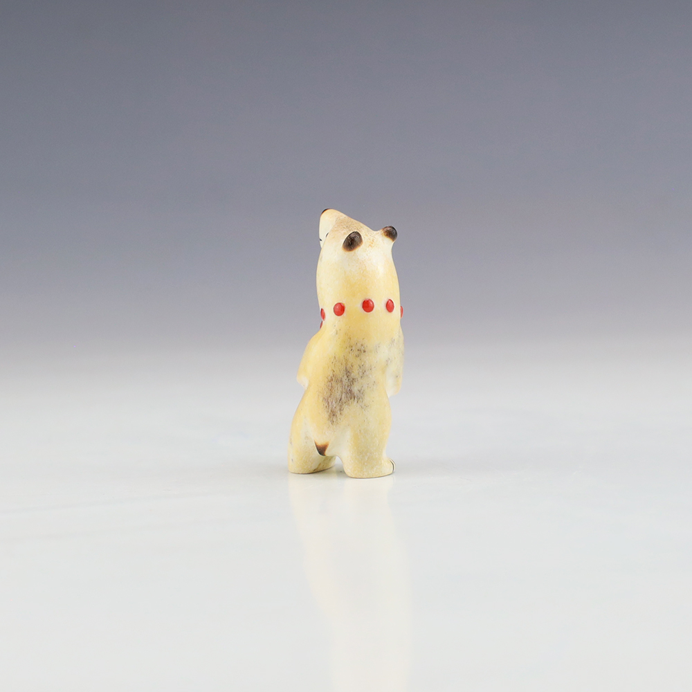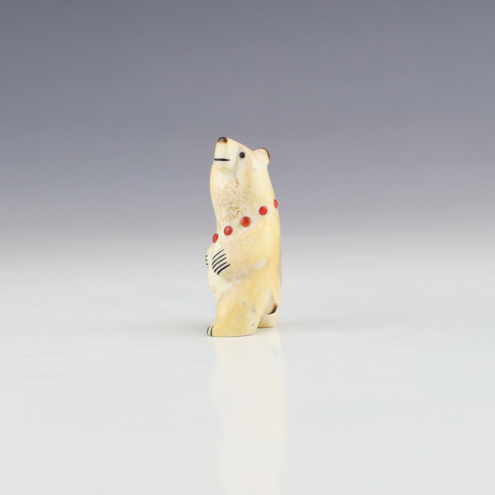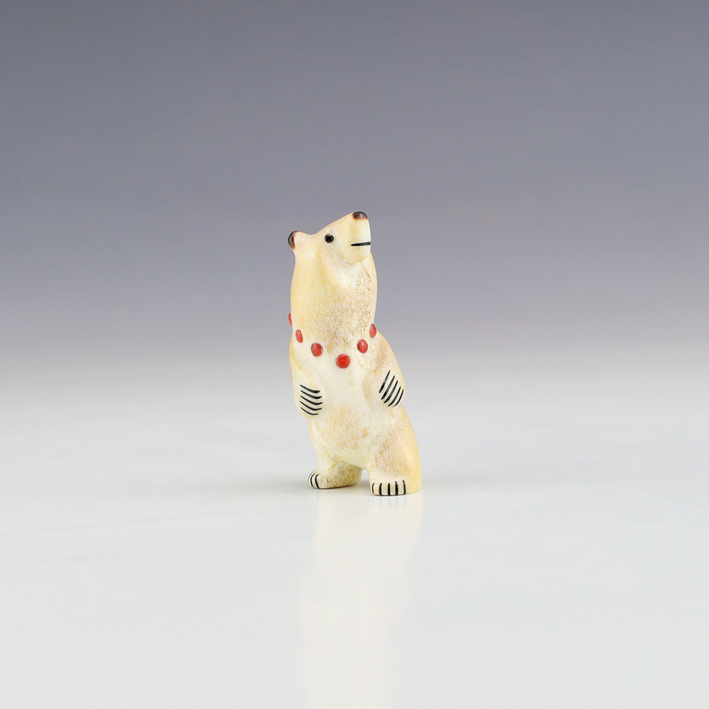 The Bear is the Guardian fetish of the West, and represents healing and strength. This wonderfully carved bear fetish is made out of Antler and inlaid with natural Coral. Zuni artist Gabe Sice is known for this outstanding bears. This carving would make a great addition to your Native American art or Zuni fetish collection. Signed