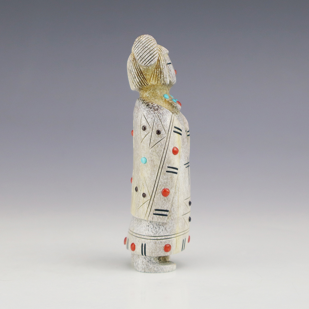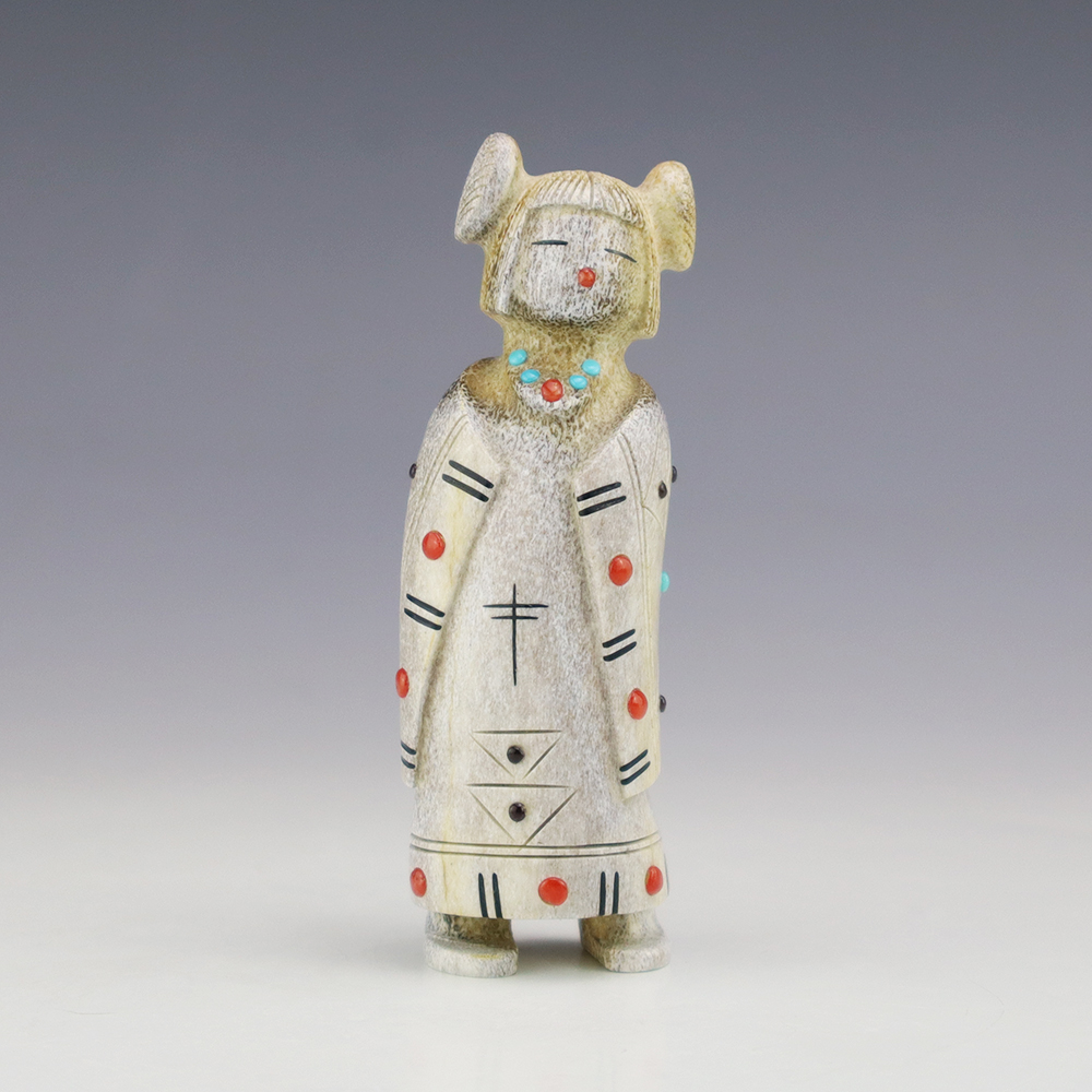 Zuni artist Gabe Sice hand carved this beautiful maiden fetish. Made out of antler with intricate detail and inlaid with natural Mediterranean Coral, Sleeping Beauty Turquoise, and Penn Shell. This maiden would make a great addition to your Native American or Zuni fetish collection. Signed