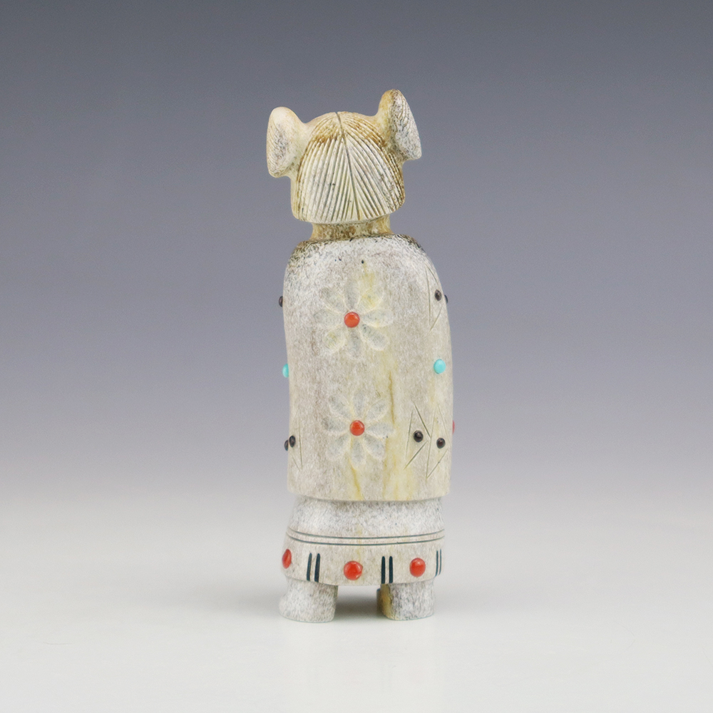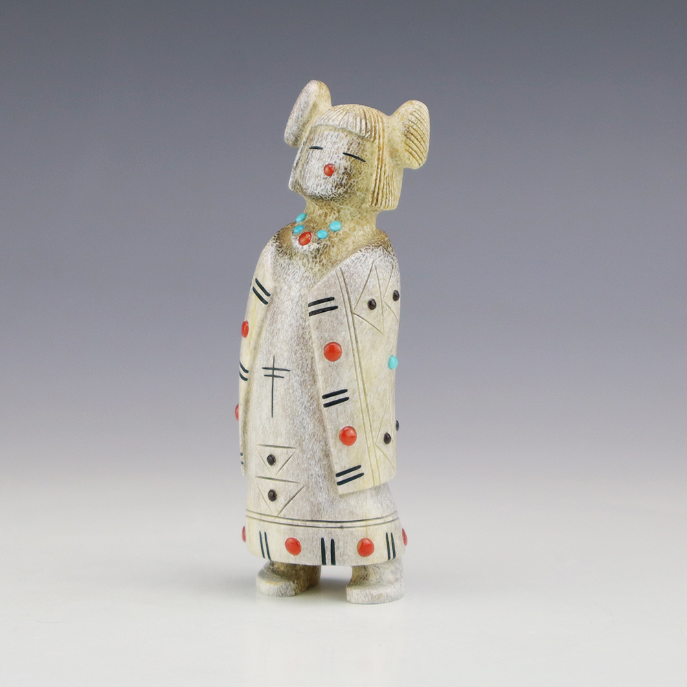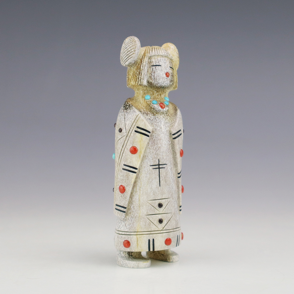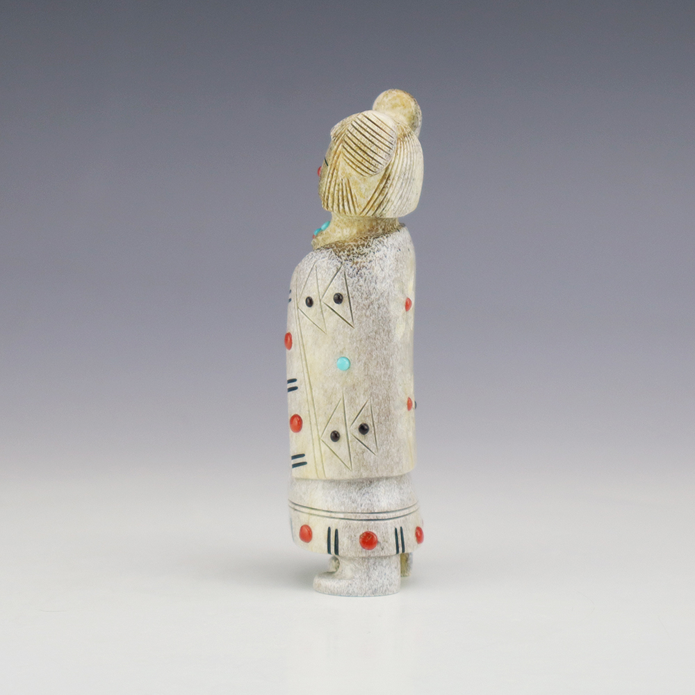Zuni artist Gabe Sice hand carved this lovely maiden fetish. Made out of antler with intricate detail and inlaid with natural Sleeping Beauty Turquoise, Mediterranean Coral, and Penn Shell. This maiden would make a great addition to your Native American or Zuni fetish collection. Signed 2 3/8” tall x 3/4”...