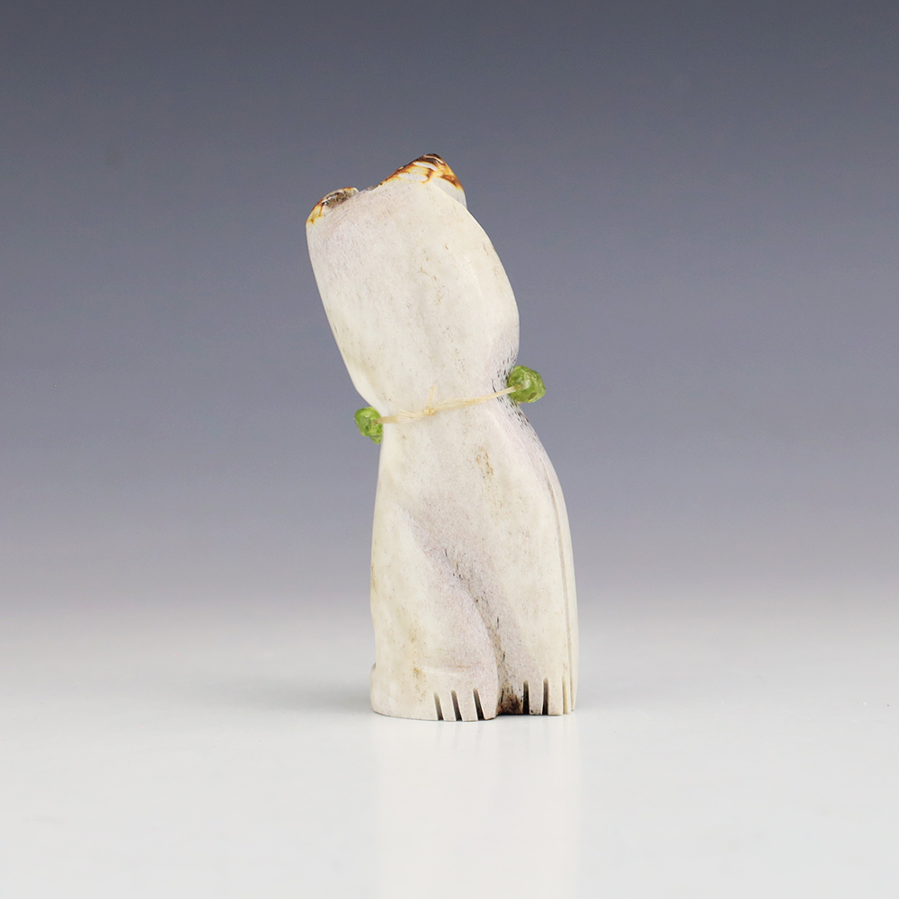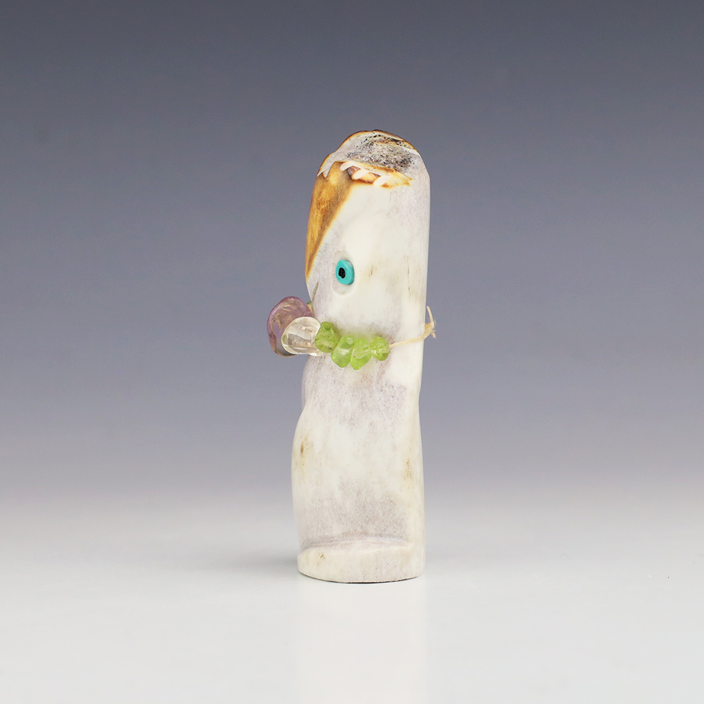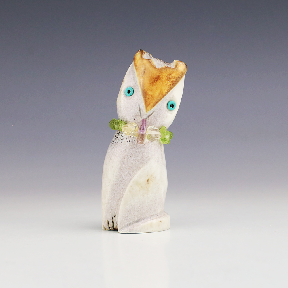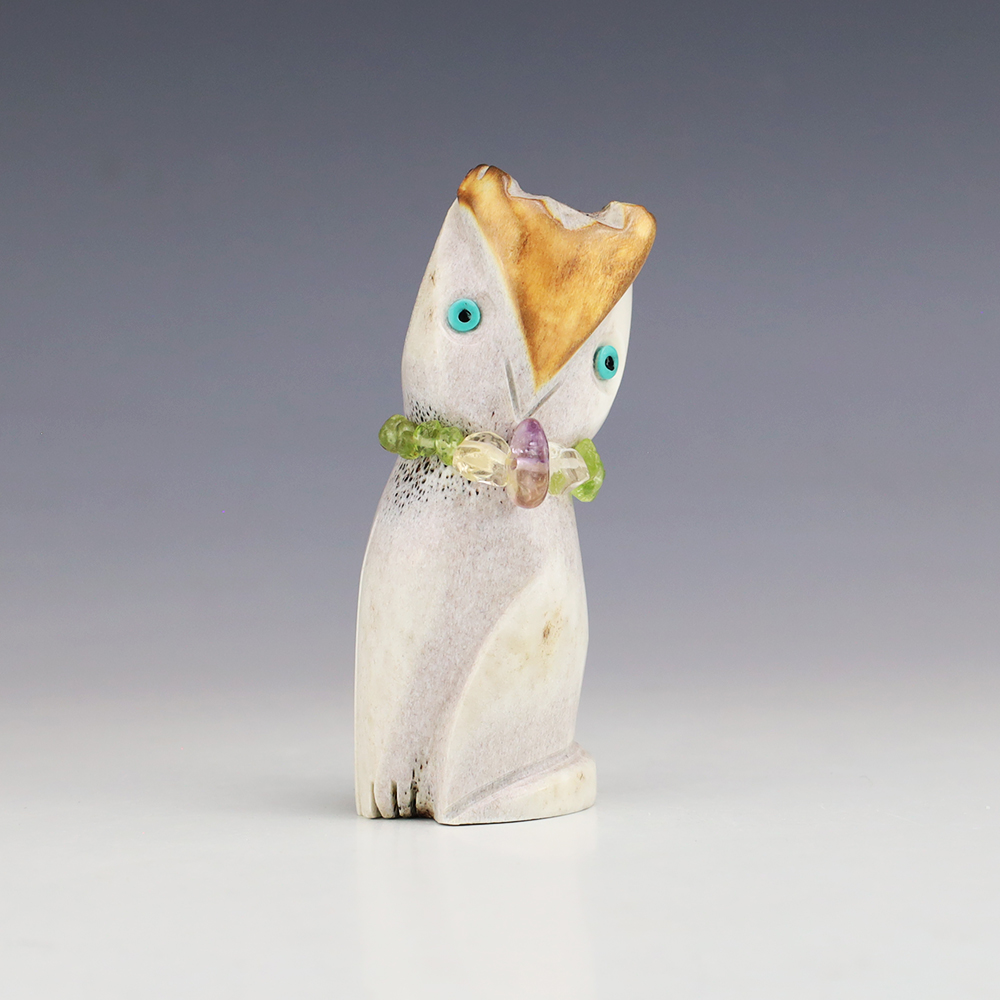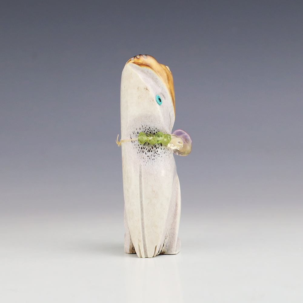 The Owl is the protector of the home. He represents wisdom and truth, and has the ability to see what others cannot. Zuni artist Robert Weahkee made this wonderful owl fetish. Hand carved out of Antler. This great carving would make a great addition to your Native American art or Zuni fetish collection. Signed