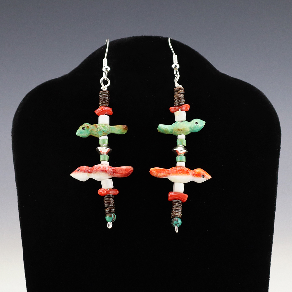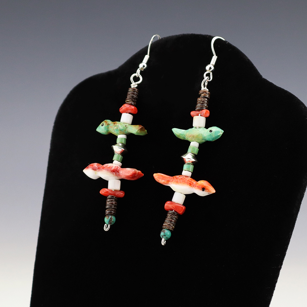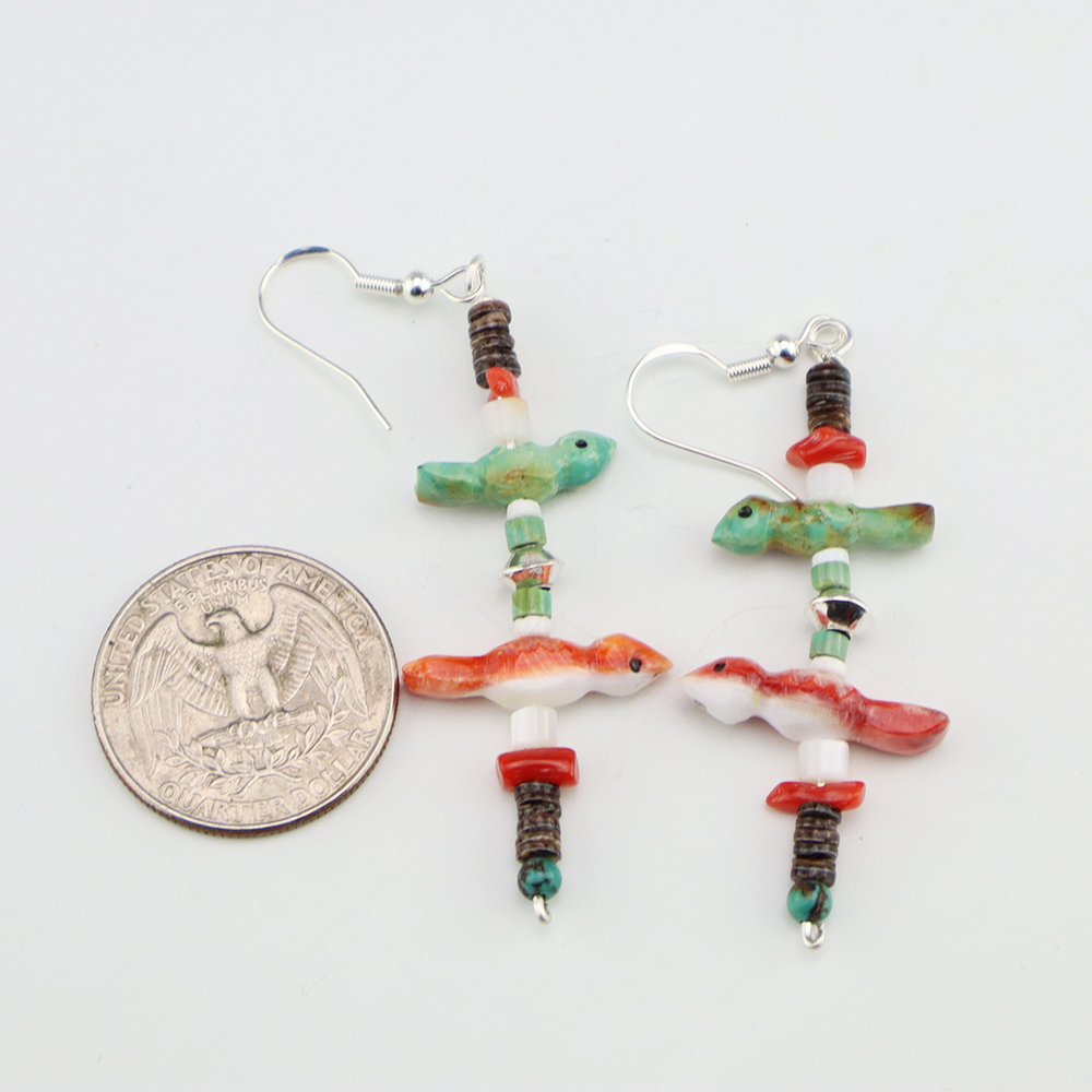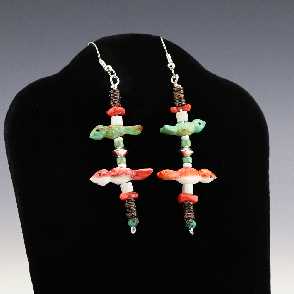 Lovely bird fetish earrings made out of Turquoise, Coral, Olive Shell, Spiny Oyster, and sterling silver. Hand made by Nancy and Sheldon Westika. These earrings will become a versatile accessory in your jewelry collection. Weighs 6 grams.