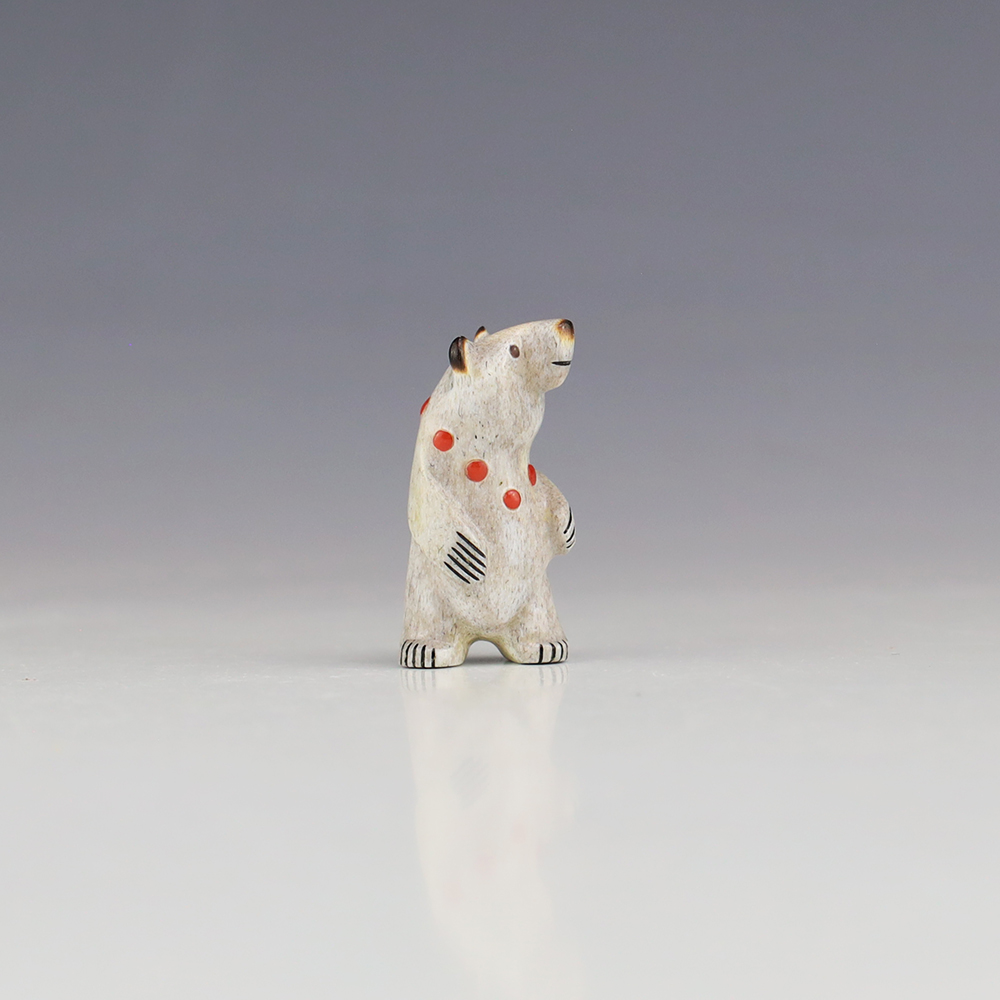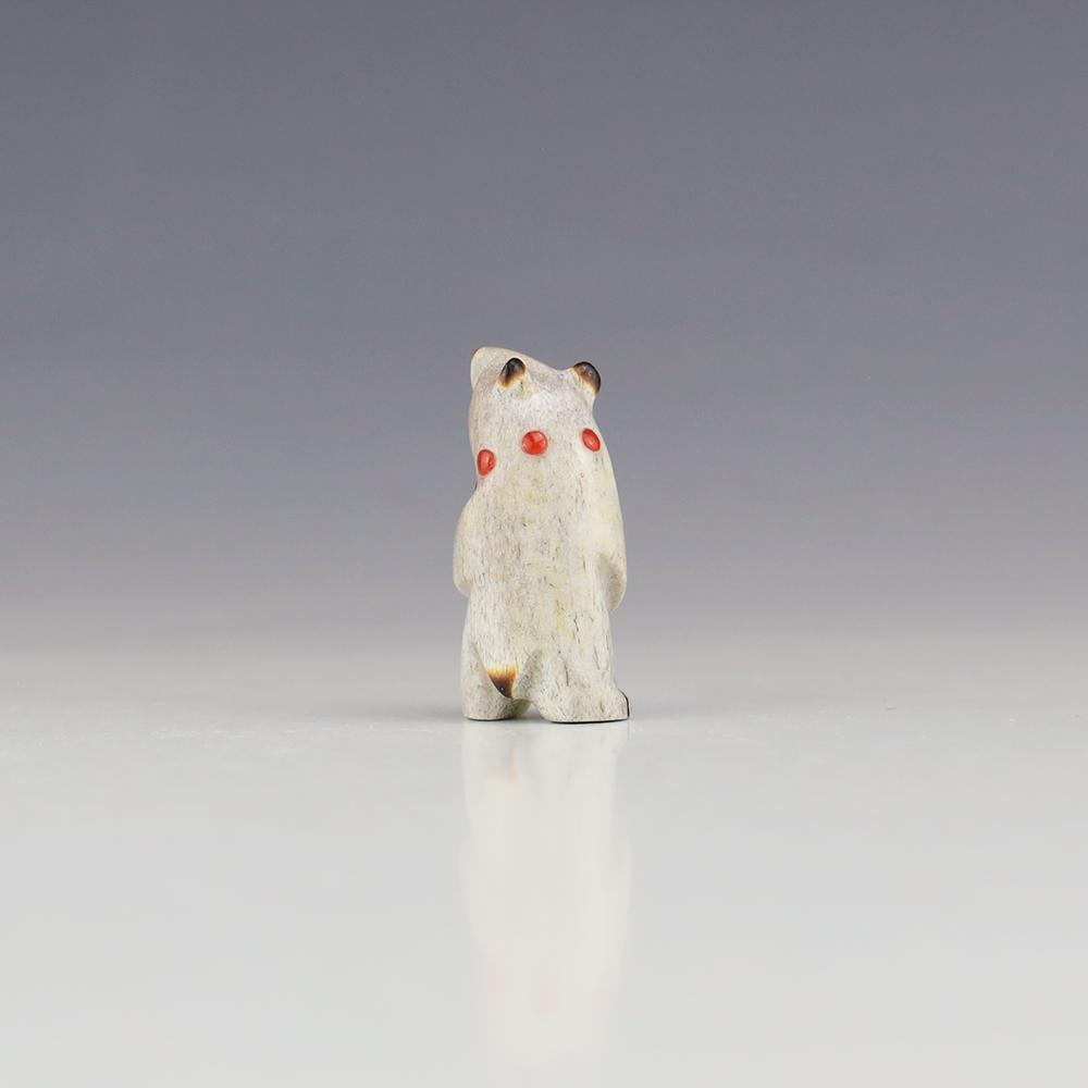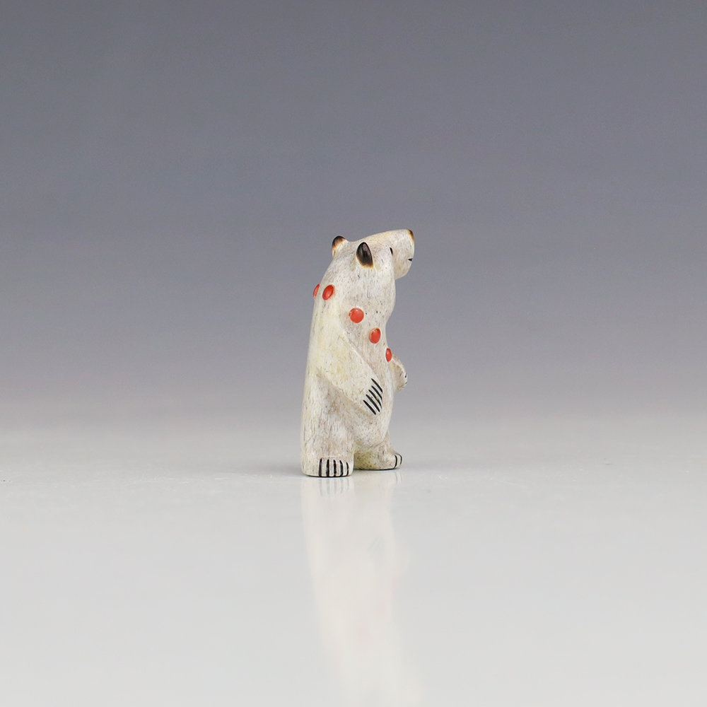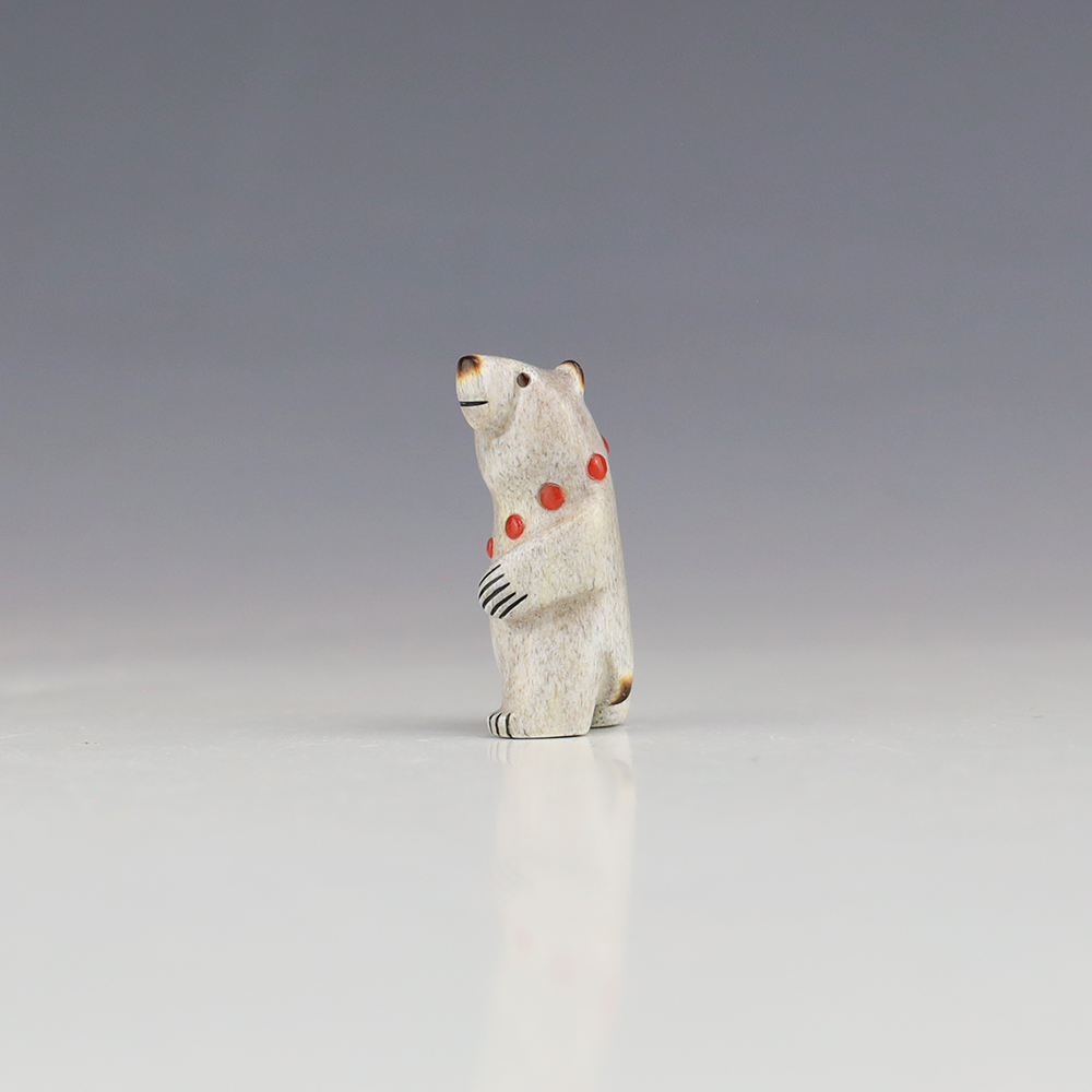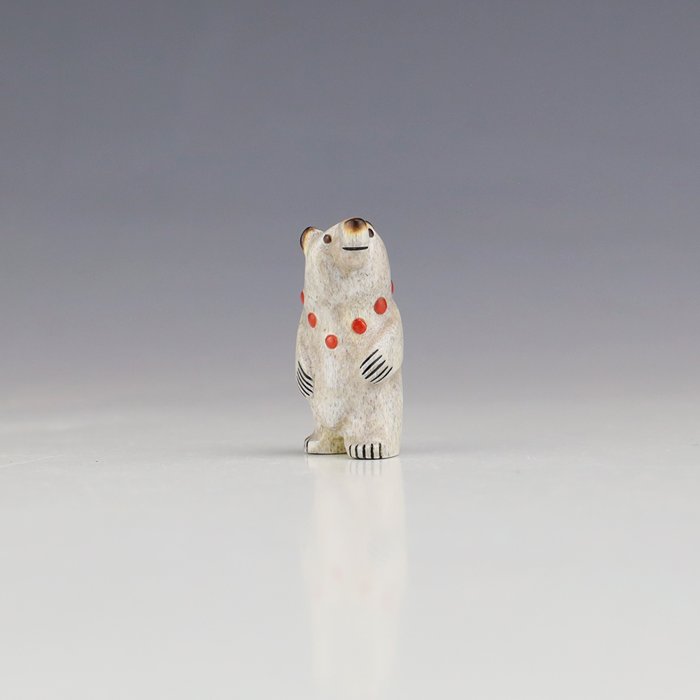 The Bear is the Guardian fetish of the West, and represents healing and strength. Zuni artist Gabe Sice is known for this outstanding bears. This wonderfully carved bear fetish is made out of Antler and inlaid with natural Mediterranean Coral and Penn Shell. Gabe hand cabs each stone. This carving would make a great addition to your Native American art or Zuni fetish collection. Signed