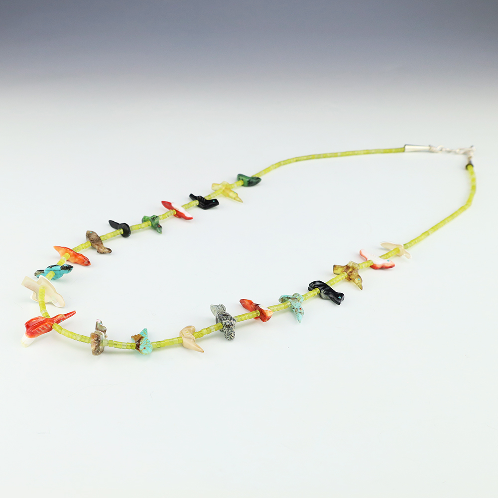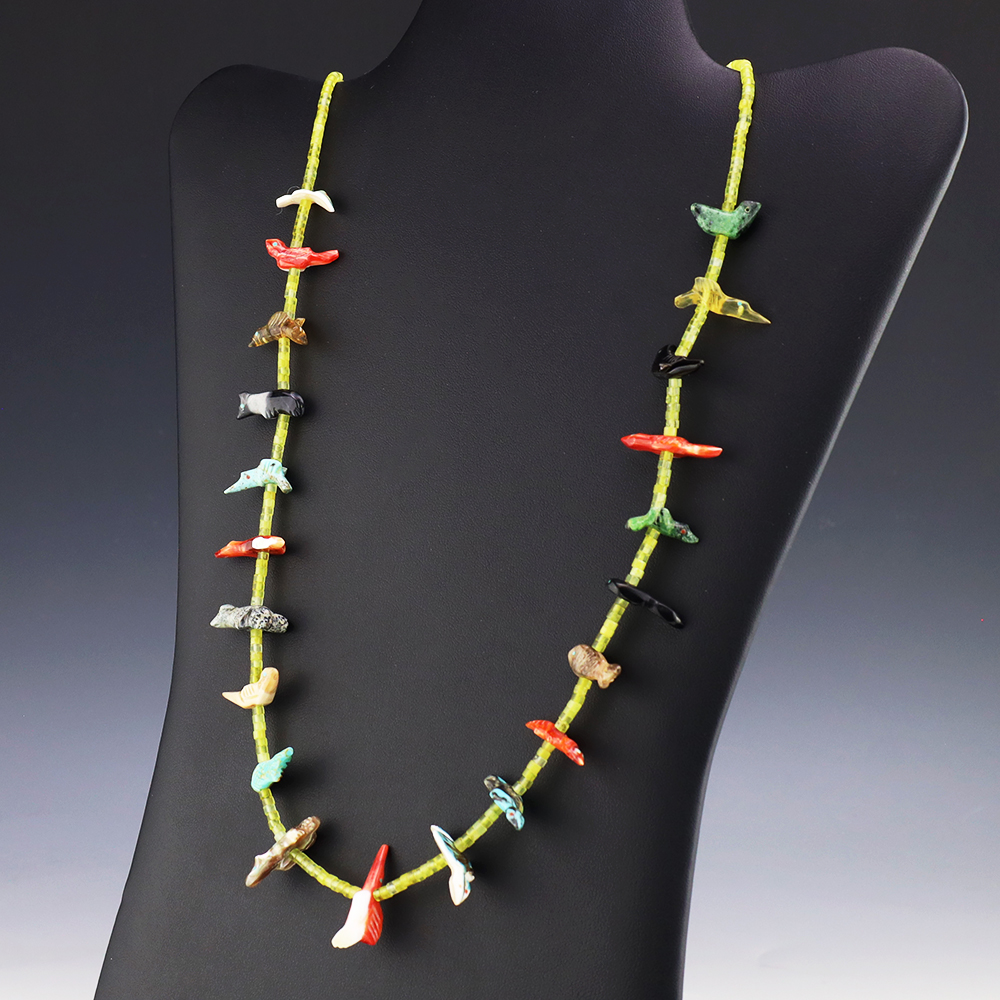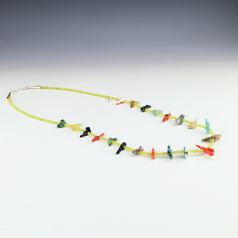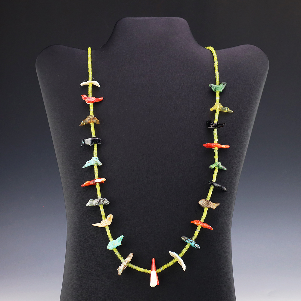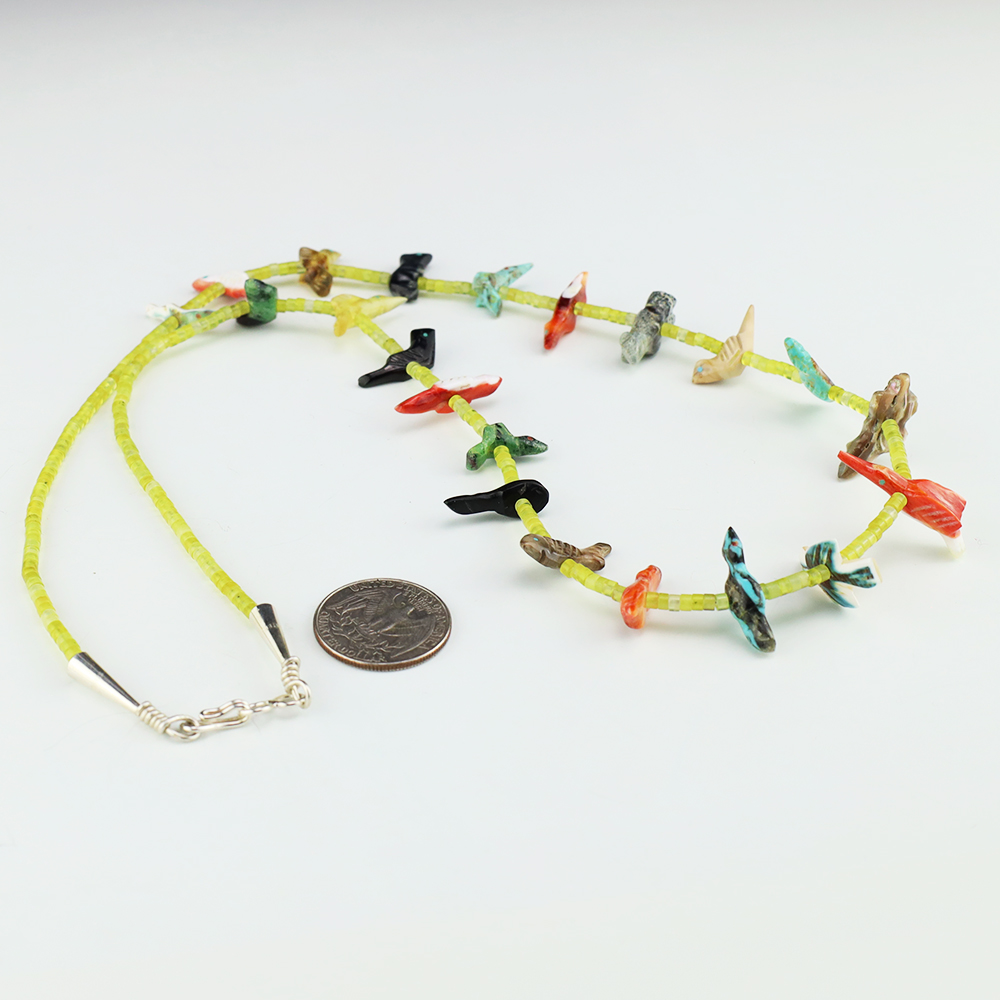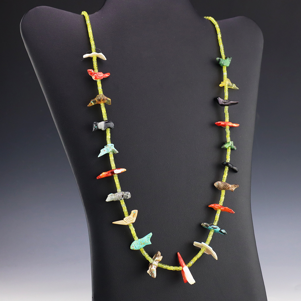 Zuni artist Evalena Boone created this exquisite fetish necklace. The necklace has hummingbird, frog, wolf, bird, badger, and fish fetishes made out of Turquoise, Spiny Oyster, Jet, Amber, Green Snail Shell, Picasso Marble, Serpentine, Picture Jasper, Abalone, and Ruby Fuschite. There is fine Serpentine in between the fetish and at the ends. A beautiful strand this is finished off with a sterling silver clasp and cones. A statement piece that you will enjoy for many years. Weighs 24 grams.
