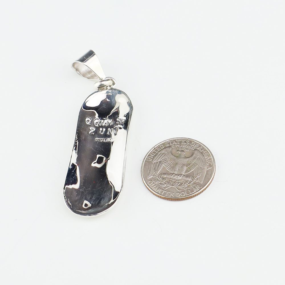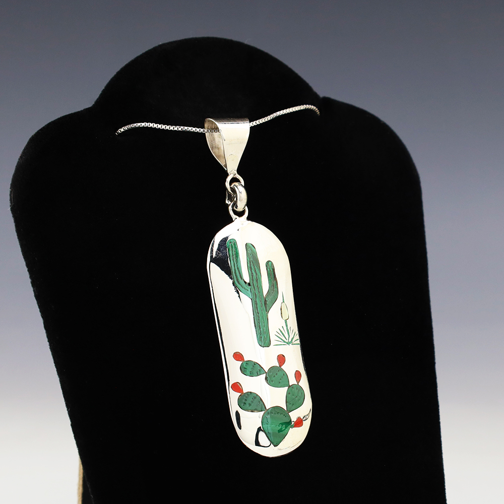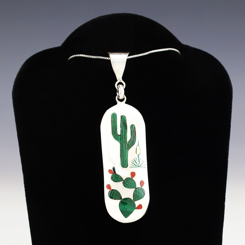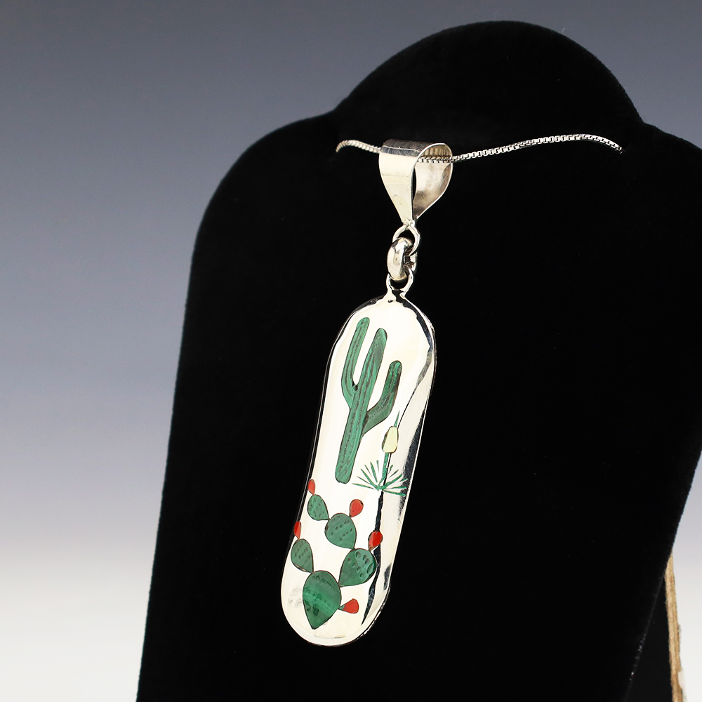 Zuni jeweler Quintin Quam hand made this beautiful pendant depicting a Yucca, Saguaro Cactus, and Prickly Pear Cactus. The sterling silver pendant is intricately inlaid with Coral, Malachite, and Mother of Pearl Shell. Amazing detail! Weighs 10 grams. (Chain not included) Signed