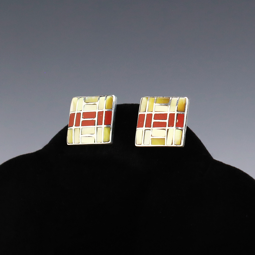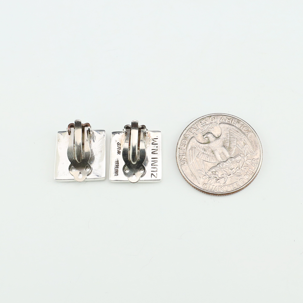 Zuni artists Nancy and Sheldon Westika created these lovely clip earrings. The Westikas have been making jewelry since the 1970’s and they are known for their fine inlay work. Made out of sterling silver and inlaid with Pipestone and Mother of Pearl Shell. Weighs 6 grams. Signed