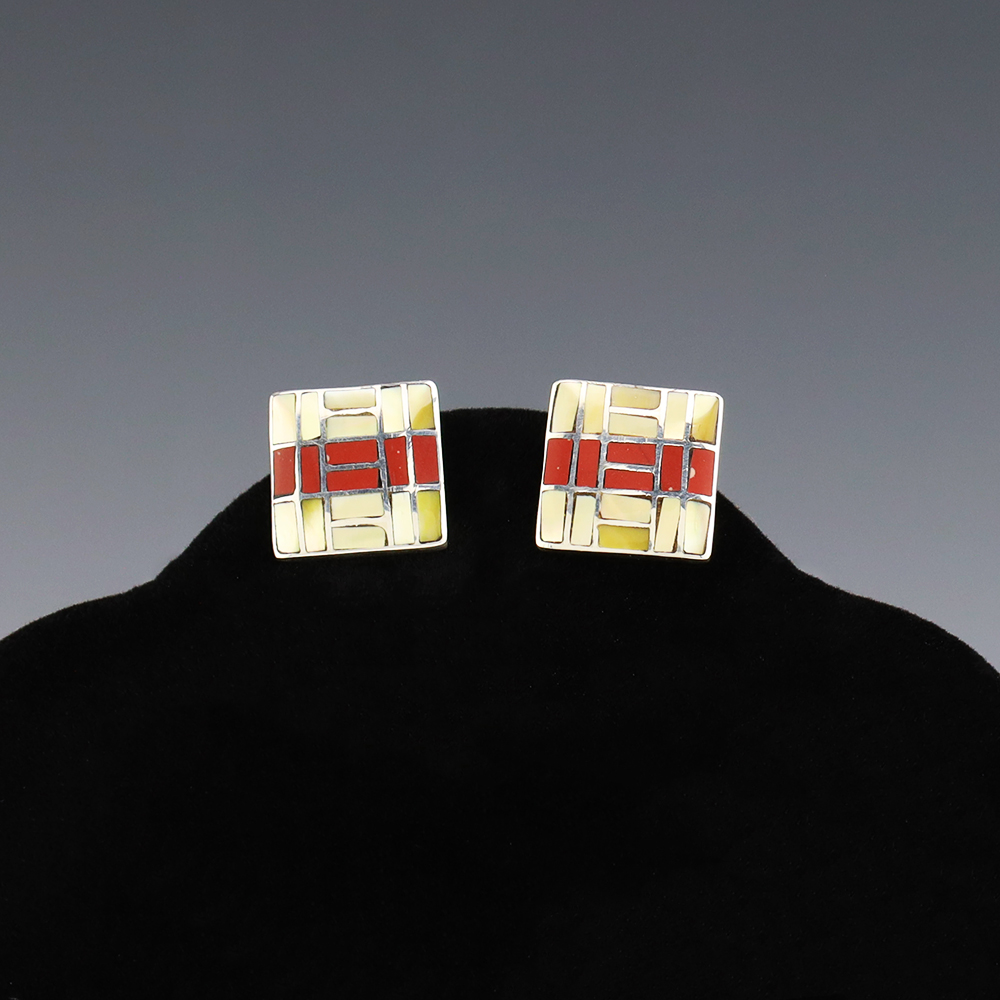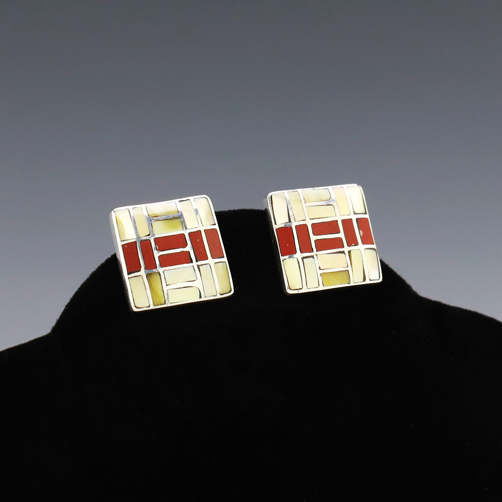 Outstanding sterling silver earrings with Mother of Pearl Shell and Turquoise inlay. Hand crafted by Zuni jewelry makers, Nancy and Sheldon Westika. The Westikas have been making jewelry since the 1970’s and they are known for their fine inlay work. Weighs 6 grams. Signed 7/8” wide x 7/8” tall 1 ...