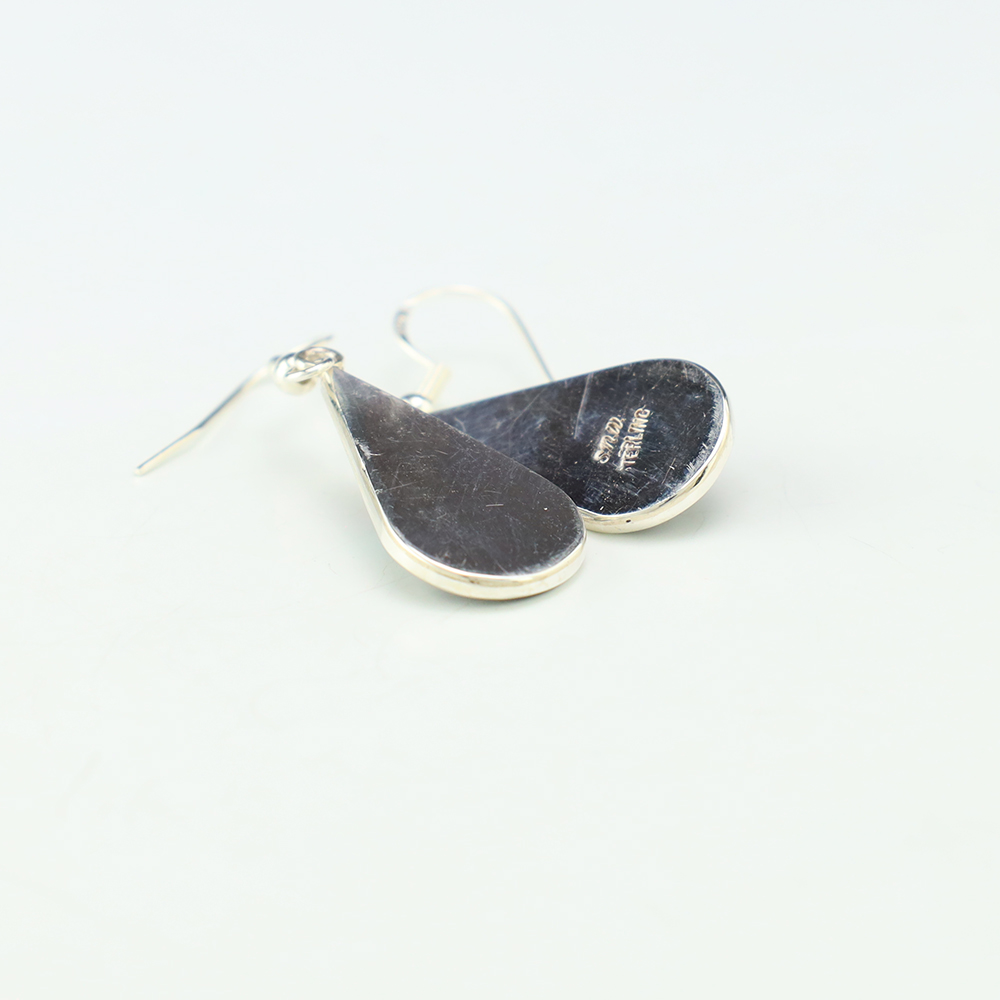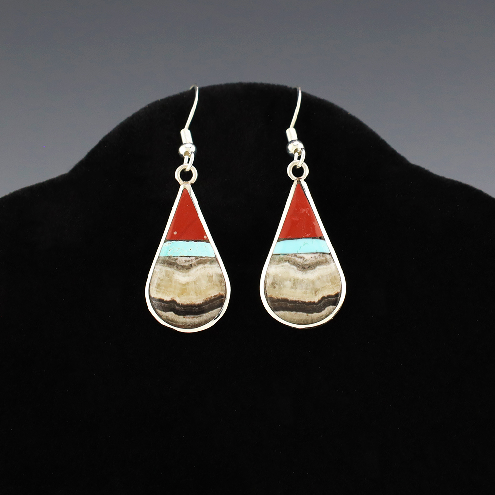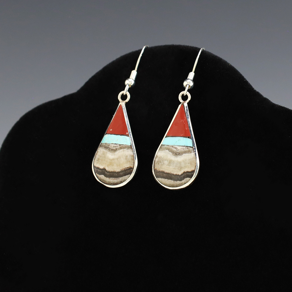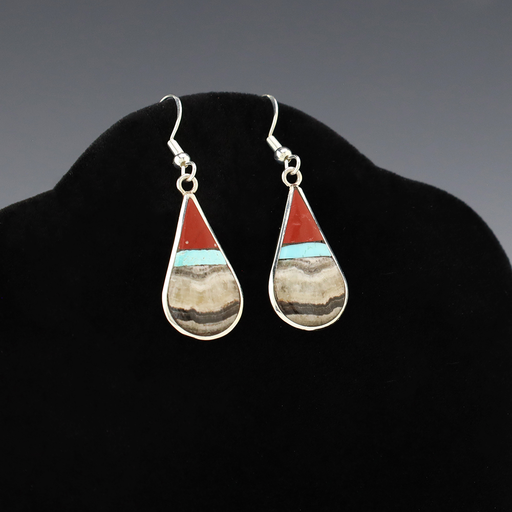 Zuni artists Nancy and Sheldon Westika created these lovely earrings. The Westikas have been making jewelry since the 1970’s and they are known for their fine inlay work. Made out of sterling silver and inlaid with natural Kingman Turquoise, Pipestone, and Onyx. Weighs 4 grams. Signed