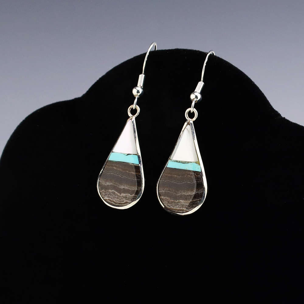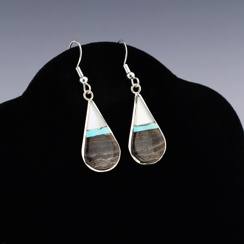 Zuni artists Nancy and Sheldon Westika created these lovely earrings. The Westikas have been making jewelry since the 1970’s and they are known for their fine inlay work. Made out of sterling silver and inlaid with natural Kingman Turquoise, Mother of Pearl Shell, and Onyx. Weighs 4 grams. Signed