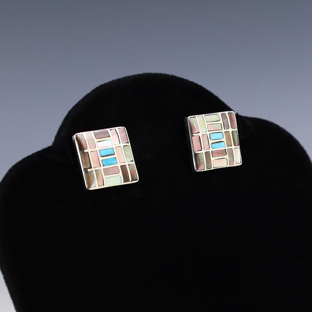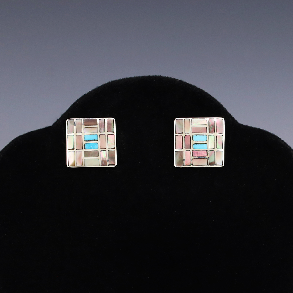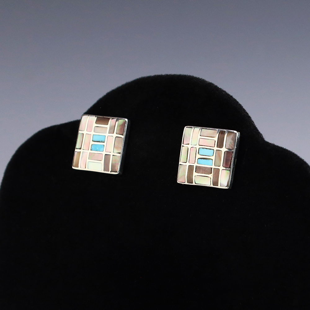 Zuni artists Nancy and Sheldon Westika created these lovely earrings. The Westikas have been making jewelry since the 1970’s and they are known for their fine inlay work. Made out of sterling silver and inlaid with natural Kingman Turquoise and Mother of Pearl Shell. Weighs 6 grams. Signed