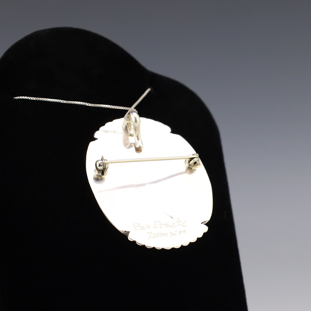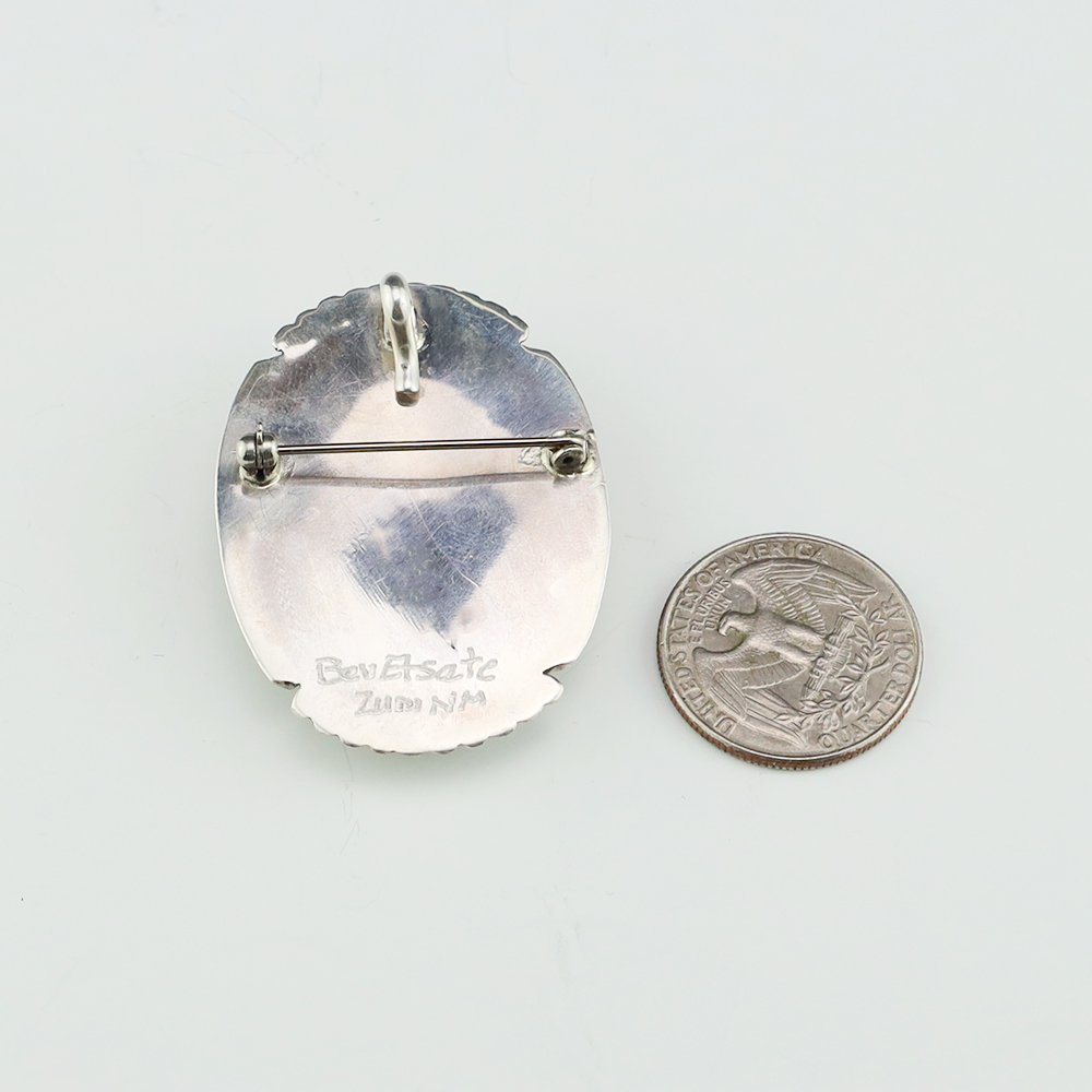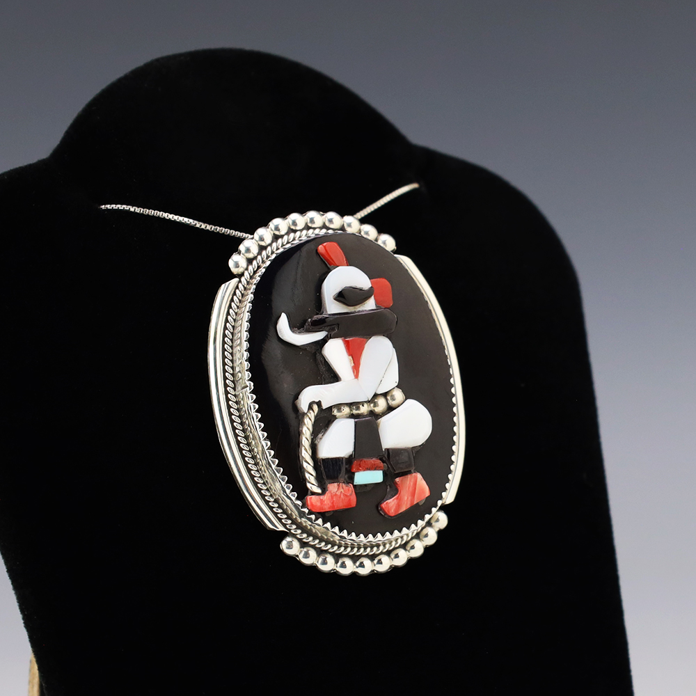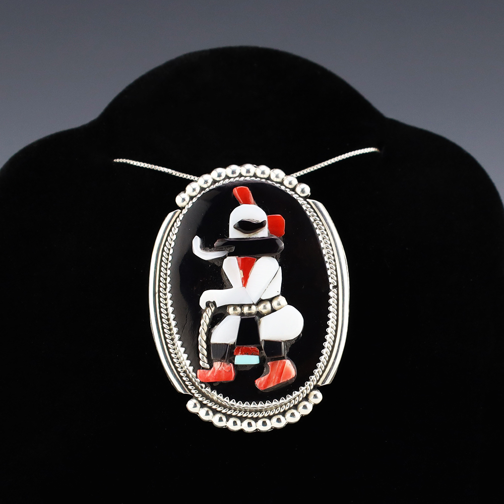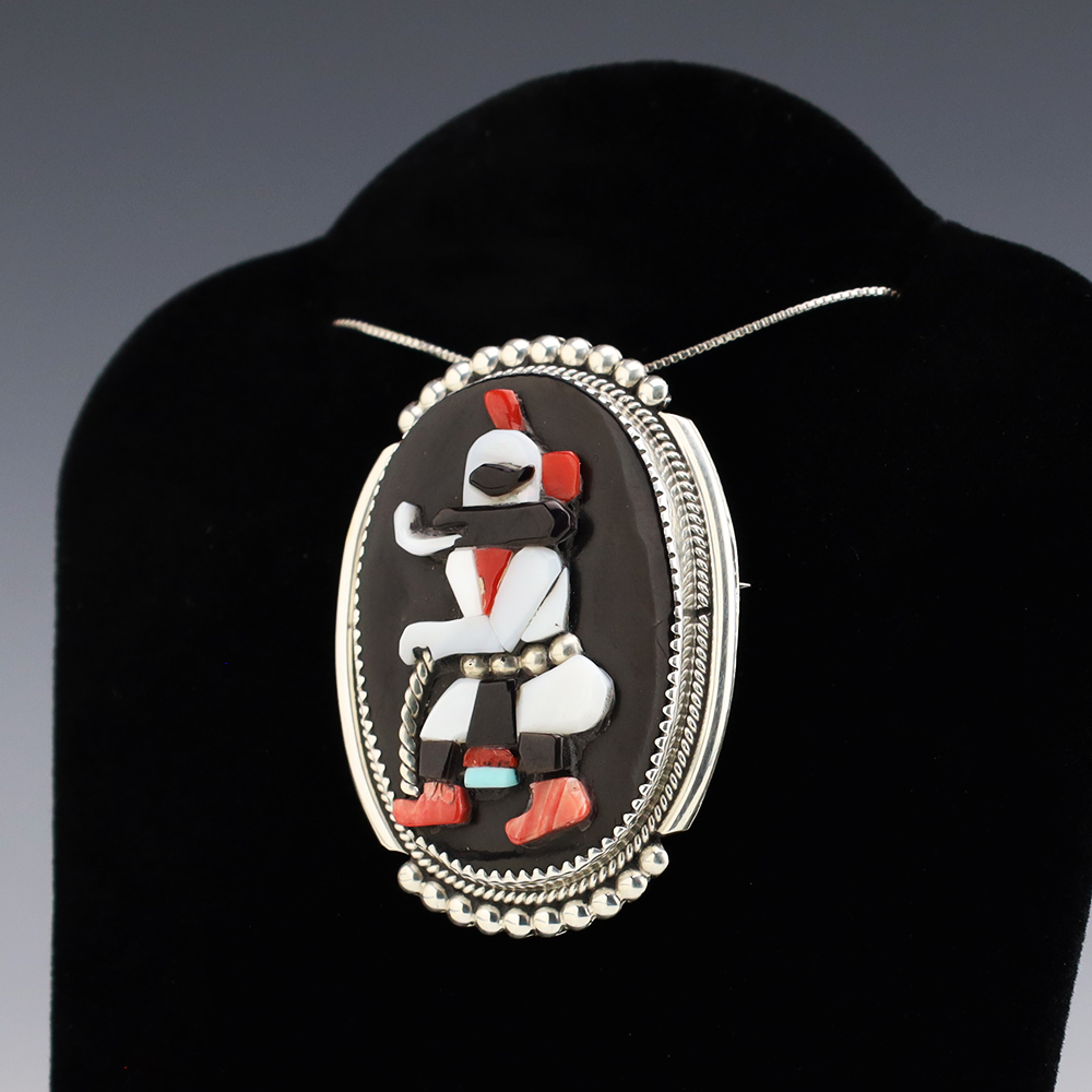 Zuni artist Beverly Etsate made this exquisite kachina pendant. Zuni artists are known for their fine lapidary skills. Each stone is hand cut, polished, and set into a sterling silver setting. The pendant is inlaid with Mother of Pearl Shell, Coral, Turquoise, and Jet. It can also be worn as a pin. Weighs 16 grams. Signed. (Chain not included)