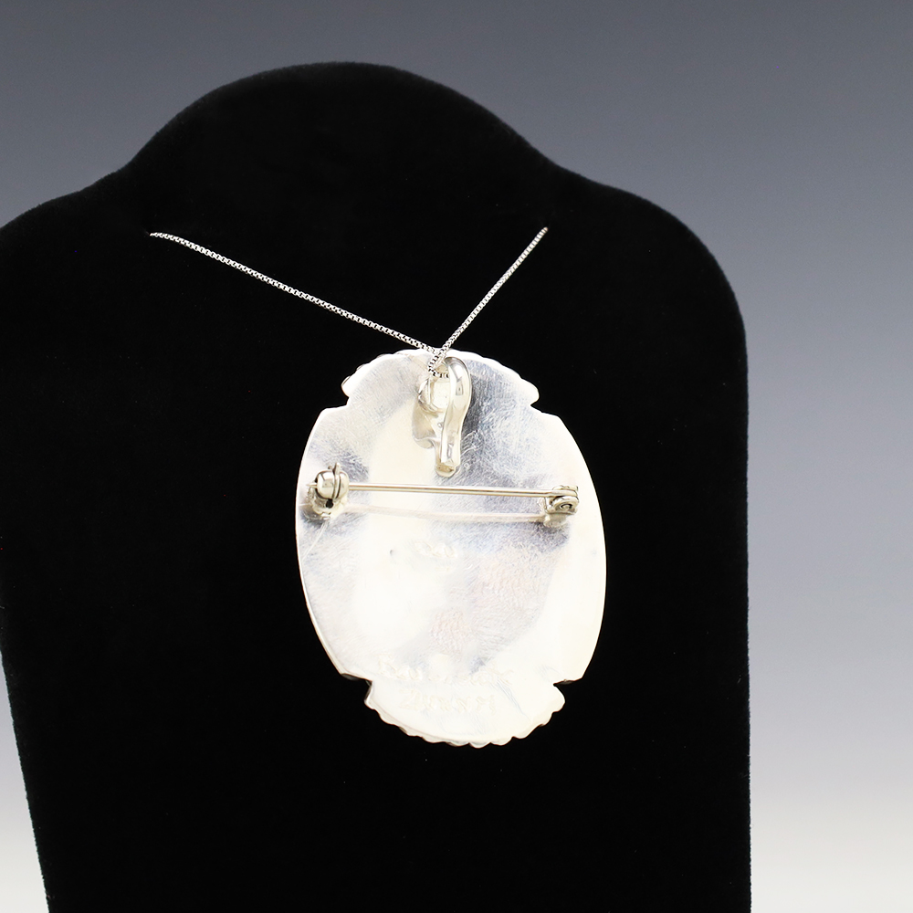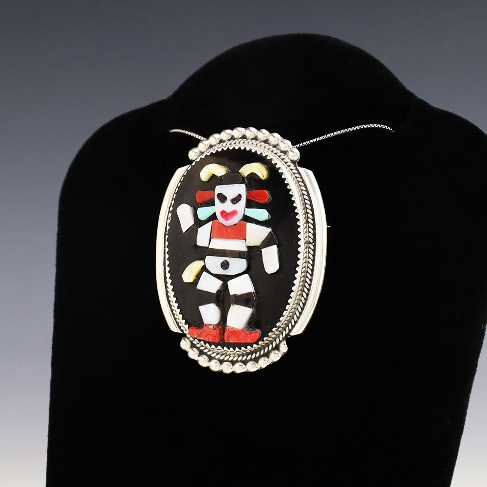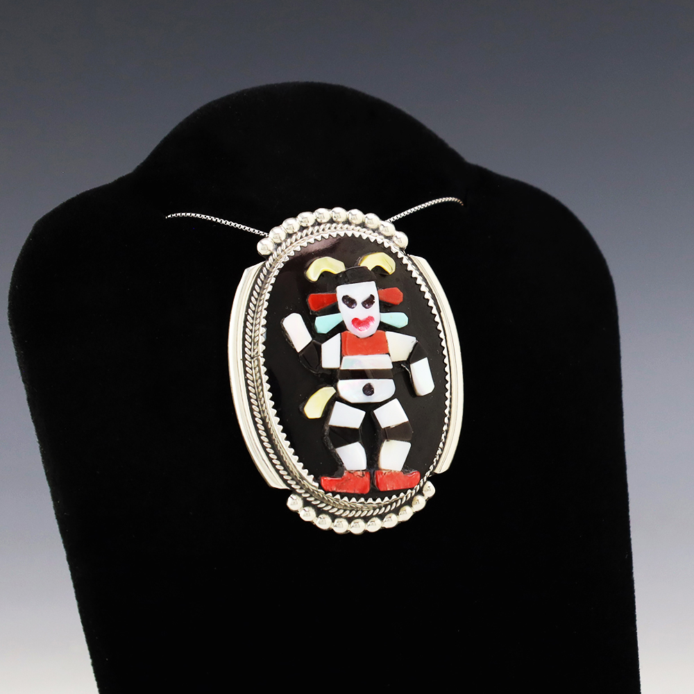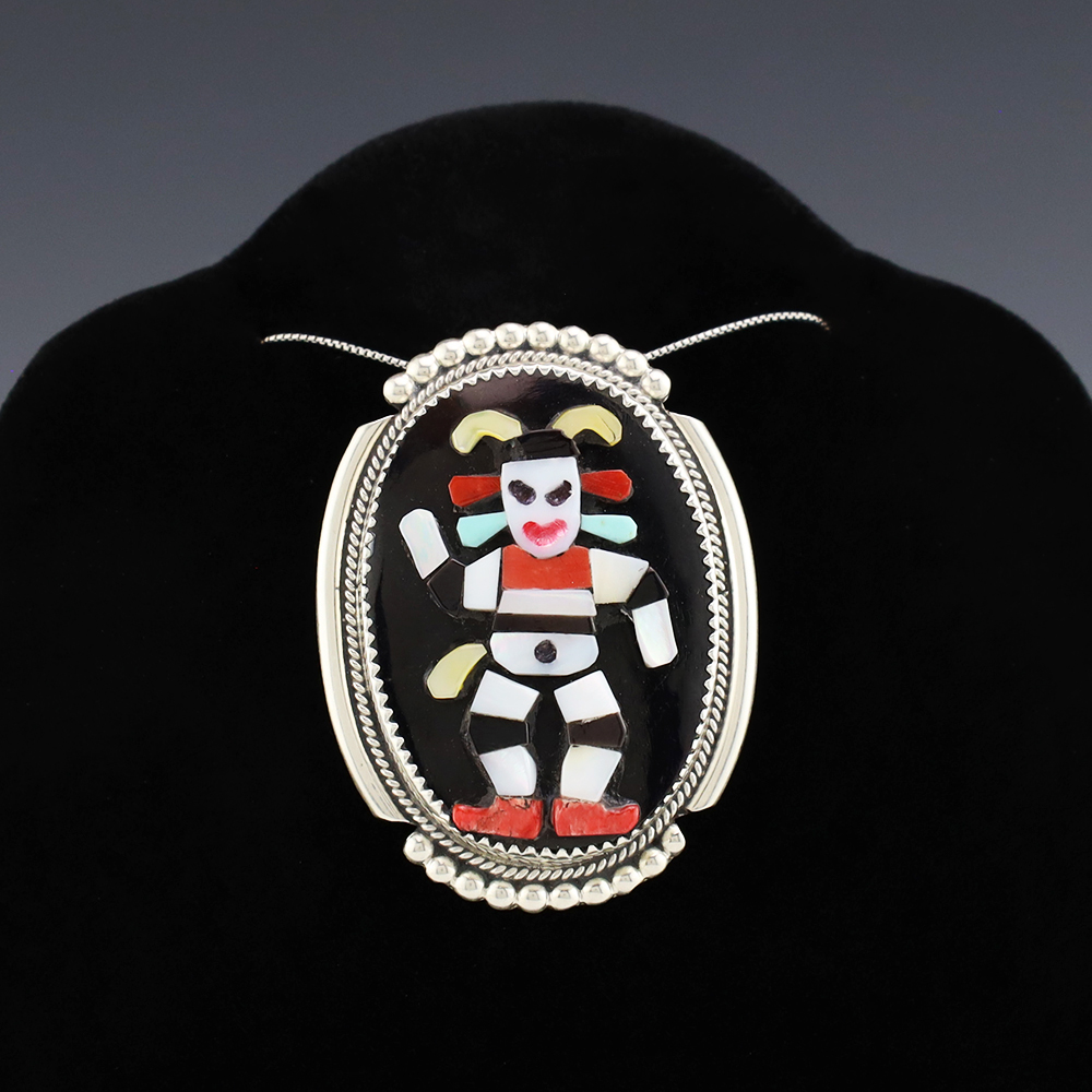 Zuni artist Beverly Etsate made this wonderful Koshare pendant. Zuni artists are known for their fine lapidary skills. Each stone is hand cut, polished, and set into a sterling silver setting. The pendant is inlaid with Mother of Pearl Shell, Coral, Turquoise, and Jet. It can also be worn as a pin. Weighs 16 grams. Signed. (Chain not included)