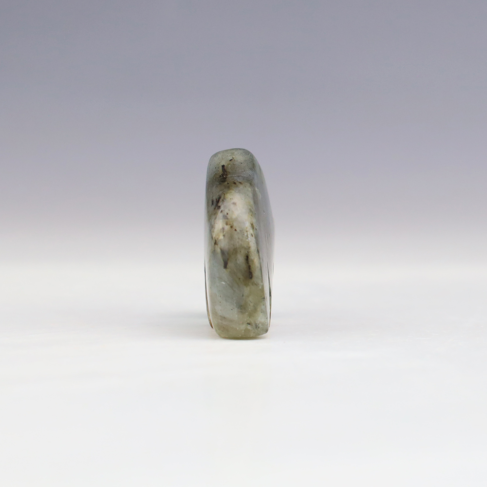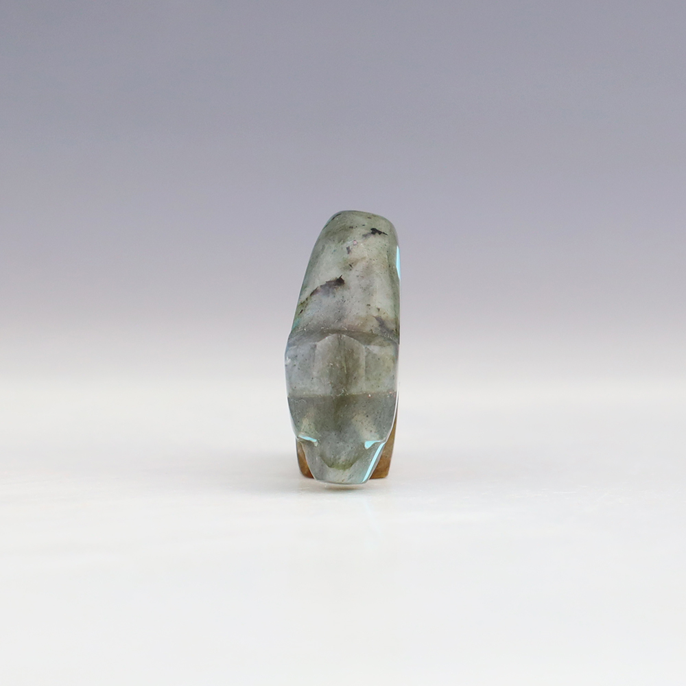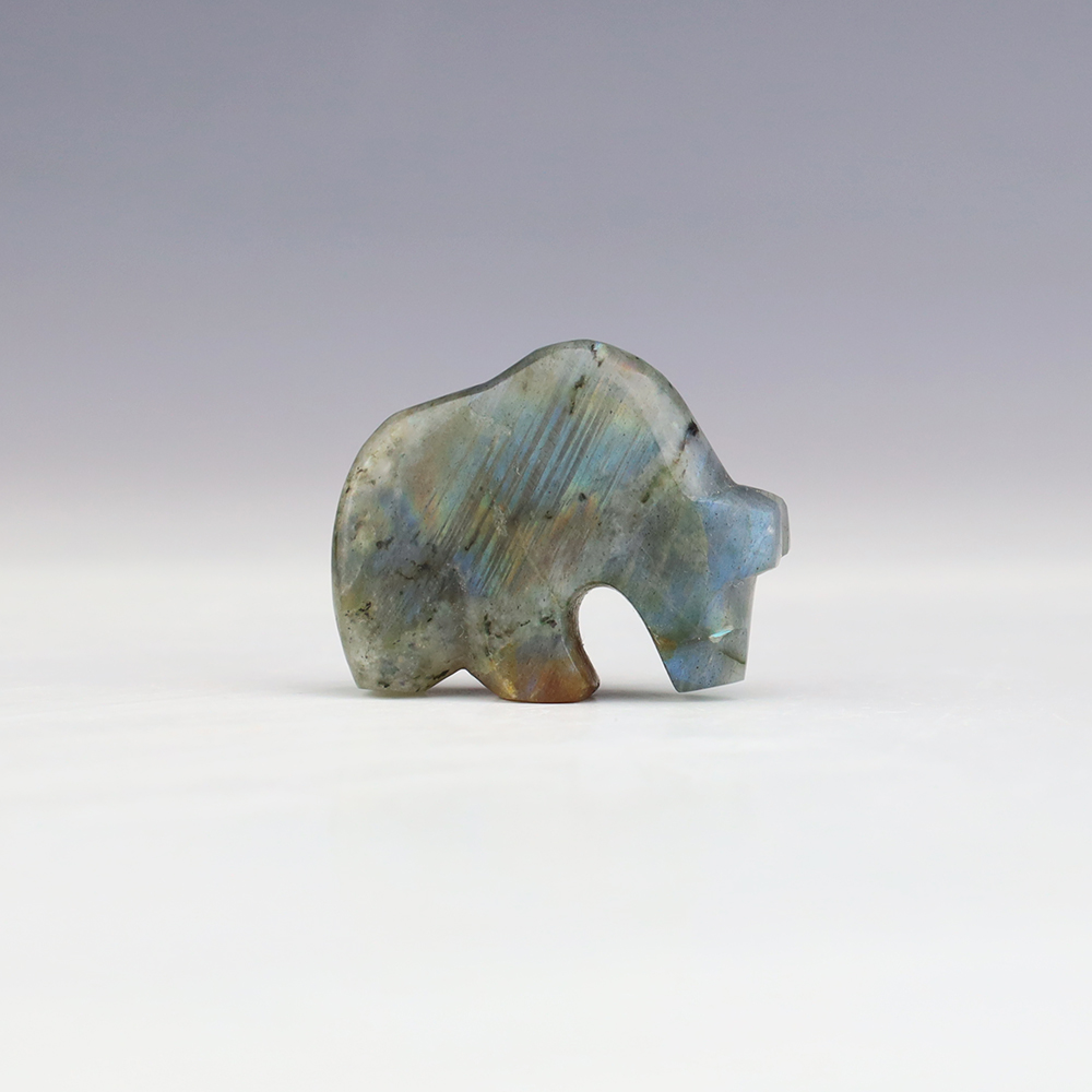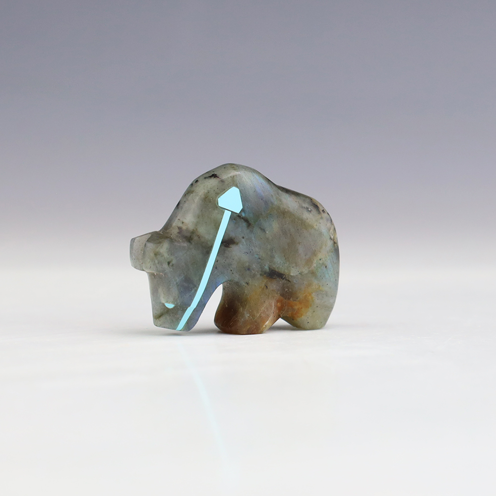 Zuni bear fetishes represent healing and strength. Zuni artist Kenric Laiwakete made this stellar bear fetish. The bear carving is made out of Labradorite and has an inlaid Turquoise heartline. Labradorite is a member of the Feldspar family and is treasured for its remarkable play of color, known as labradorescence. This luminous specimen is filled with hues of blues and greys. Labradorite also has natural fracturing, giving it beauty and character in the stone. It also changes in different lighting and at different angles. (We take photos in a well lit room). This great carving would make a great addition to your Native American art or Zuni fetish collection. Signed