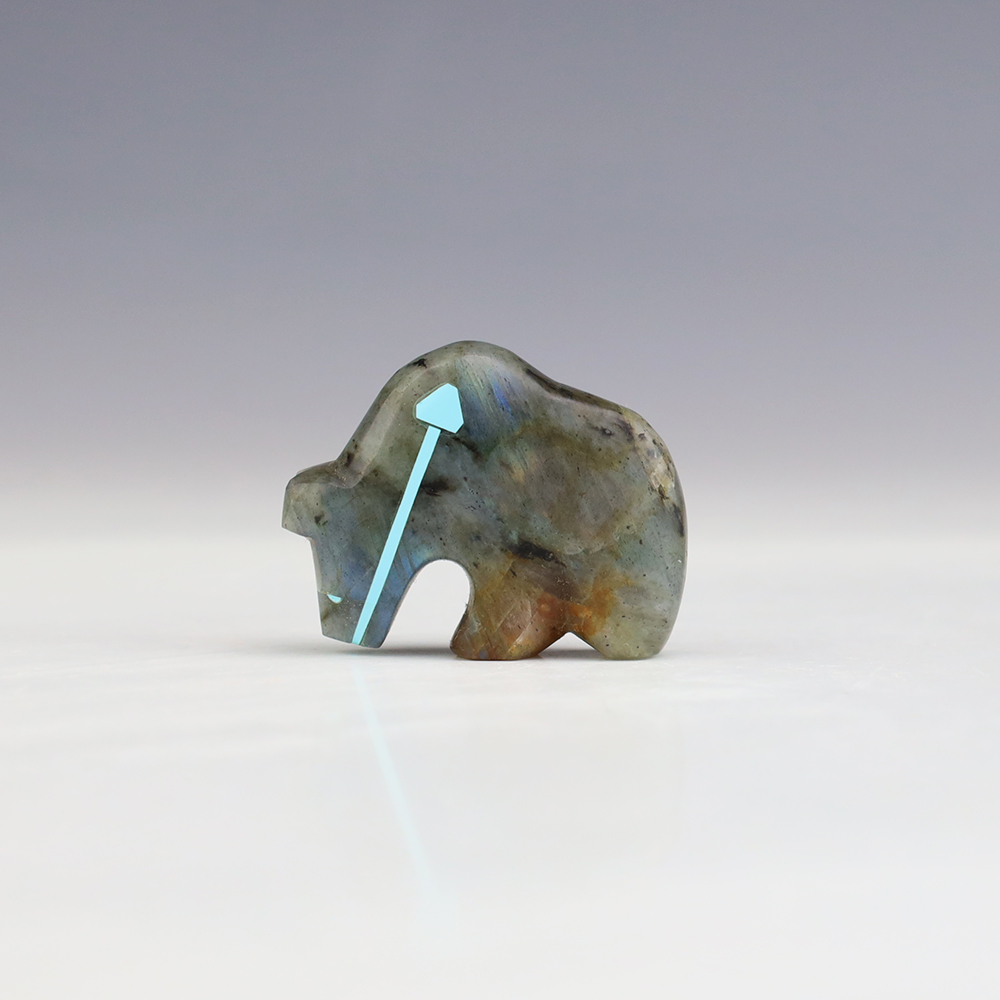 Zuni bear fetishes represent healing and strength. Zuni artist Kenric Laiwakete made this stellar bear fetish. The bear carving is made out of Labradorite and has an inlaid Turquoise heartline. Labradorite is a member of the Feldspar family and is treasured for its remarkable play of color, known as labradorescence. This luminous specimen is filled with hues of blues and greys. Labradorite also has natural fracturing, giving it beauty and character in the stone. It also changes in different lighting and at different angles. (We take photos in a well lit room). This great carving would make a great addition to your Native American art or Zuni fetish collection. Signed