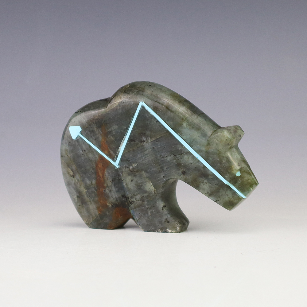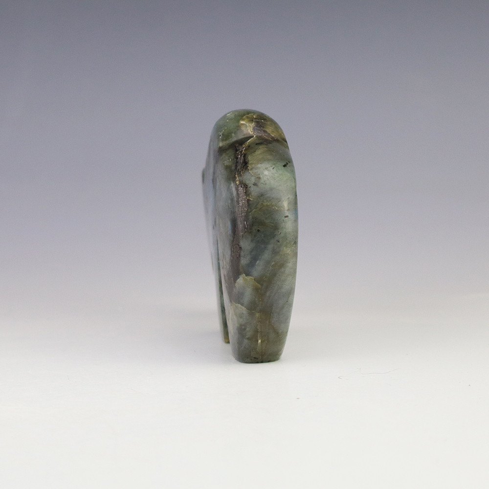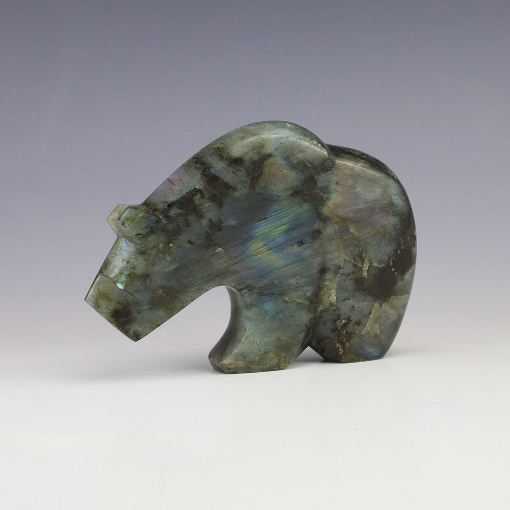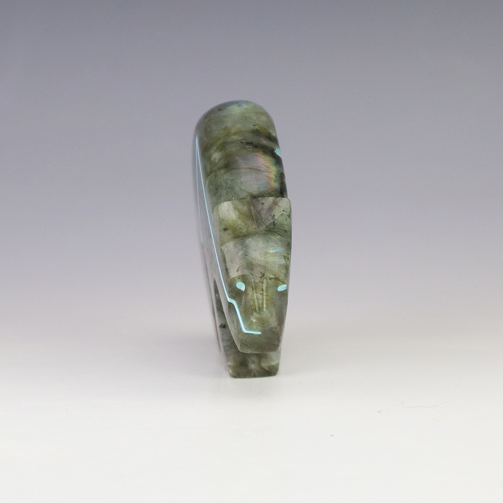 Zuni bear fetishes represent healing and strength. Zuni artist Kenric Laiwakete made this stellar bear fetish. The bear carving is made out of Labradorite and has an inlaid Turquoise heartline. Labradorite is a member of the Feldspar family and is treasured for its remarkable play of color, known as labradorescence. This luminous specimen is filled with hues of blues and greys. Labradorite also has natural fracturing, giving it beauty and character in the stone. It also changes in different lighting and at different angles. (We take photos in a well lit room). This great carving would make a great addition to your Native American art or Zuni fetish collection. Signed