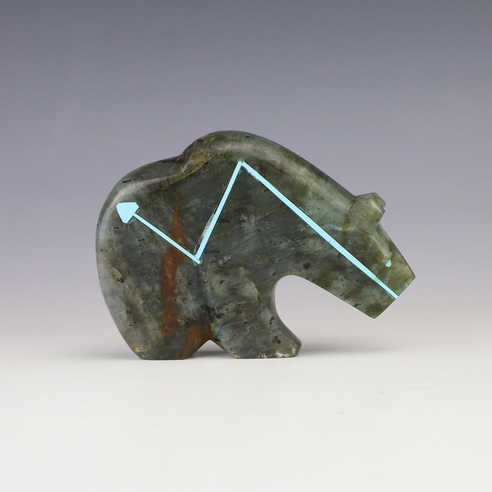 Zuni bear fetishes represent healing and strength. Zuni artist Kenric Laiwakete made this stellar bear fetish. The bear carving is made out of Labradorite and has an inlaid Turquoise heartline. Labradorite is a member of the Feldspar family and is treasured for its remarkable play of color, known as labradorescence. This luminous specimen is filled with hues of blues and greys. Labradorite also has natural fracturing, giving it beauty and character in the stone. It also changes in different lighting and at different angles. (We take photos in a well lit room). This great carving would make a great addition to your Native American art or Zuni fetish collection. Signed