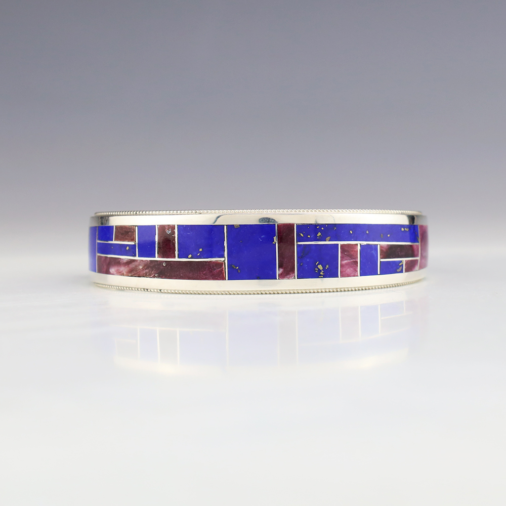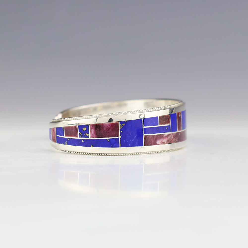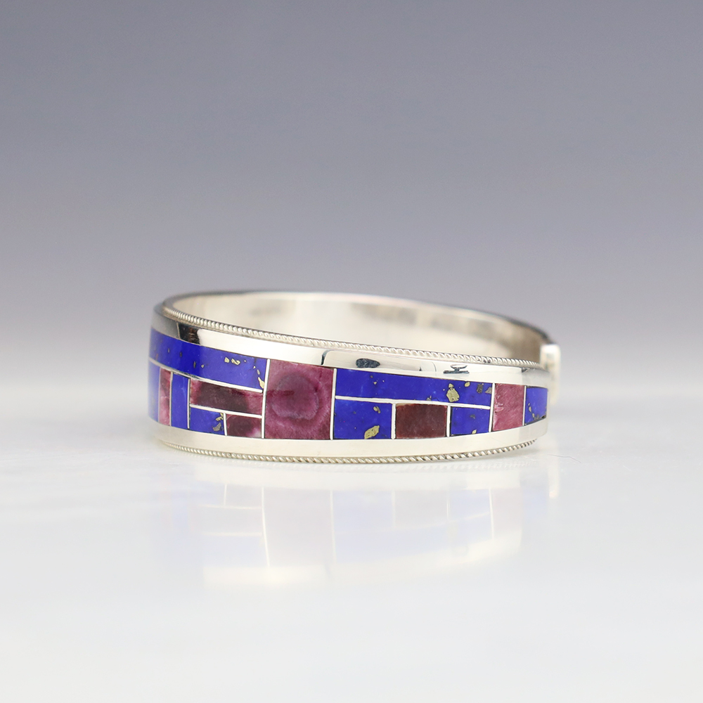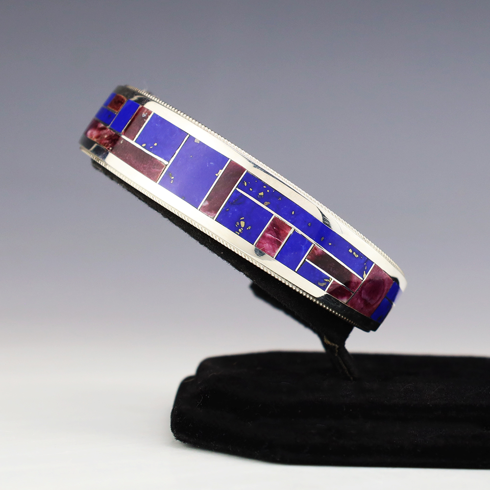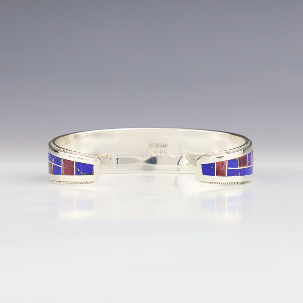 This eye-catching bracelet showcases the remarkable skill of Zuni jewelers, Rickel and Glendora Booqua. Spiny Oyster and Lapis stones inlaid into a sterling silver setting. This beautiful bracelet will be a great addition to your Native American jewelry collection Weighs 28 grams. Signed. The entire inner circumference is about 6 3/4”, including 1 1/8” opening. (Fits a 6 3/4″ wrist). (This bracelet cannot be bent to fit your wrist.)