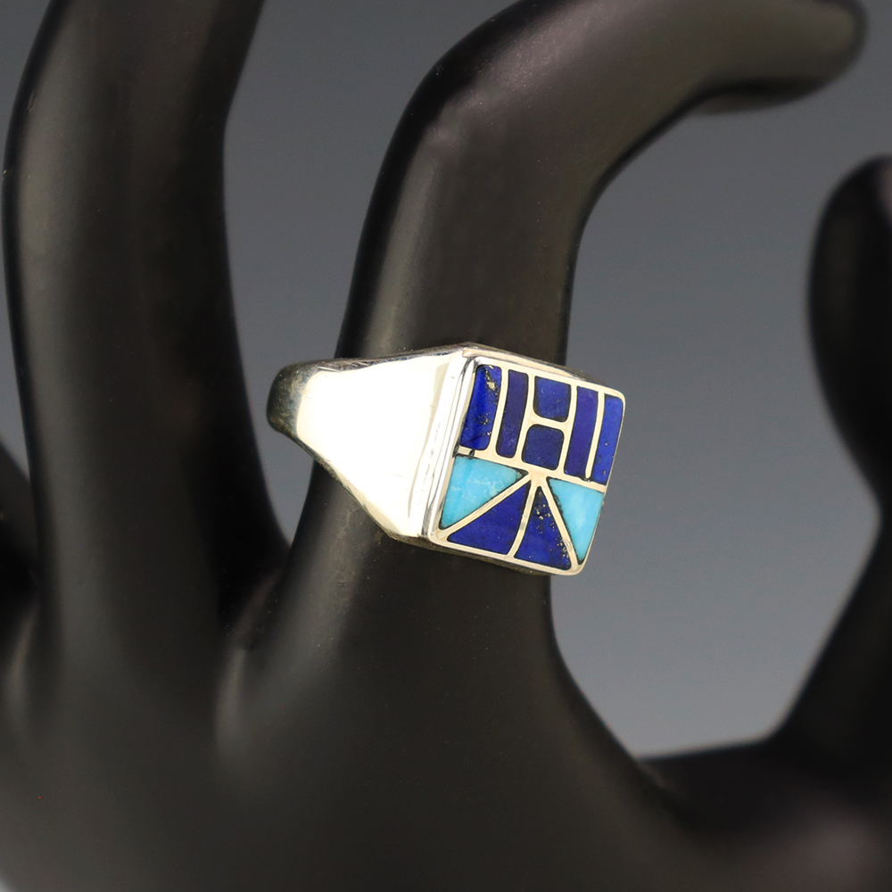 Zuni jewelry makers, Nancy and Sheldon Westika made this magnificent ring. Made out of sterling silver and inlaid with Kingman Turquoise and Lapis. Zuni artists are known for their lapidary work. The Westikas have been making jewelry since the 1970’s and they are known for their fine inlay work. Signed. Weighs 8 grams. Size 8 1/2.