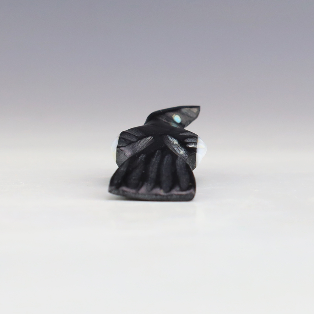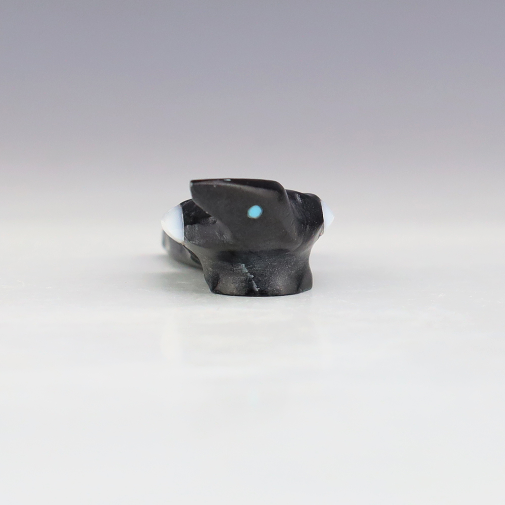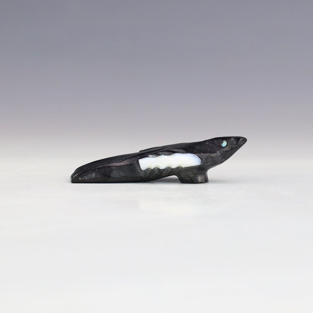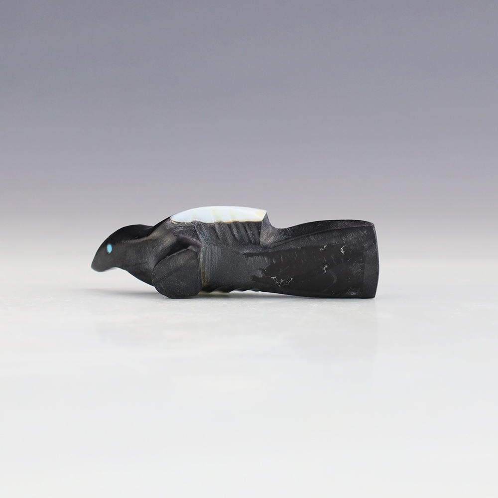 Zuni fetish artist Calvert Bowannie made this magnificent Magpie out of Marble and Mother of Pearl Shell. The magpie’s eyes are made out of Turquoise. A great addition to your Native American or Zuni fetish collection. Signed
