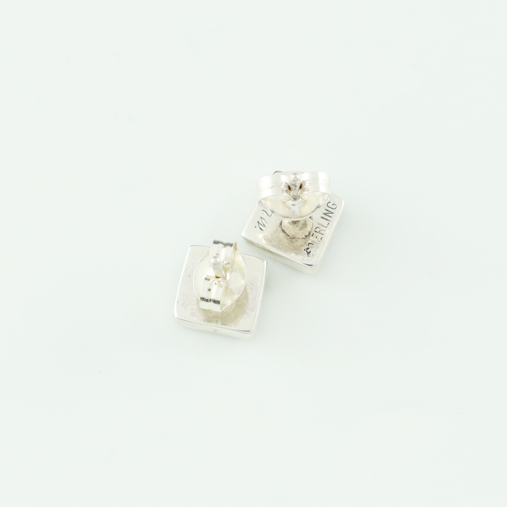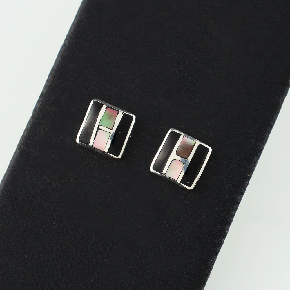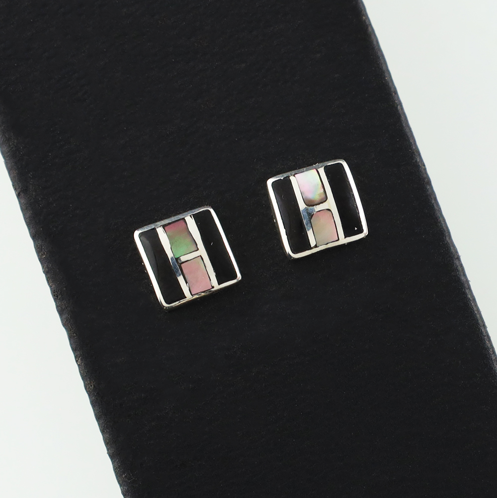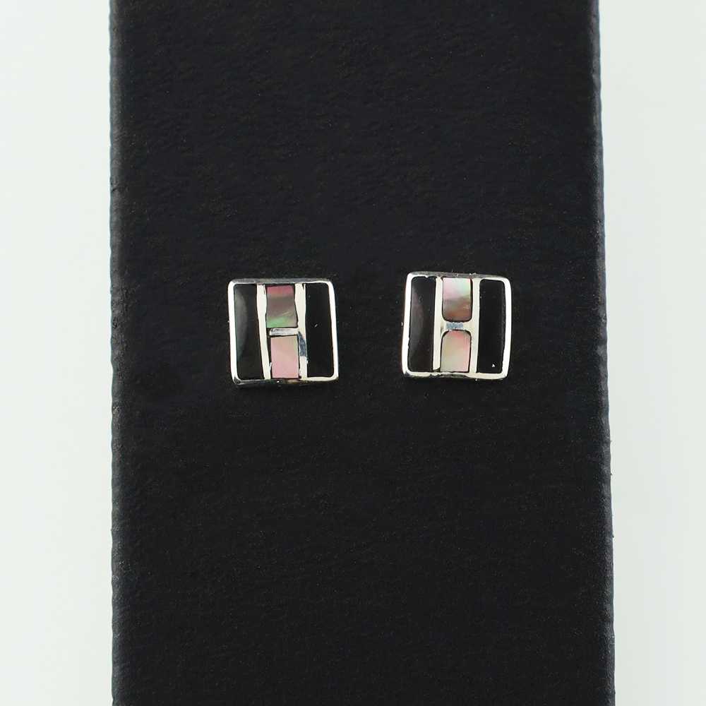 Zuni artists Nancy and Sheldon Westika hand made these exquisite earrings. Made out of sterling silver and inlaid with Mother of Pearl Shell and Jet. Zuni artists are known for their lapidary work. The Westikas have been making jewelry since the 1970’s and they are known for their fine inlay work. Weighs 2 grams. Signed