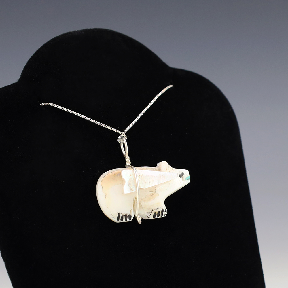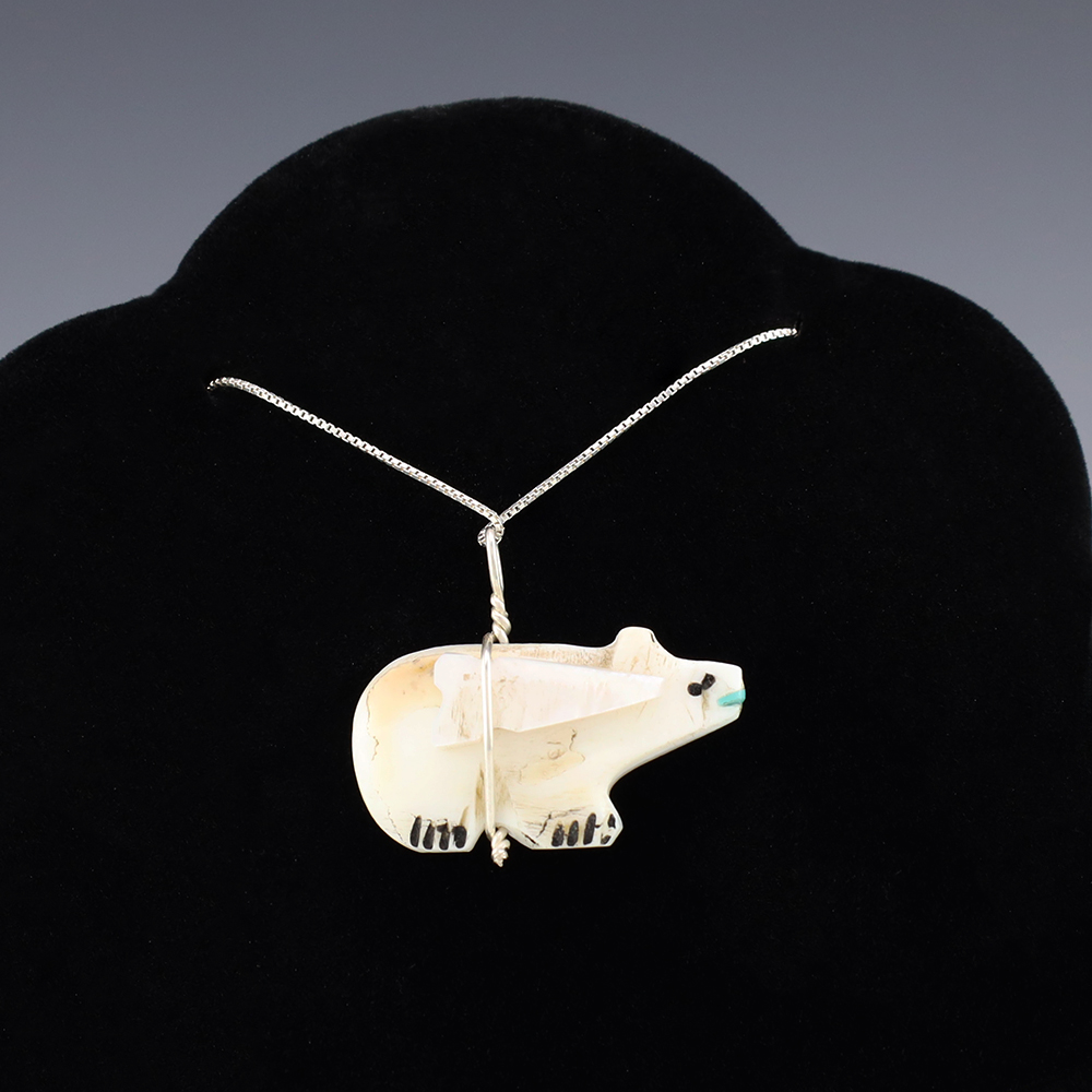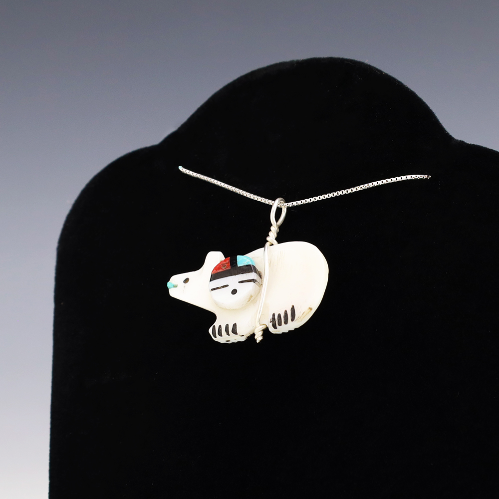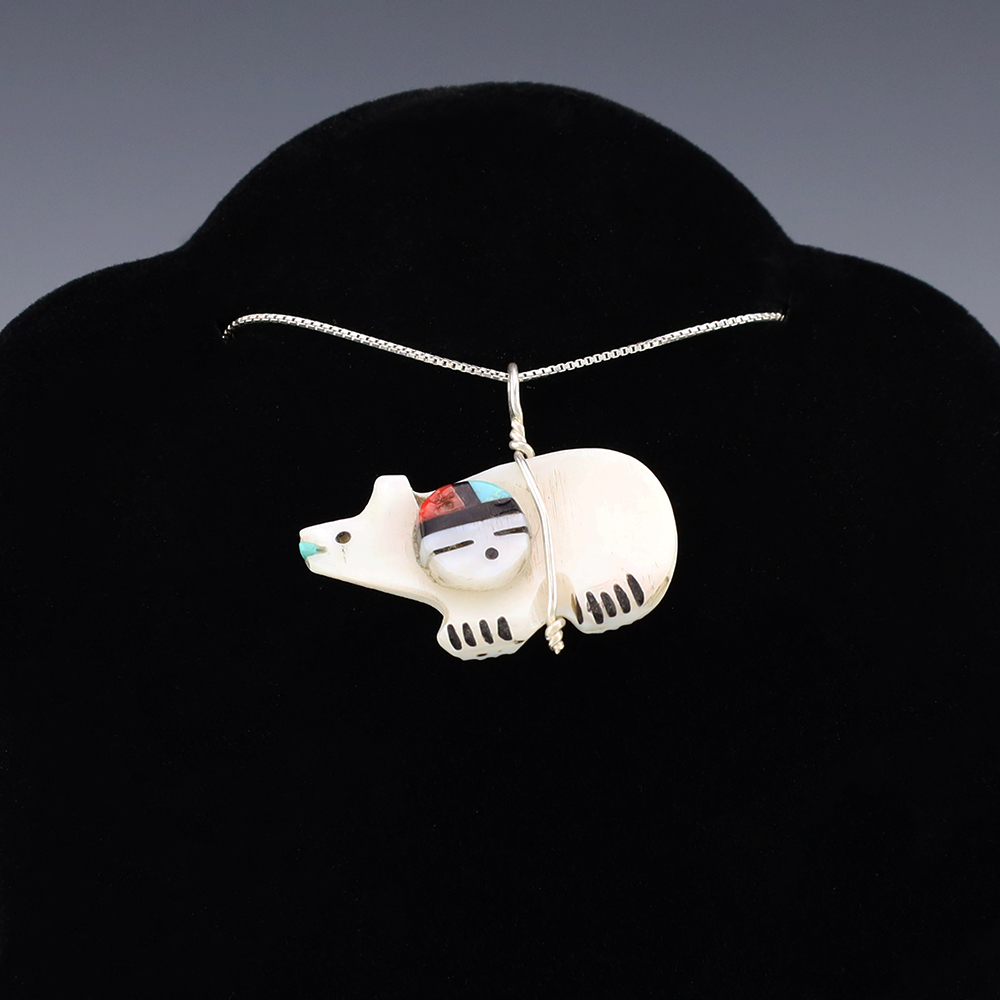 Zuni artist Darrin Boone made this fabulous bear pendant out of Jet, Mother of Pearl Shell, Coral,and Turquoise. This wonderful pendant will become a versatile accessory in your jewelry collection. Weighs 4 grams. (Chain not included)