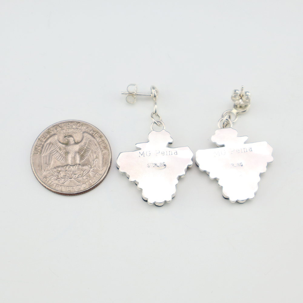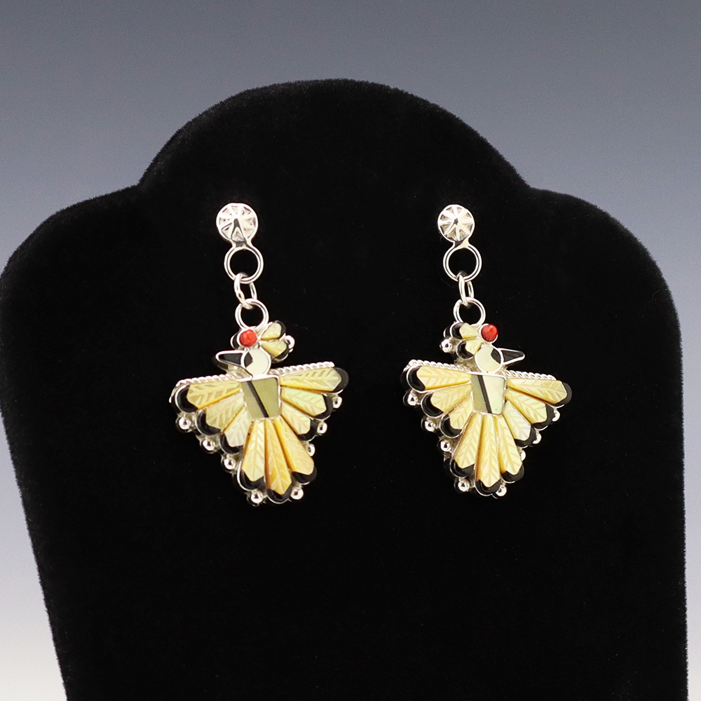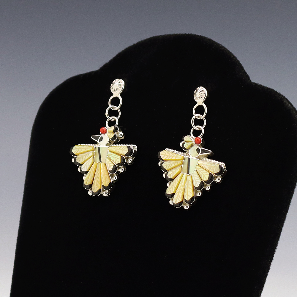 Zuni artist Michelle Peina made these fabulous Thunderbird earrings. Zuni artists are known for their fine lapidary skills. Each stone is hand cut, polished, and set into a sterling silver setting. The earrings are inlaid with Coral, Jet, and Mother of Pearl Shell. Weighs 8 grams. Signed