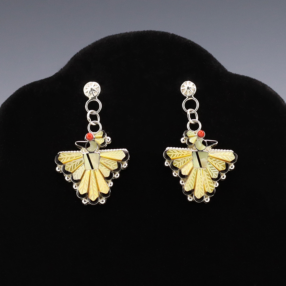 Zuni artist Michelle Peina made these fabulous Thunderbird earrings. Zuni artists are known for their fine lapidary skills. Each stone is hand cut, polished, and set into a sterling silver setting. The earrings are inlaid with Coral, Jet, and Mother of Pearl Shell. Weighs 8 grams. Signed