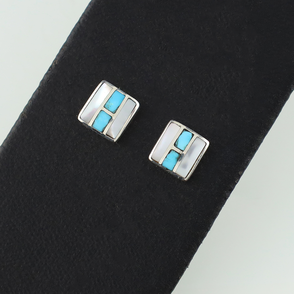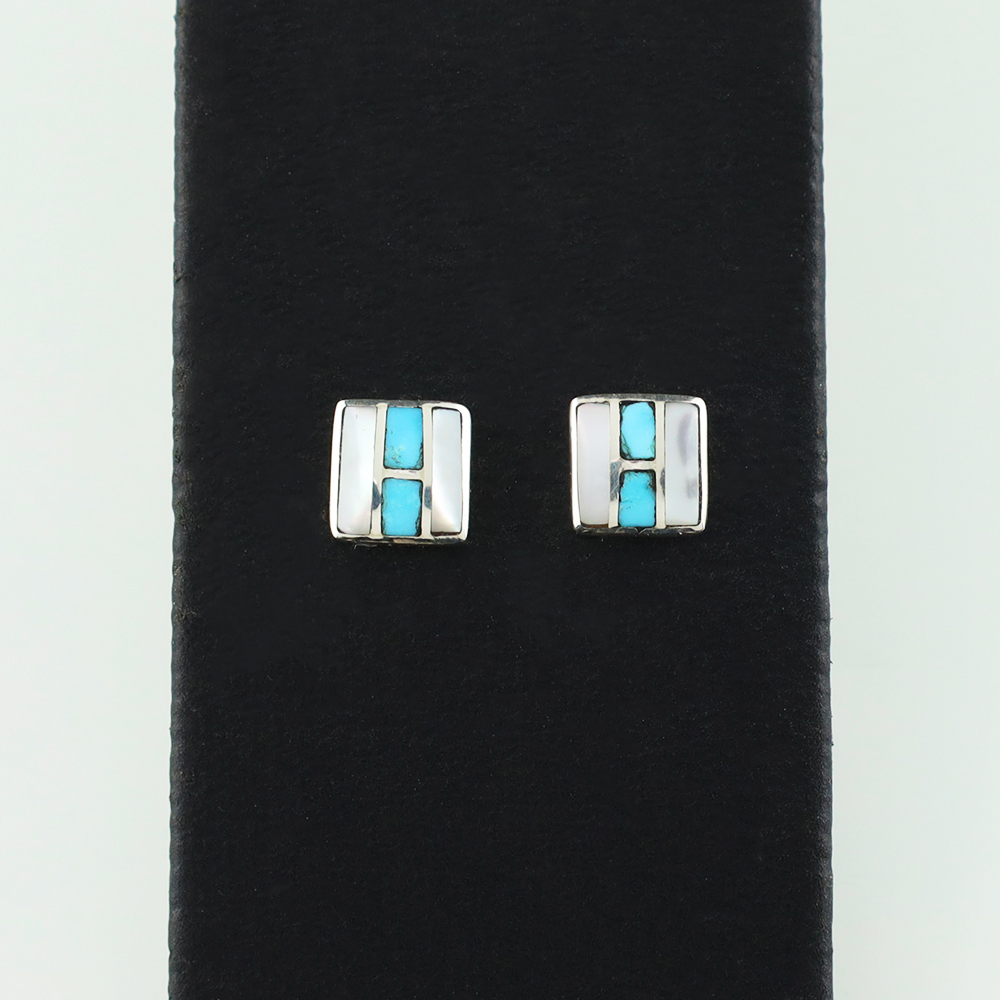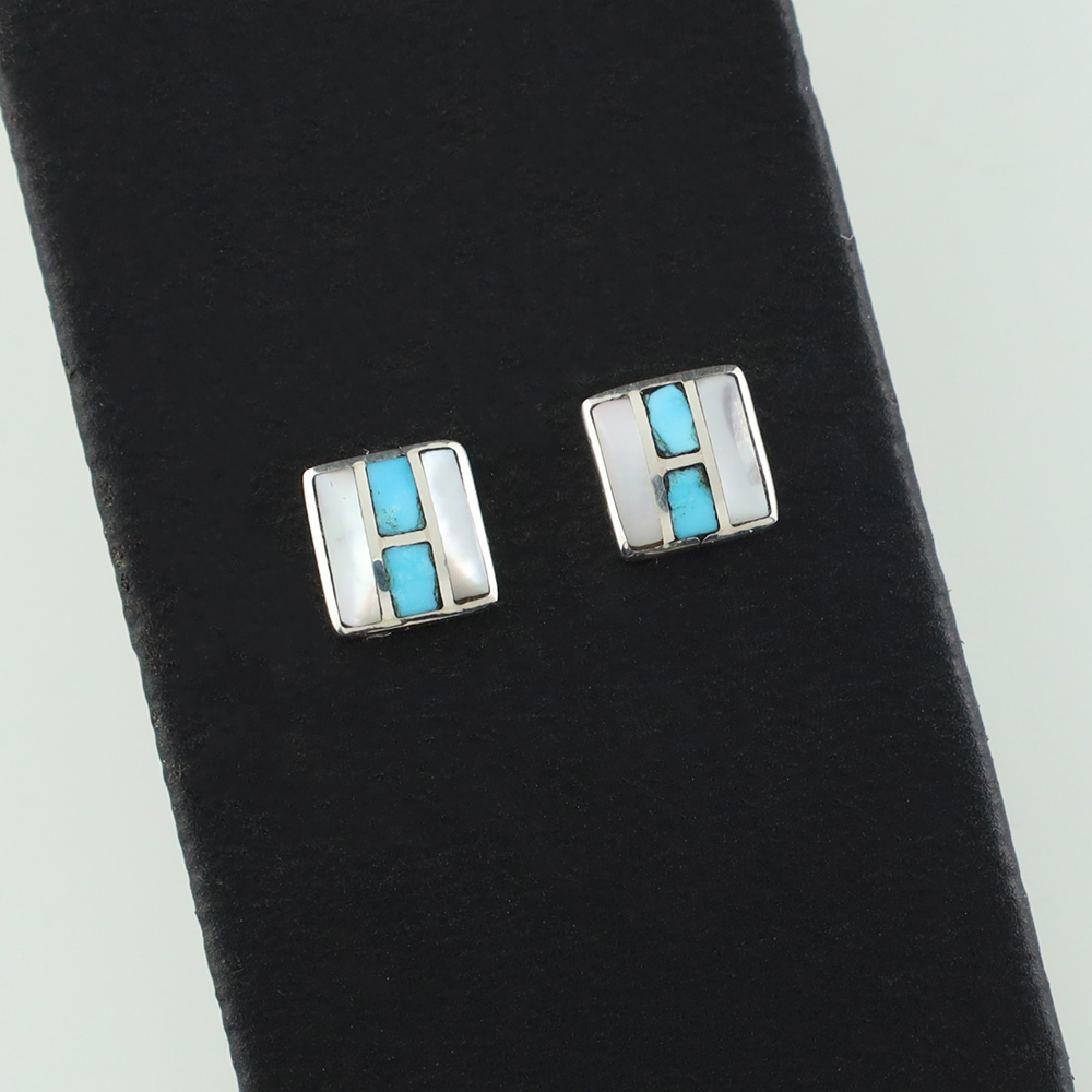 Zuni artists Nancy and Sheldon Westika hand made these exquisite earrings. Made out of sterling silver and inlaid with Kingman Turquoise and Mother of Pearl Shell. Zuni artists are known for their lapidary work. The Westikas have been making jewelry since the 1970’s and they are known for their fine inlay work. Weighs 2 grams. Signed