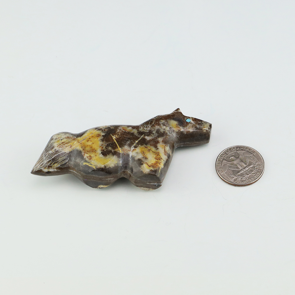 The Horse represents strength, swiftness, and possesses healing powers. Zuni artists Leland Boone and Daphne Quam hand carved this stellar horse fetish. The carving is made out of Nutria Stone with Turquoise eyes. (note-there is natural fracturing in the stone)