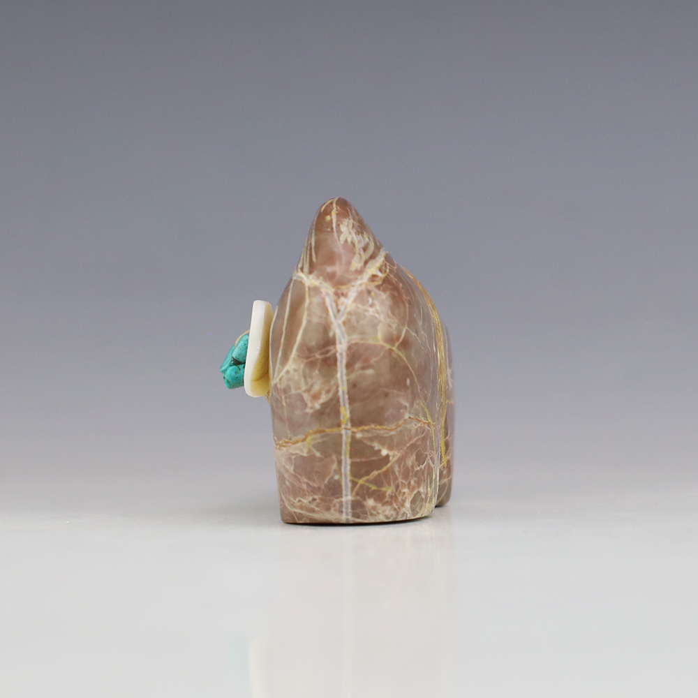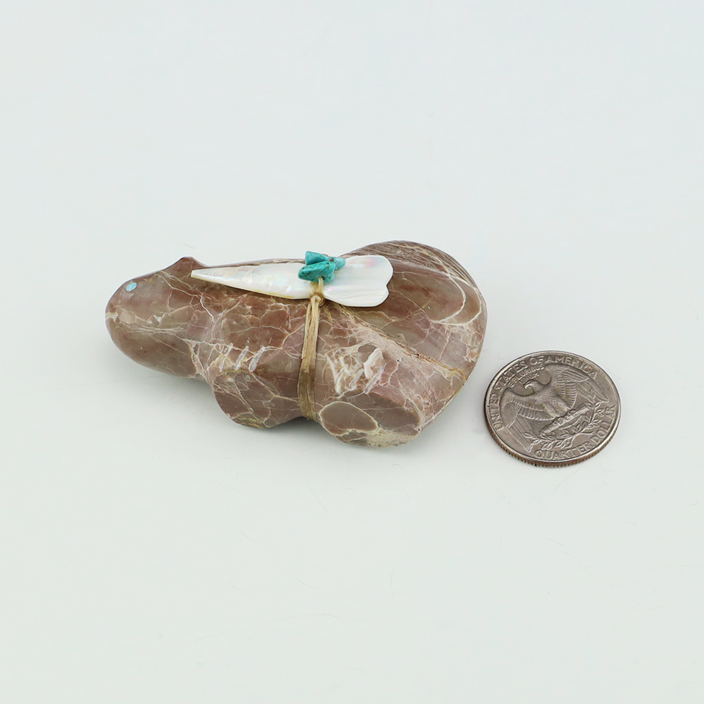 Zuni fetish artists Leland Boone and Daphne Quam hand crafted this wonderful mountain lion out of Nutria Stone and bundled it with Mother of Pearl and Turquoise. Zuni mountain lion fetishes represent leadership and resourcefulness. A great addition to your Native American or Zuni fetish collection. (note-there is natural fracturing in the stone)