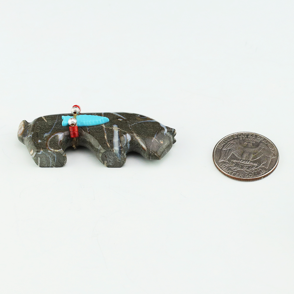 Zuni fetish carver, Brian Yatsattie made this stellar bear. Hand carved out of Fordite. The bear is considered Guardian of the West by the Zuni, and they represent strength, courage, and healing and protection. Signed. 3 1/2” tall x 1 5/8” long x 7/8” wide Artist card included Zuni fetishes...