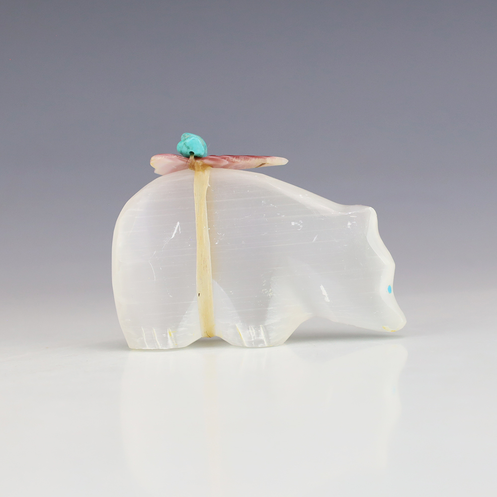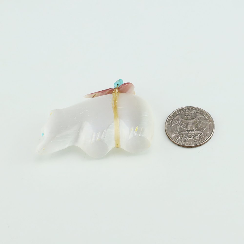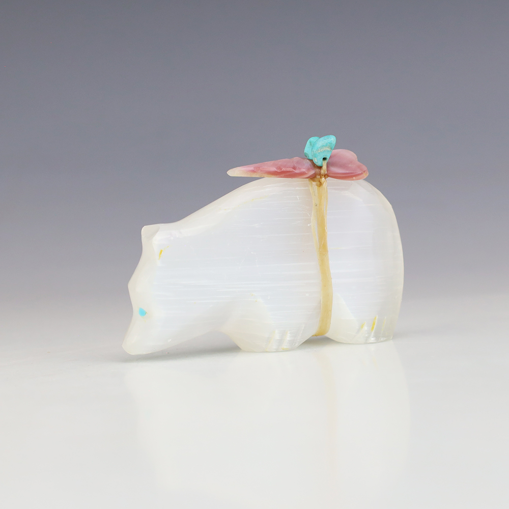 Zuni fetish carvers Leland Boone and Daphne Quam made this wonderful bear fetish out of Selenite and is bundled with Turquoise and Pink Mussel. The Bear is the Guardian fetish of the West, and represents healing and strength. A great addition to your Native American or Zuni fetish collection. (note-there is natural pitting in the stone)