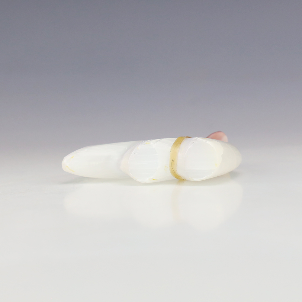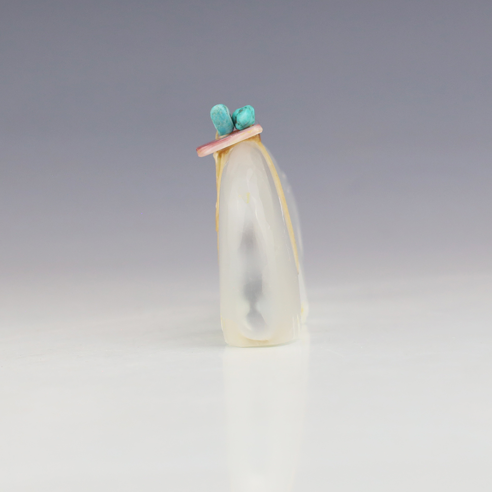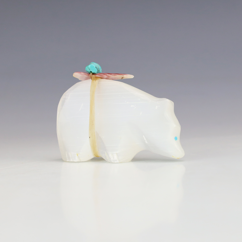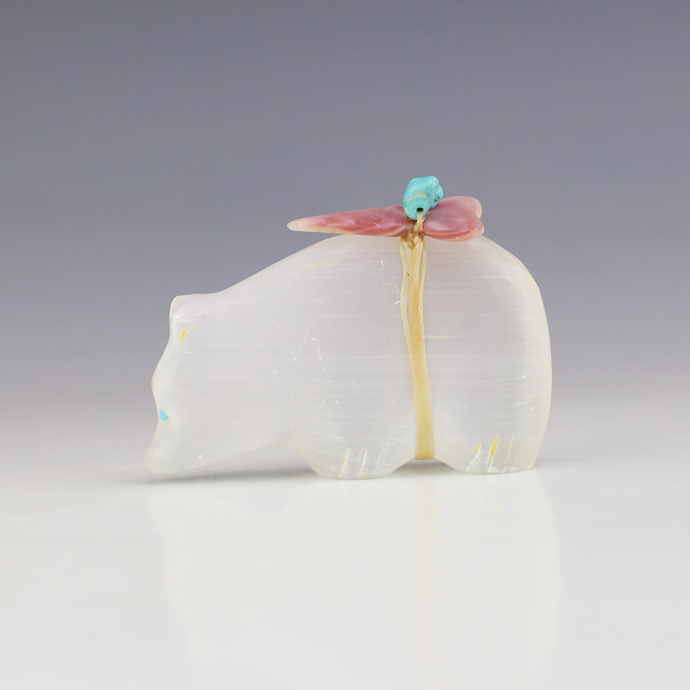 Zuni fetish carvers Leland Boone and Daphne Quam made this wonderful bear fetish out of Selenite and is bundled with Turquoise and Pink Mussel. The Bear is the Guardian fetish of the West, and represents healing and strength. A great addition to your Native American or Zuni fetish collection. (note-there is natural pitting in the stone)