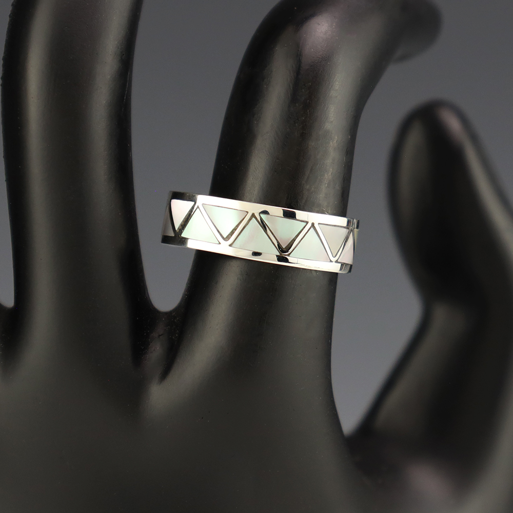 Zuni artists are known for their fine lapidary skills. Each stone is hand cut, polished, and set into a sterling silver setting. The ring is set with Green Snail Shell Hand made by Zuni artist Charlene Sice. Weighs 4 grams. Size 8 1/2. Signed