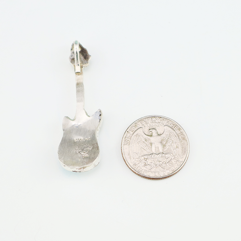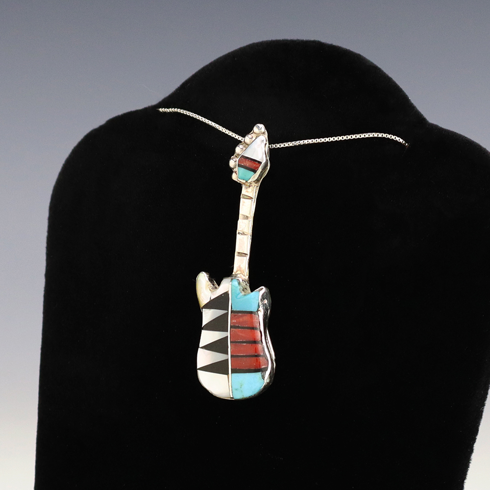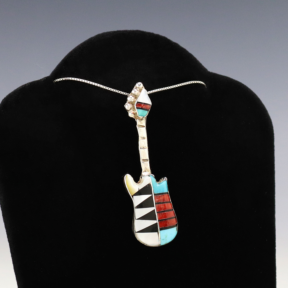 Stellar guitar pendant that features Turquoise, Coral, Jet, and Mother of Pearl Shell inlaid in a sterling silver setting. Hand made by Ola Eriacho from the Zuni Pueblo. Weighs 4 grams. Signed (Chain not included)