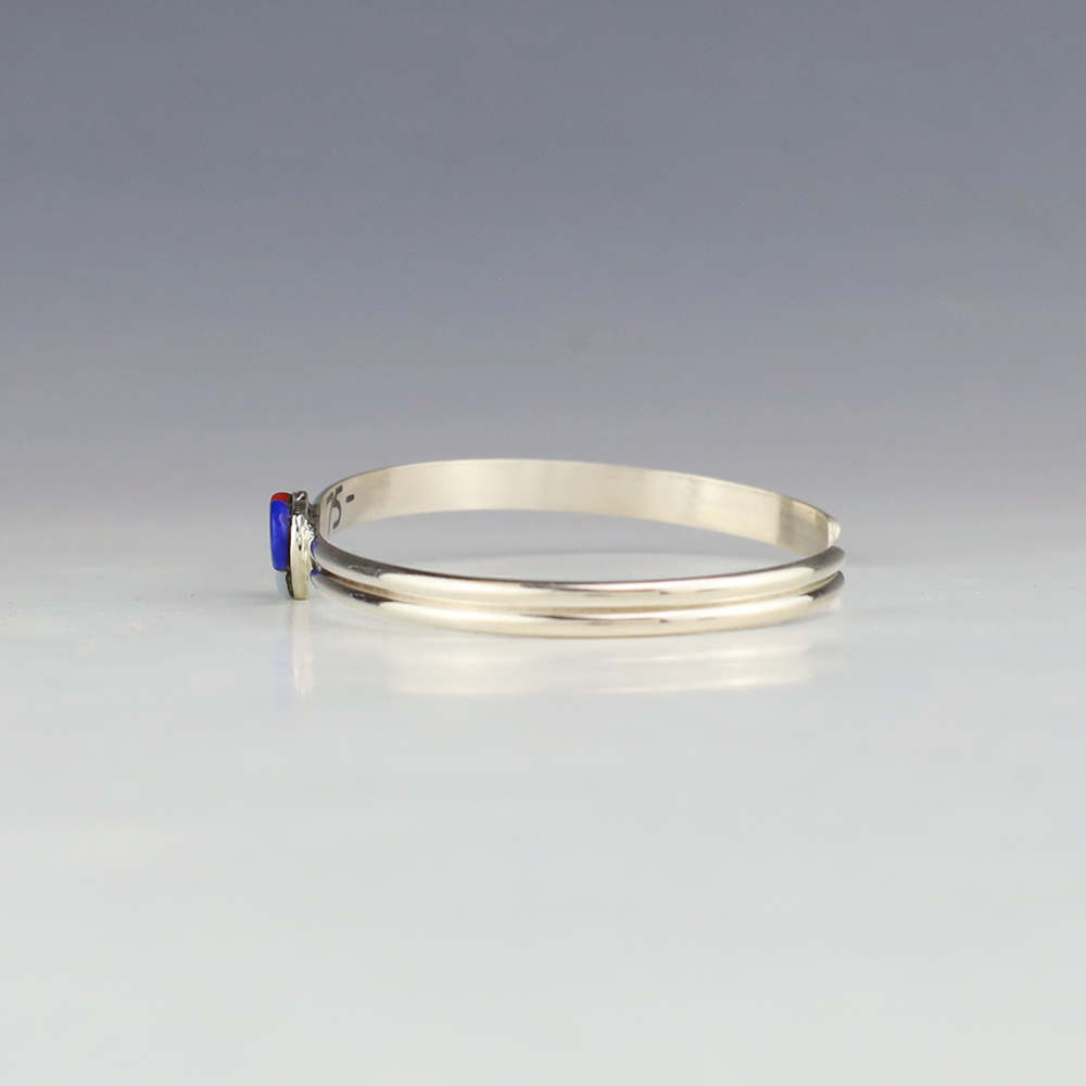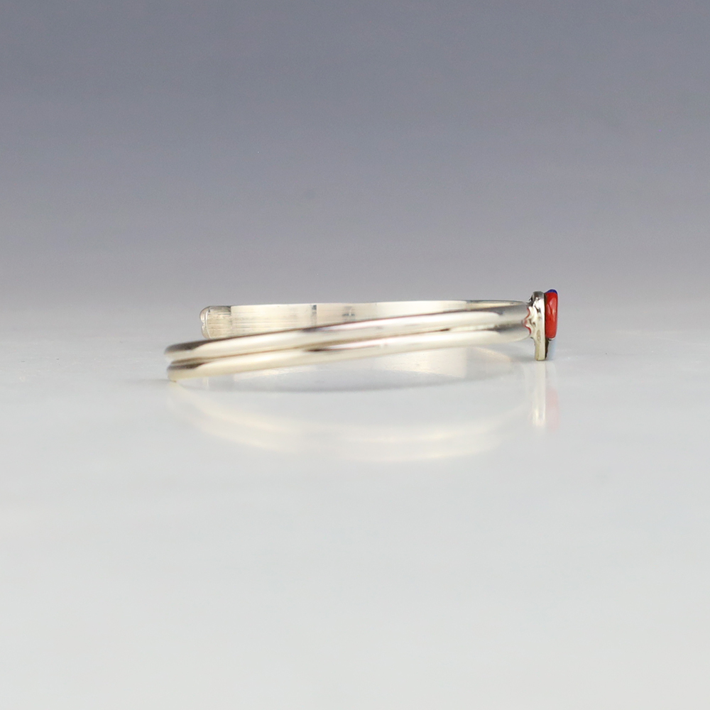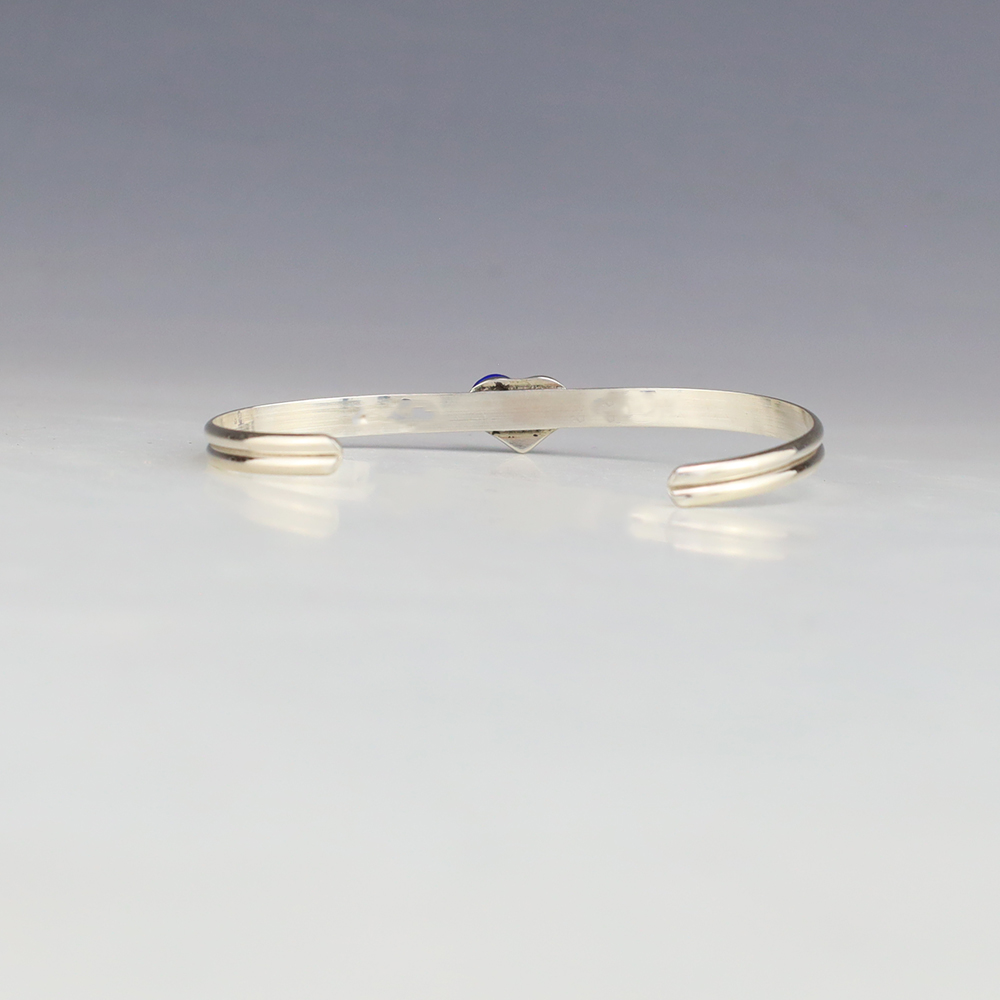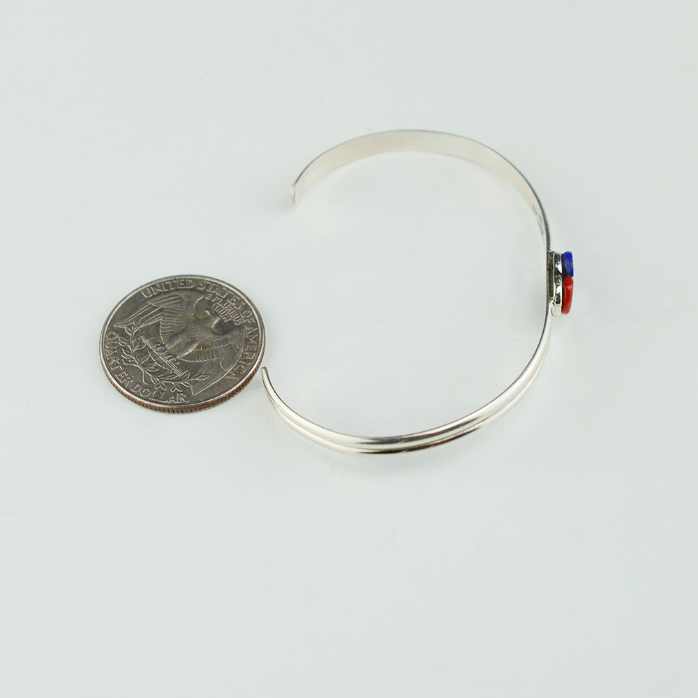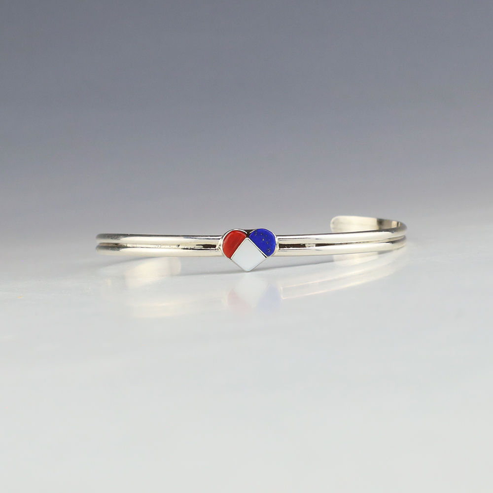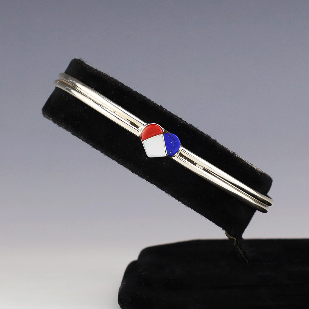 Zuni artist Linda Chavez made this lovely heart bracelet. Zuni artists are known for their fine lapidary skills. Each stone is hand cut, polished, and set into a sterling silver setting. This lovely bracelet is sterling silver and inlaid with Lapis, Mother of Pearl Shell, and Coral. Weighs 6 grams.