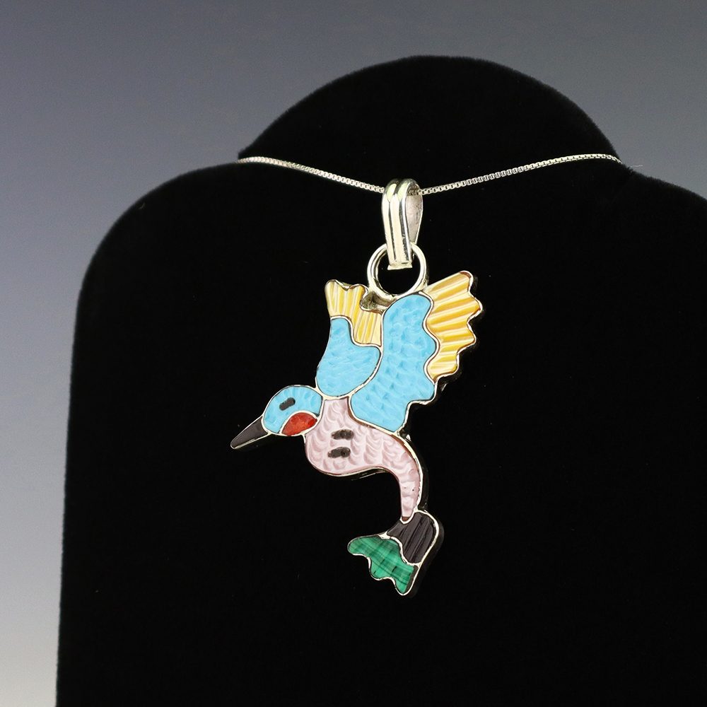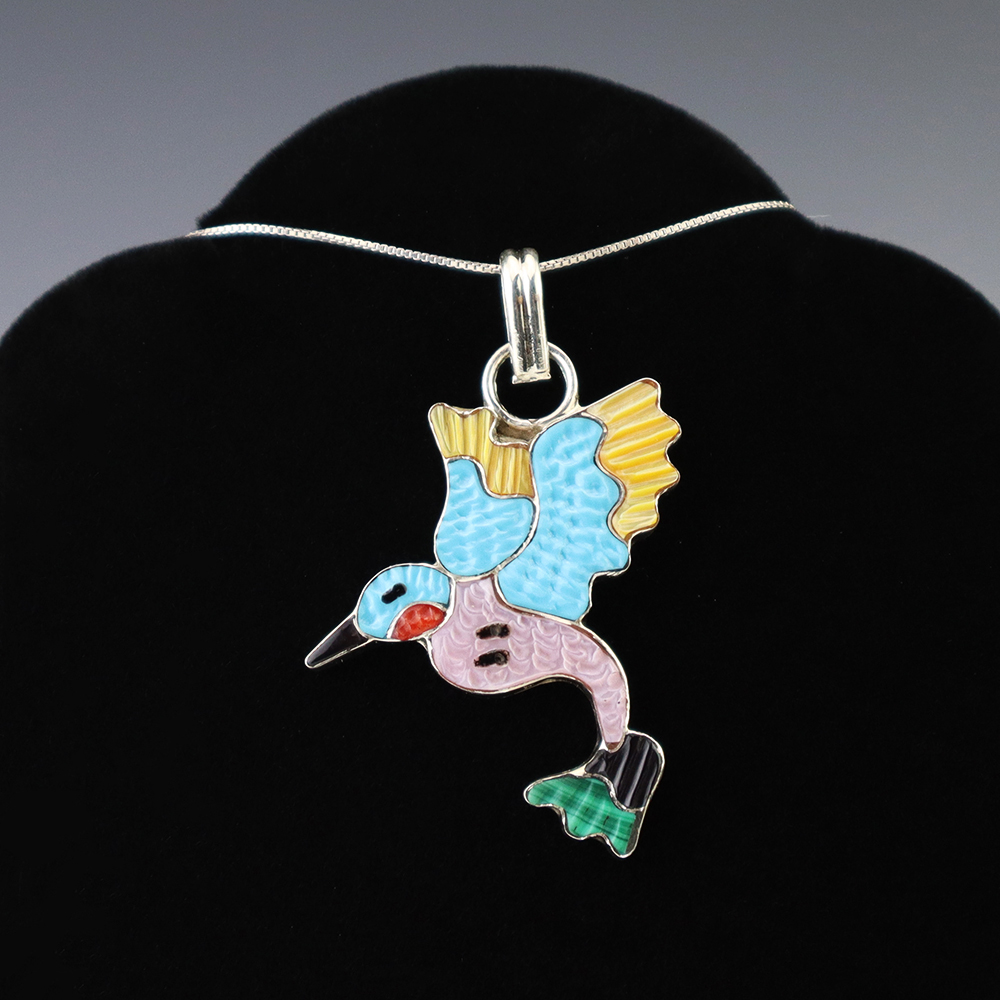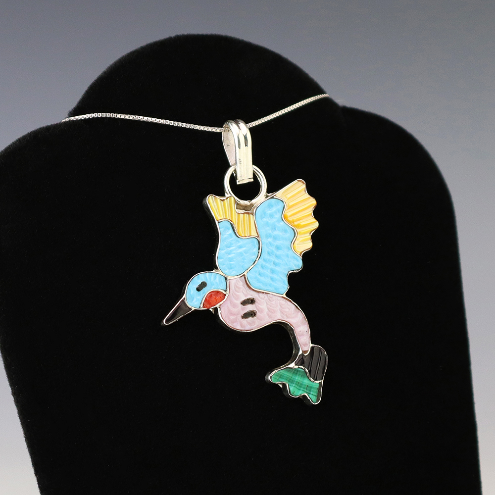 Zuni artist Tamara Pinto made this beautiful Hummingbird pendant. Zuni artists are known for their fine lapidary skills. Each stone is hand cut, polished, and set into a sterling silver setting. The pendant is inlaid with Turquoise, Jet, Coral, Pink Mussel, Malachite, and Mother of Pearl Shell. Weighs 6 grams. Signed. (Chain not included)
