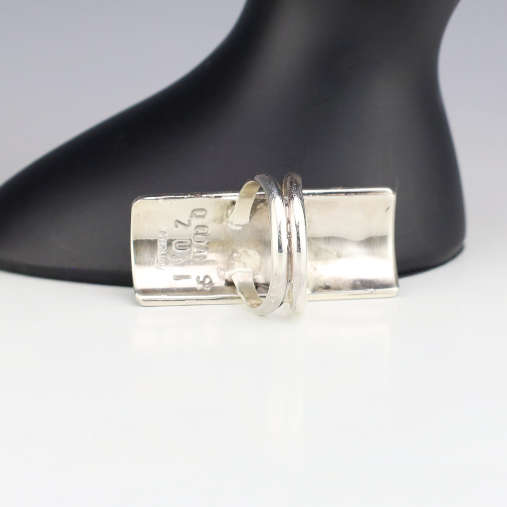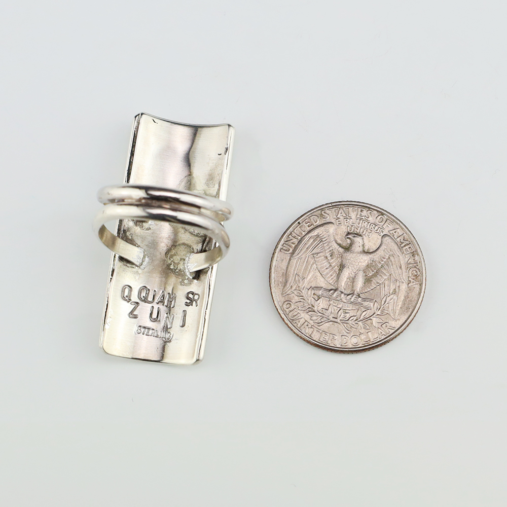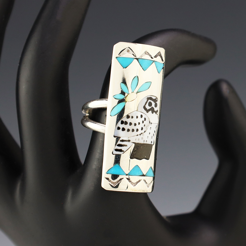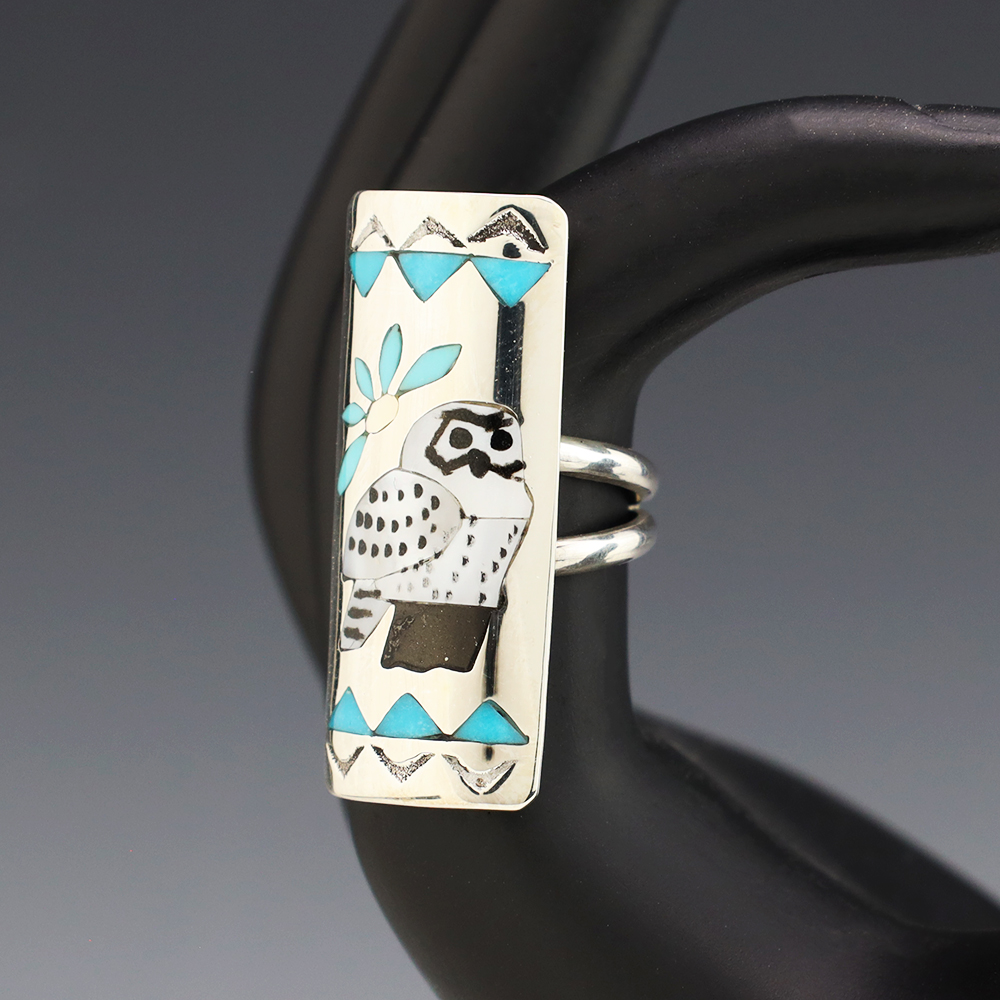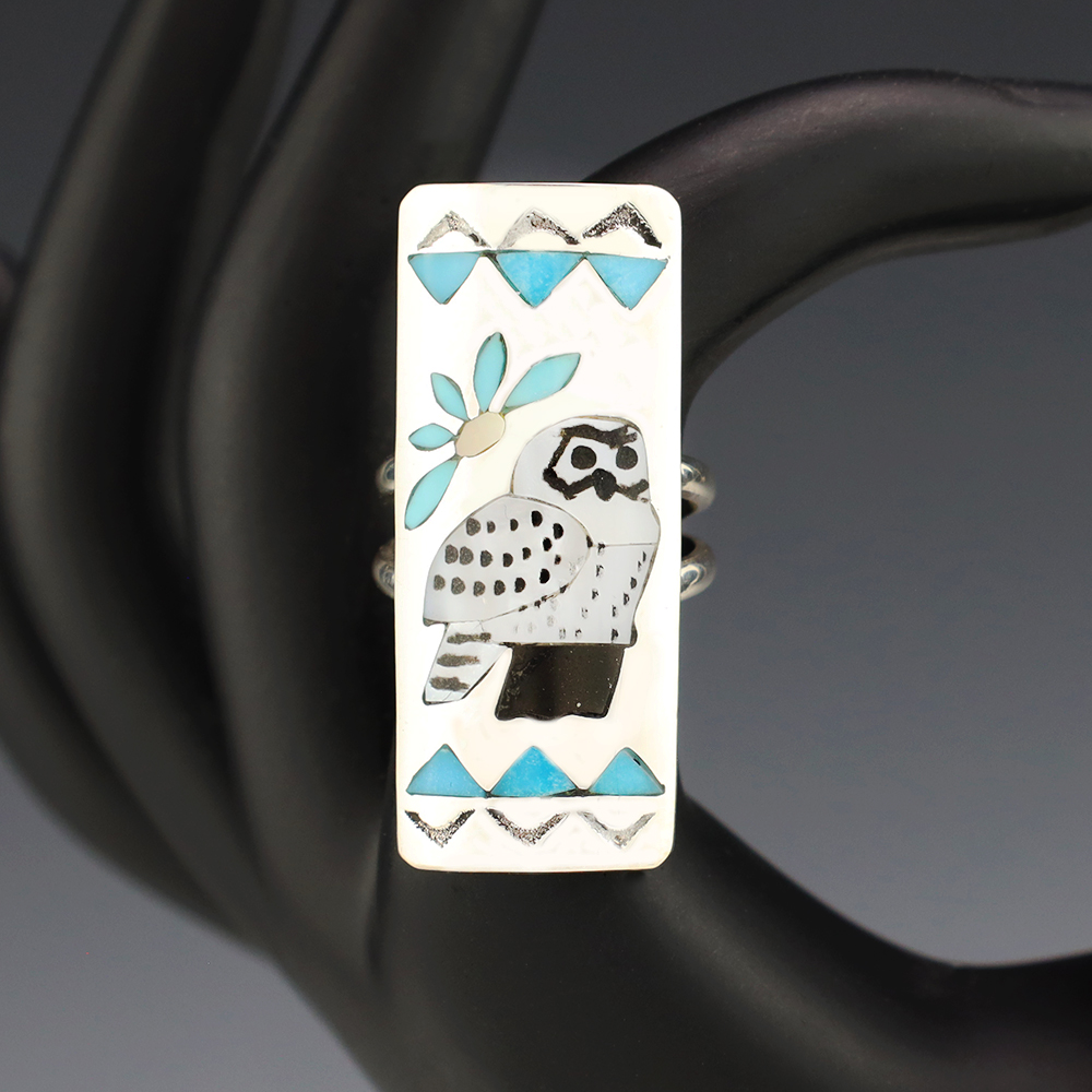 Zuni jeweler Quintin Quam made this wonderful Owl ring. Zuni artists are known for their fine lapidary skills. Each stone is hand cut, polished, and set into a sterling silver setting. The ring is inlaid with Turquoise, Penn Shell, Mother of Pearl Shell, and Jet. Weighs 10 grams. Size 7. Signed