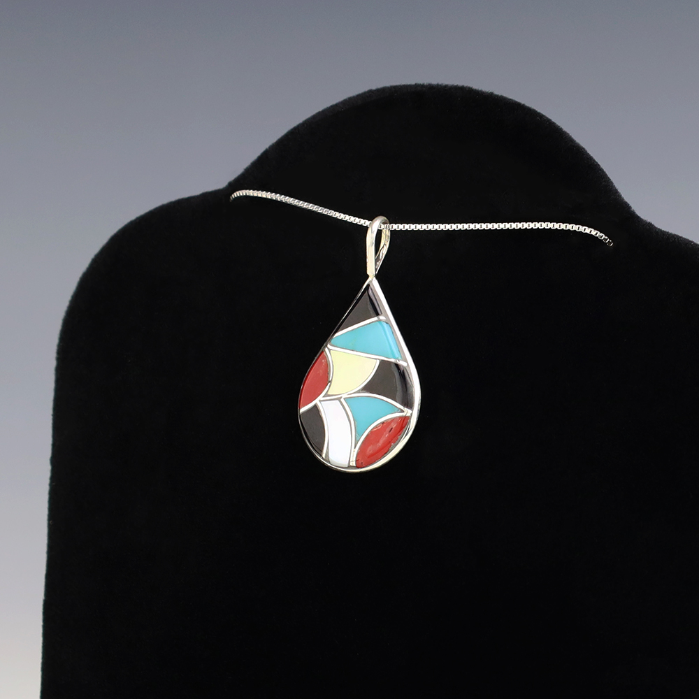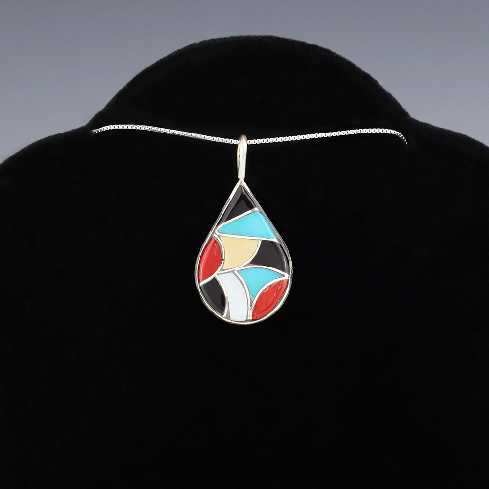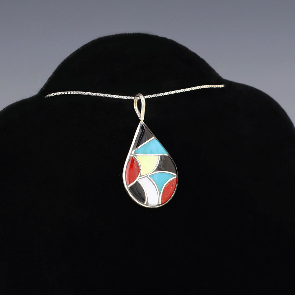Zuni artist Delorna Lahi hand made this wonderful pendant. Made out of sterling silver and inlaid with Turquoise, Coral, Mother of Pearl, and Jet. Weighs 2 grams. Signed. (Chain not included)