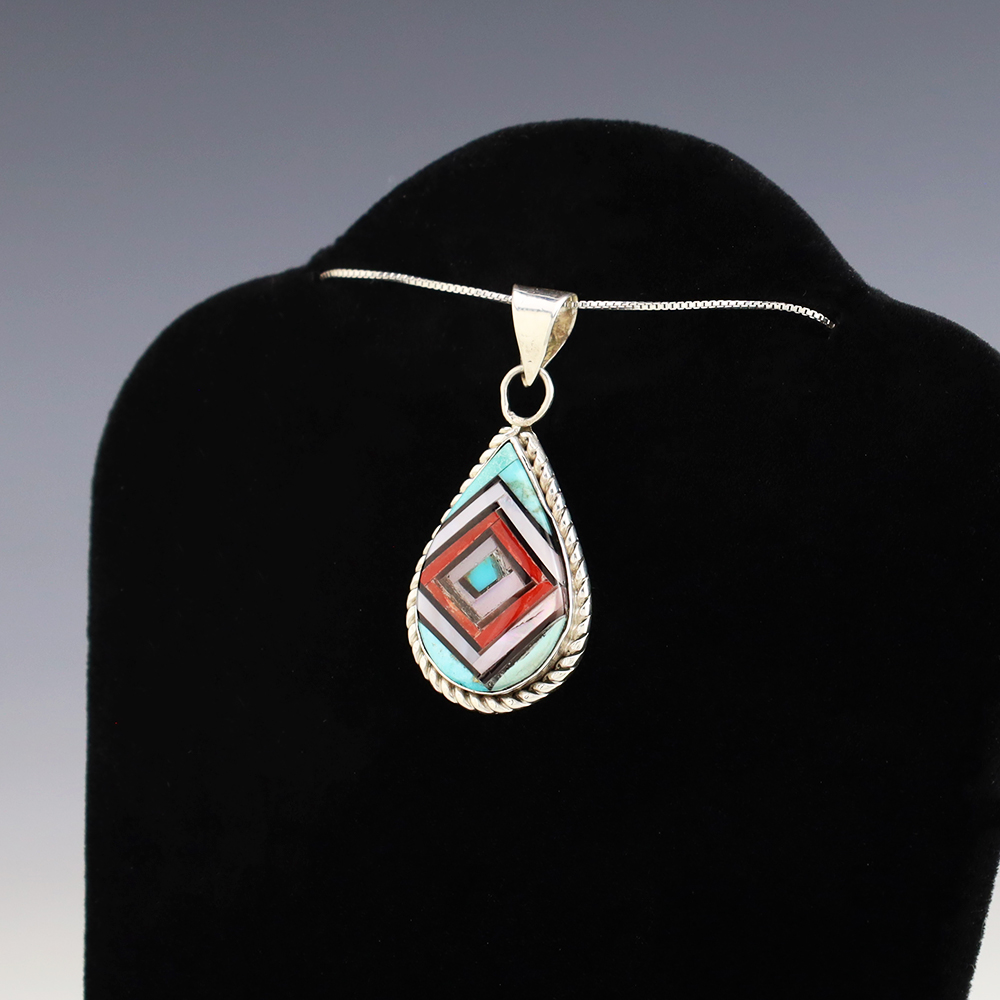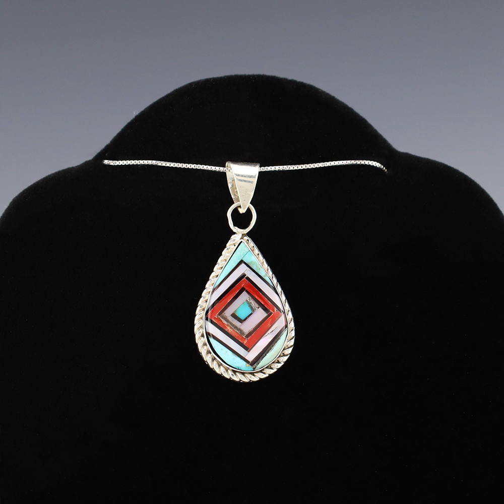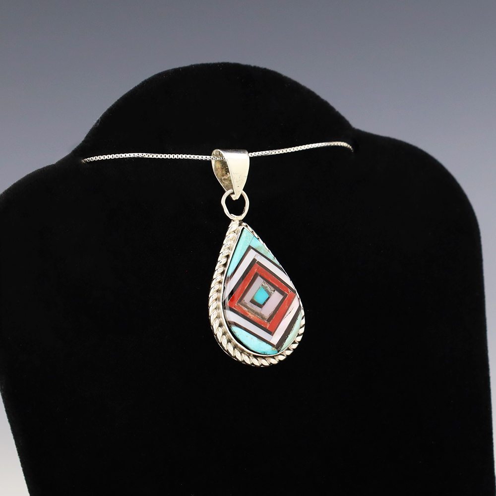 Zuni artists are known for their fine lapidary skills. This cross pendant is no exception. Zuni artist Vernon Vacit made this pendant out of sterling silver and inlaid it with Turquoise, Pink Mussel, Mother of Pearl Shell, Jet, and Coral. Weighs 4 grams. (Chain not included) Signed.
