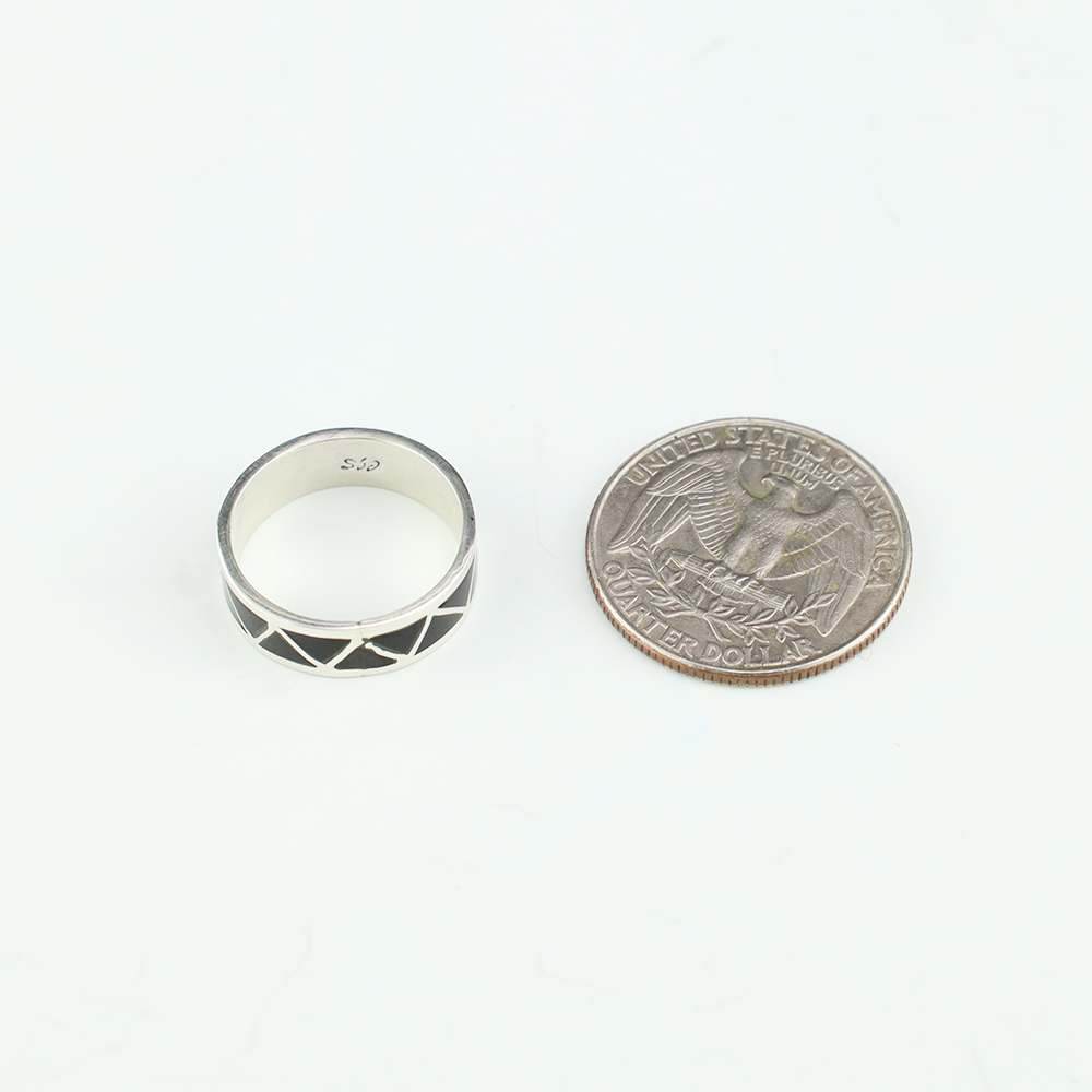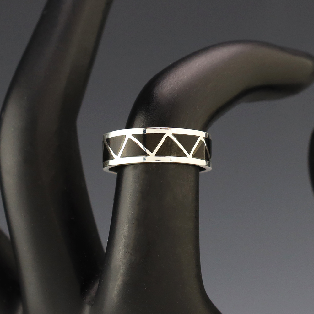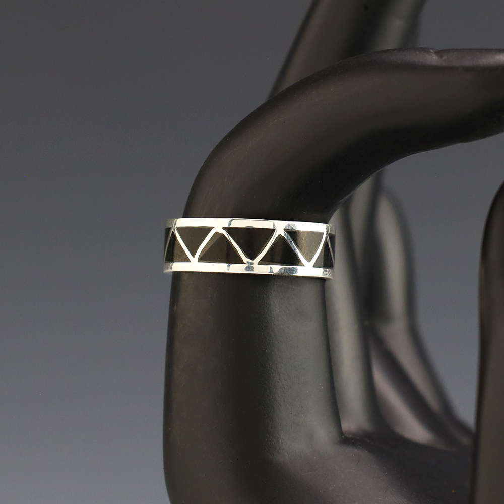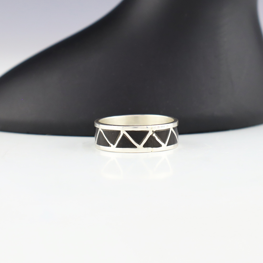 Zuni artists are known for their fine lapidary skills. Each stone is hand cut, polished, and set into a sterling silver setting. The ring is set with Jet stones. Hand made by Zuni artist Charlene Sice. Weighs 4 grams. Size 6. Signed