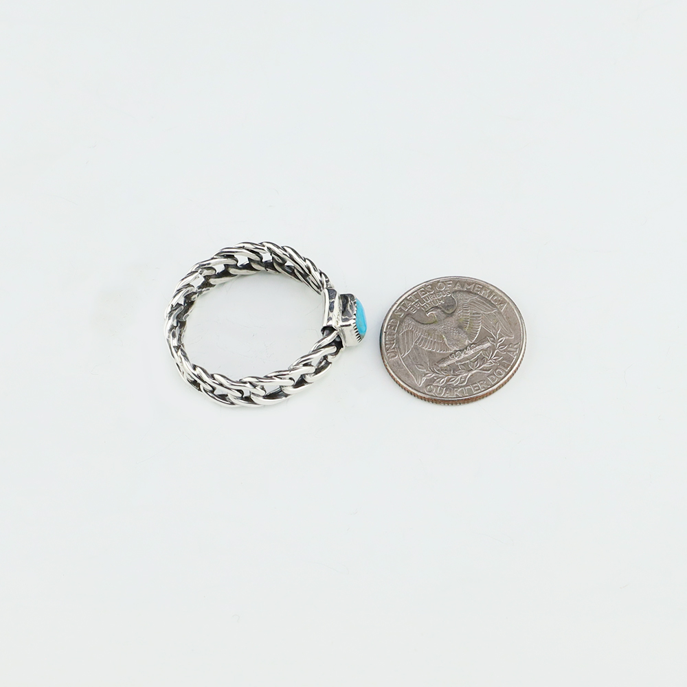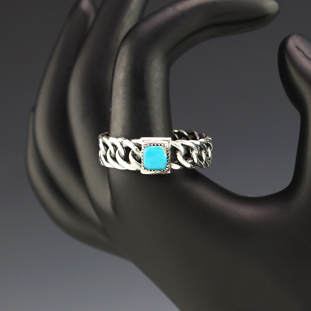 Zuni artist Carlo Lonjose made this marvelous ring. Sterling silver and set with a natural Kingman Turquoise stone. Carlo comes from a family of Zuni jewelers. Weigh 8 grams. Size is 15. Signed.