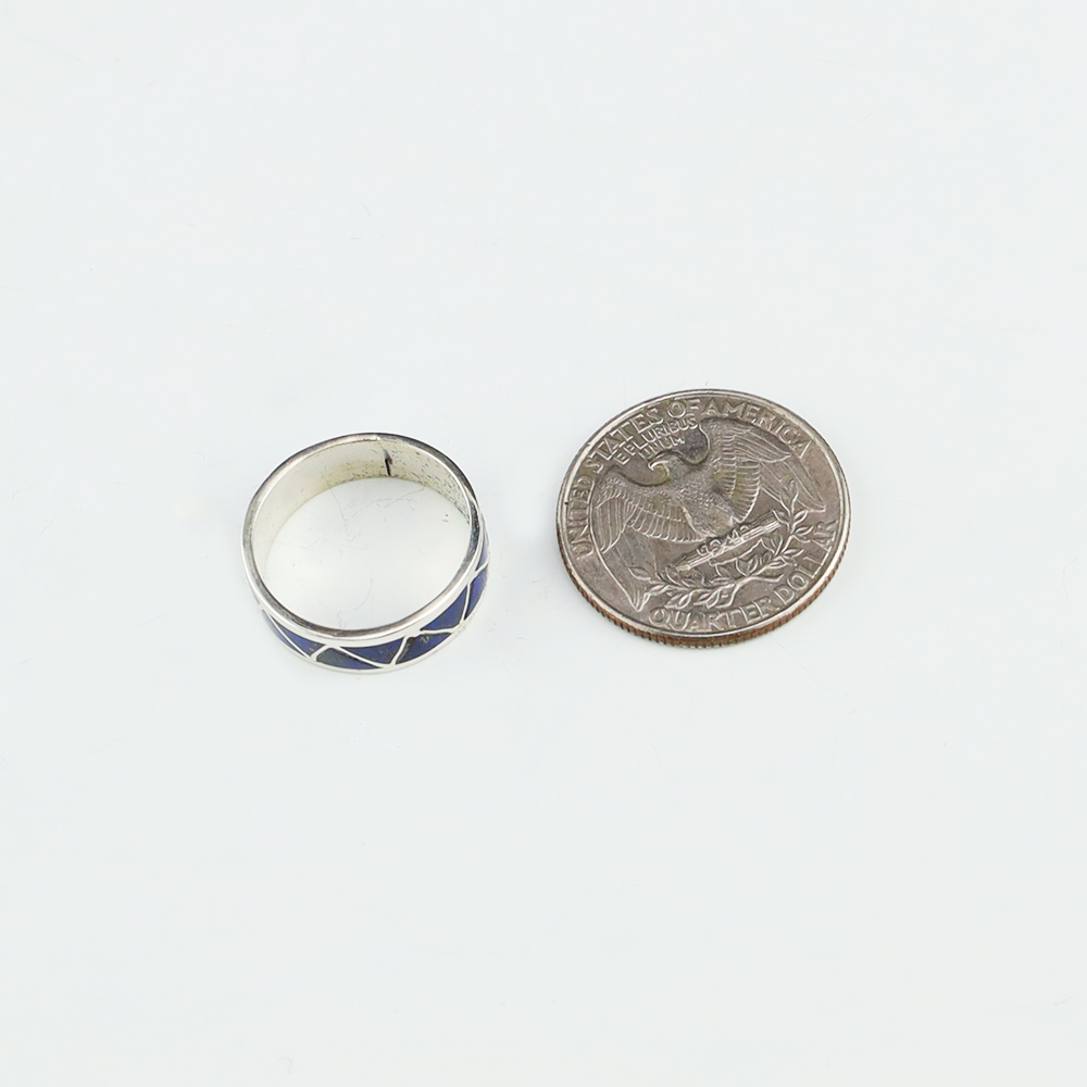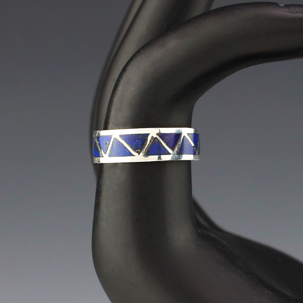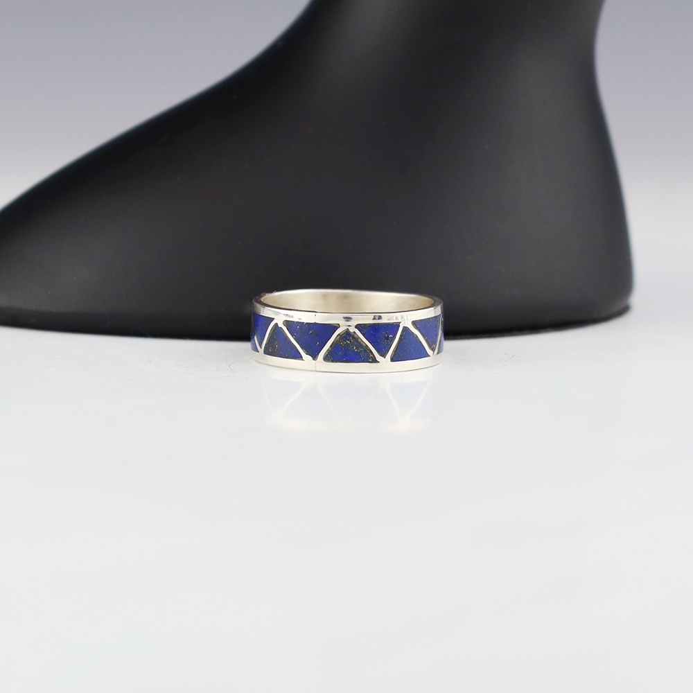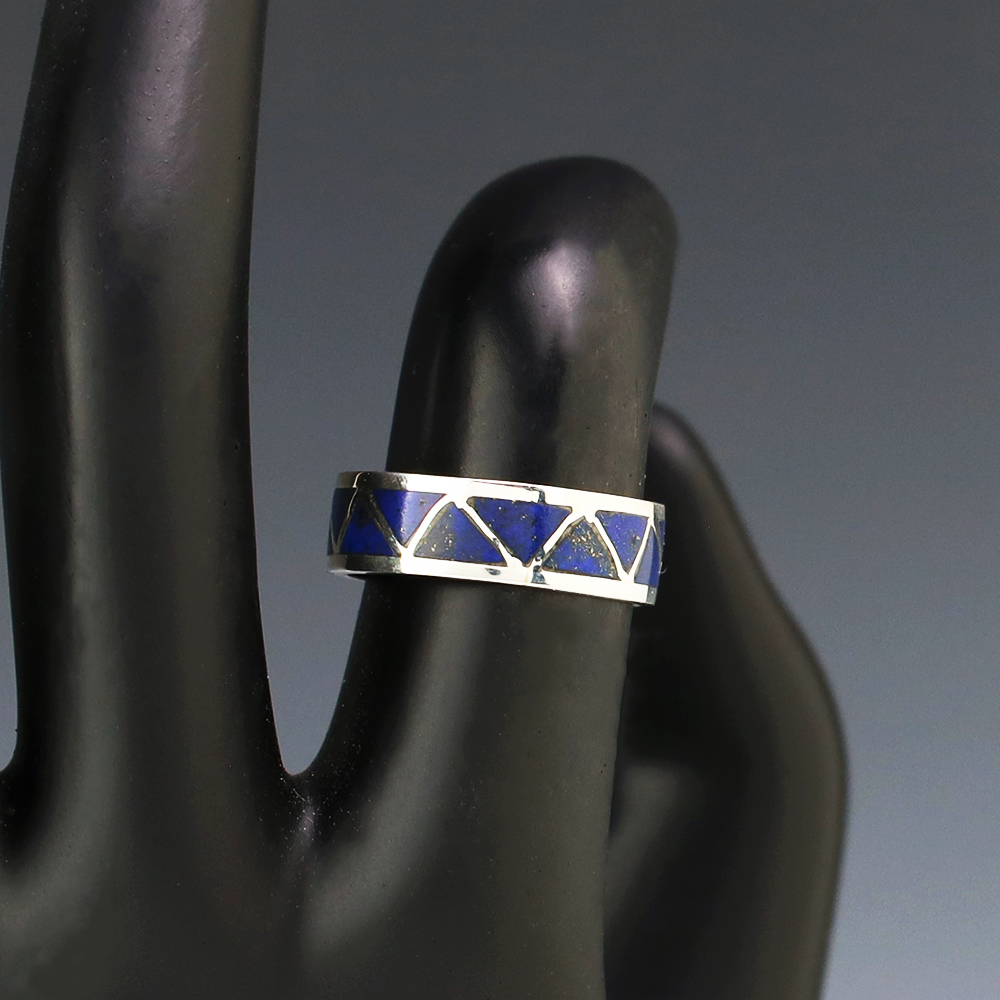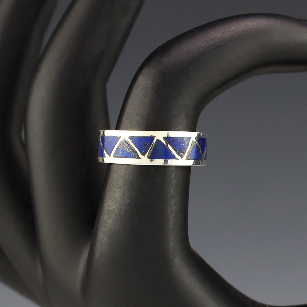 Zuni artists are known for their fine lapidary skills. Each stone is hand cut, polished, and set into a sterling silver setting. The ring is set with Lapis stones. Hand made by Zuni artist Charlene Sice. Weighs 4 grams. Size 7. Signed