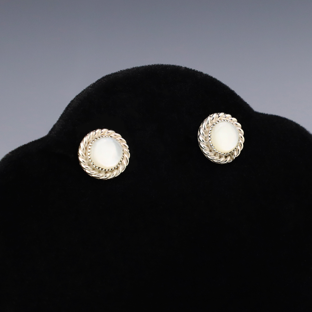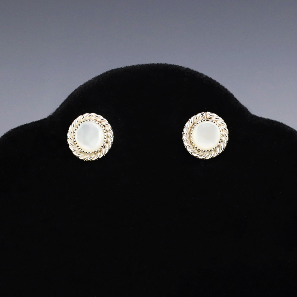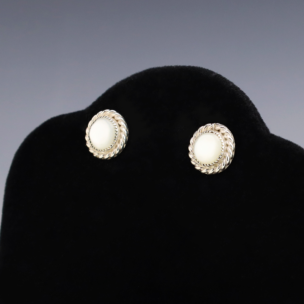 Zuni artist Carlo Lonjose made these beautiful earrings out of sterling silver and Mother of Pearl Shell. These earrings will become a versatile accessory in your jewelry collection. Weighs 4 grams. Signed