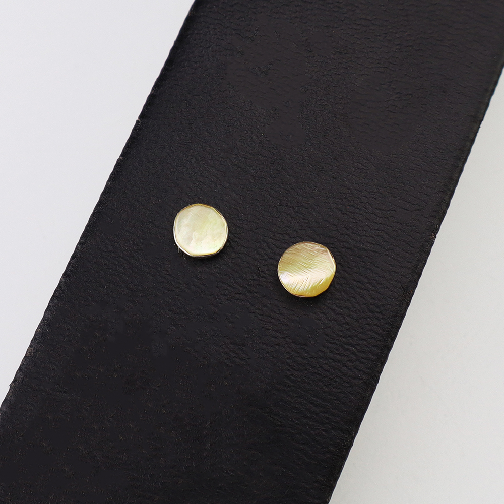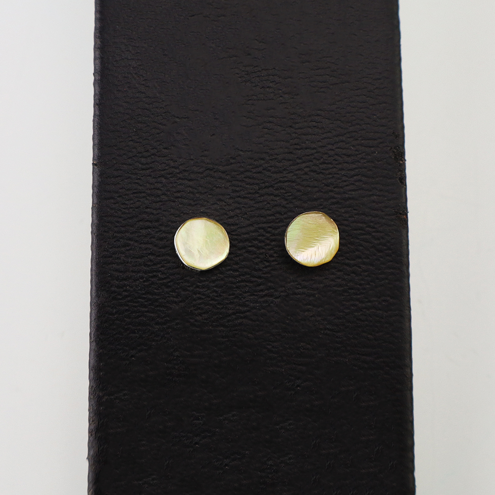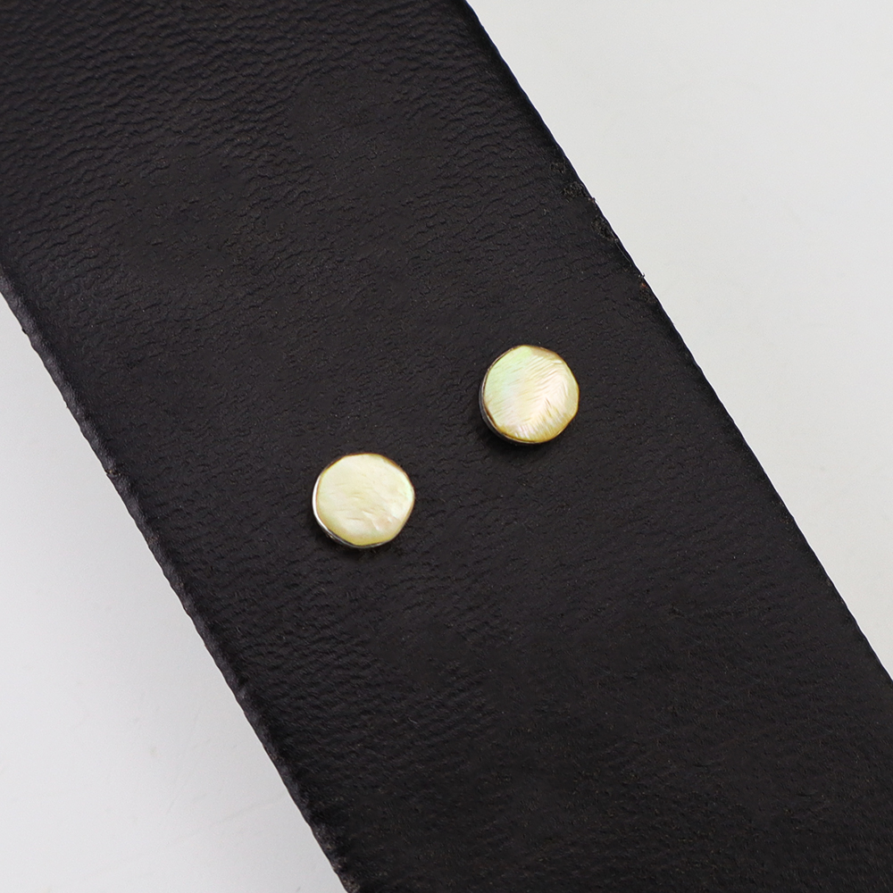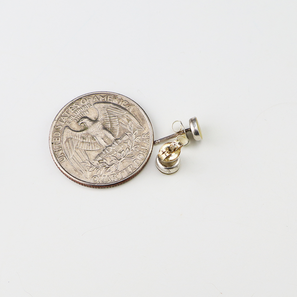 Each earring features Mother of Pearl Shell inlaid into a sterling silver setting. Hand made by Zuni jeweler Celena Rosetta. These gorgeous earrings will become a versatile accessory in your jewelry collection.