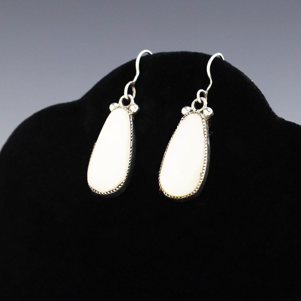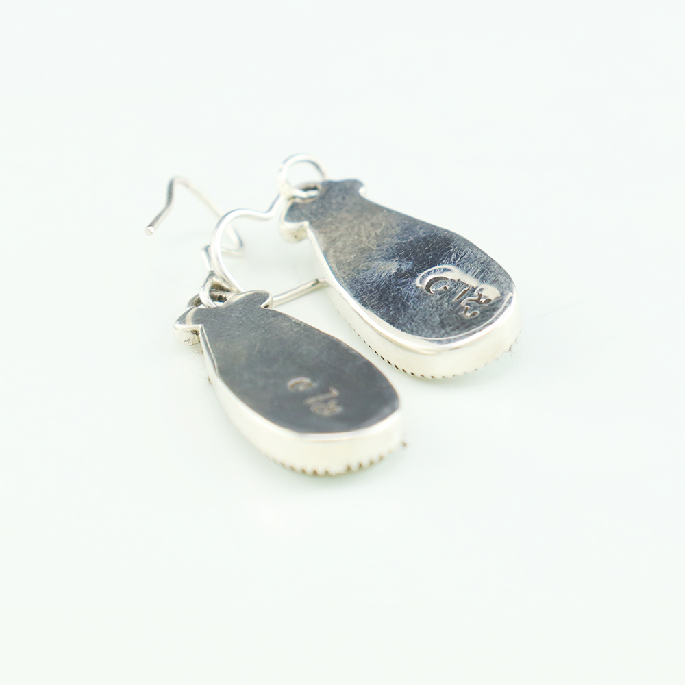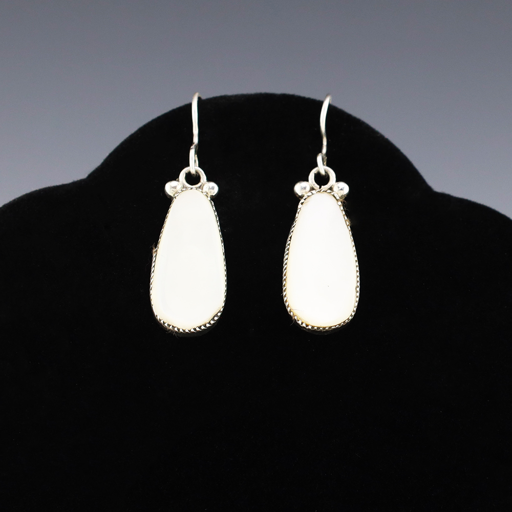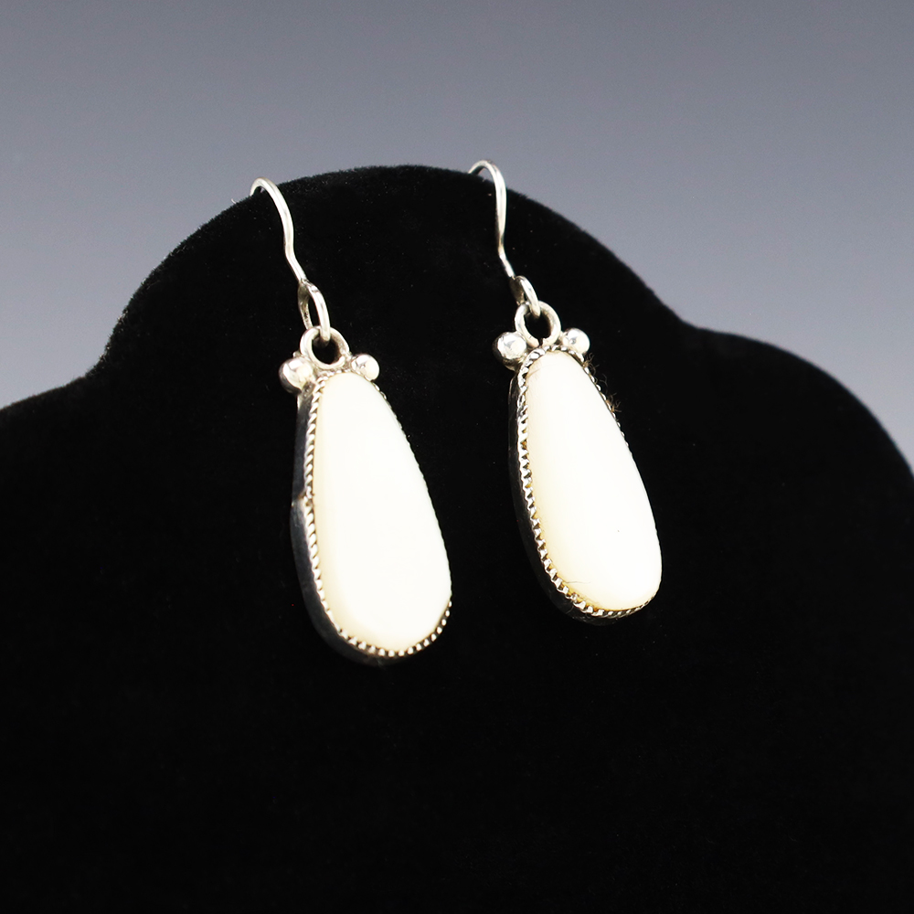 Zuni artist Diane Lonjose made these beautiful earrings. Made out of sterling silver and set with Mother of Pearl Shell. The components are all hand fabricated and the stones are all natural. Diane comes from a family of Zuni jewelers. She is the daughter of Alice and Duane Quam, and grandchild of Doris and Warren Ondelacy. Weighs 6 grams. Signed