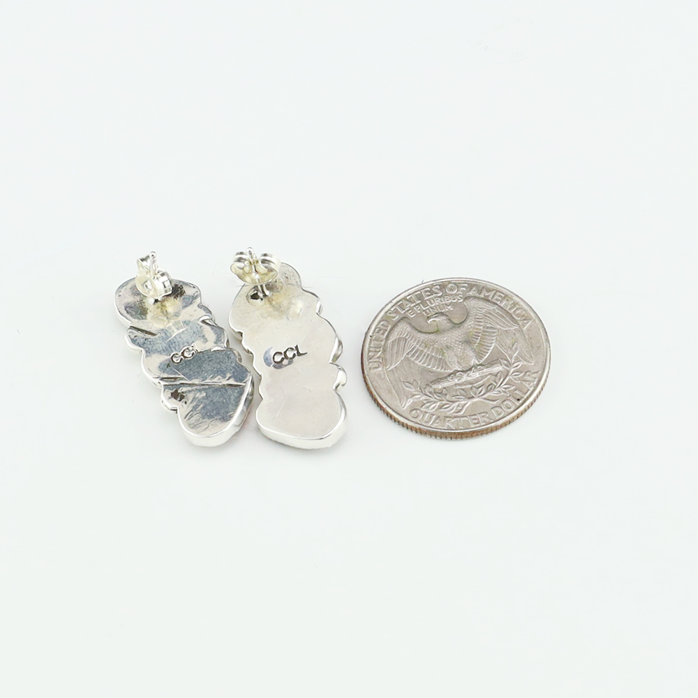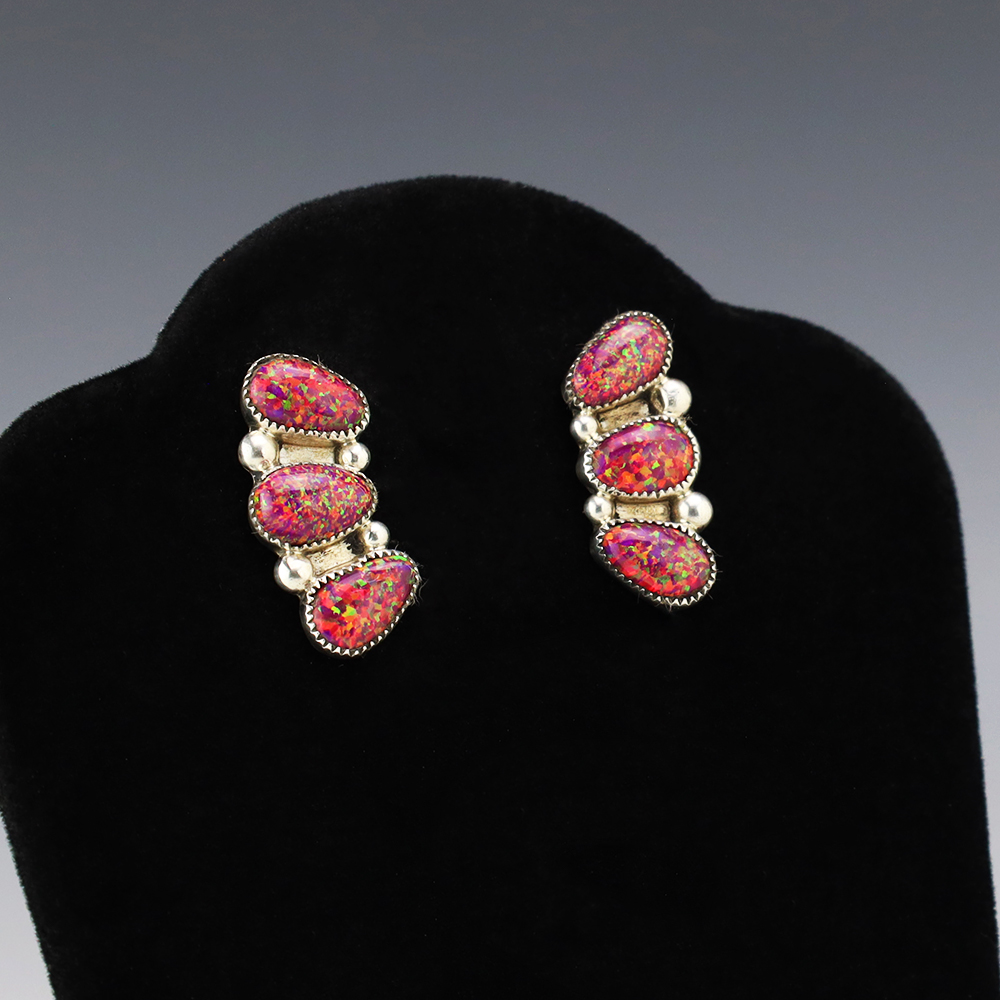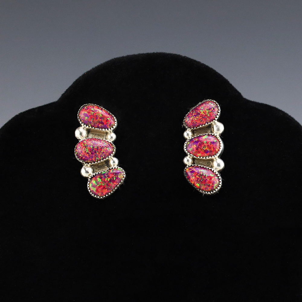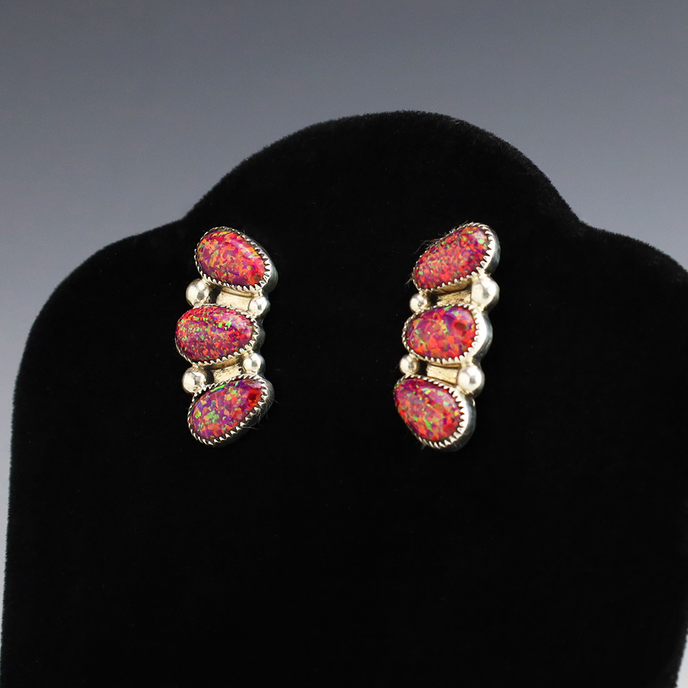 Zuni artist Carlo Lonjose made these gorgeous earrings out of sterling silver and Laboratory Opal. These cluster earrings will become a versatile accessory in your jewelry collection. Weighs 6 grams. Signed