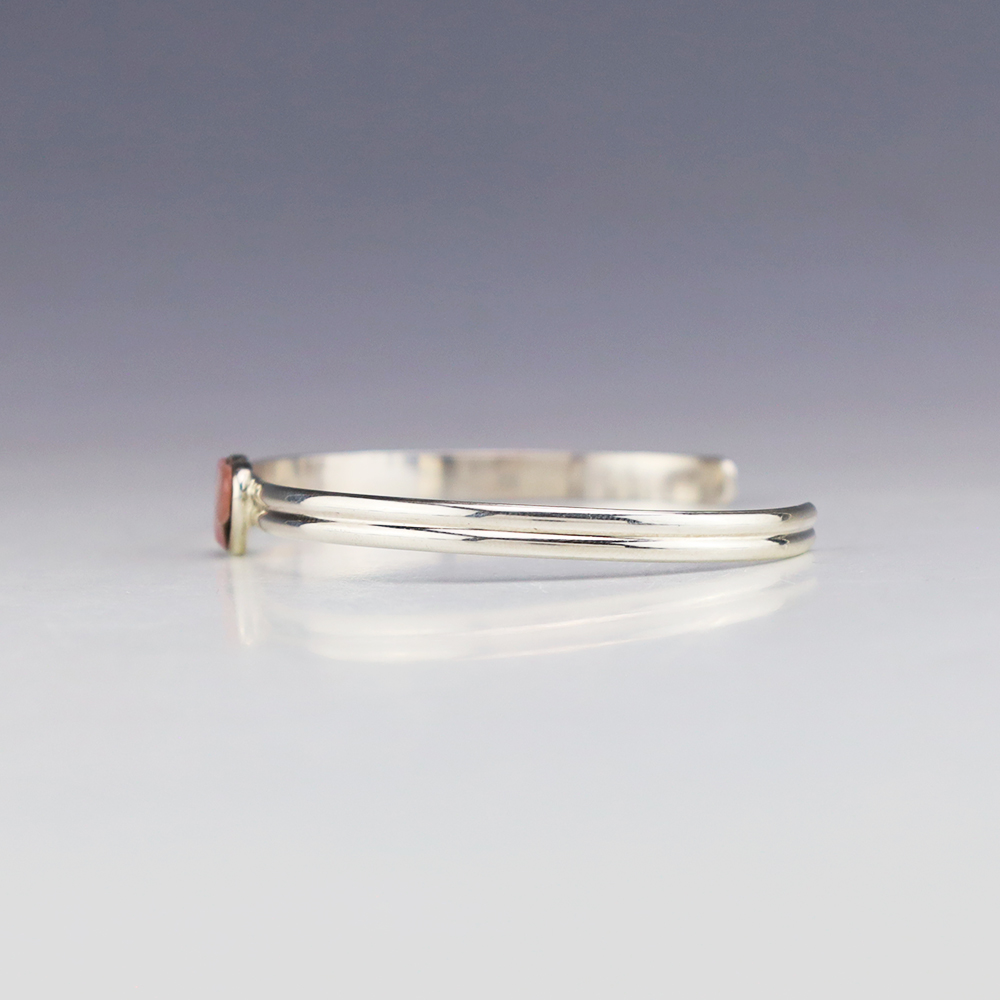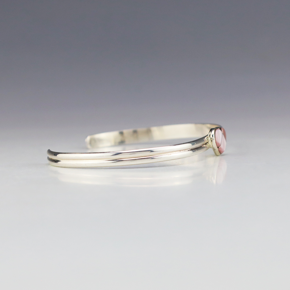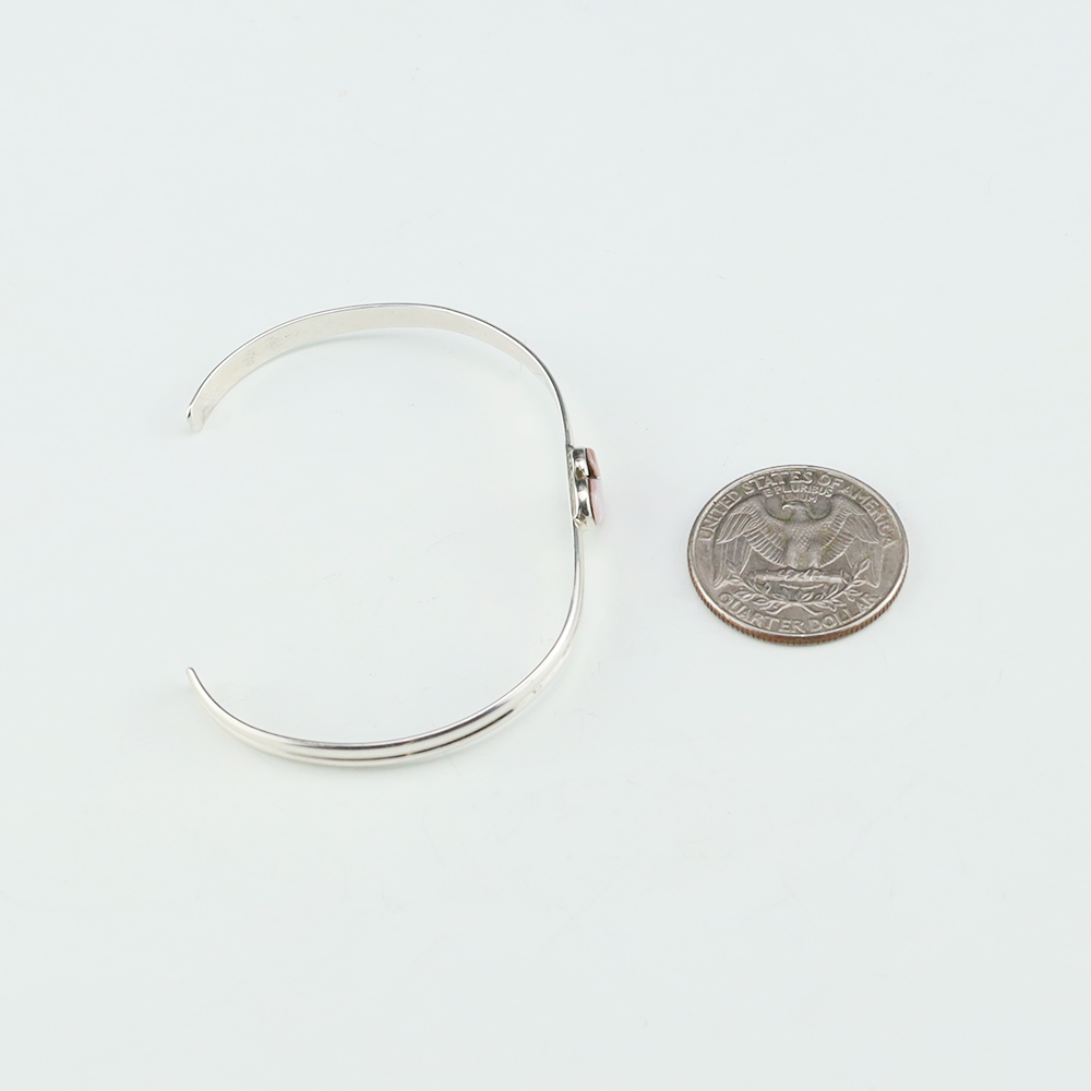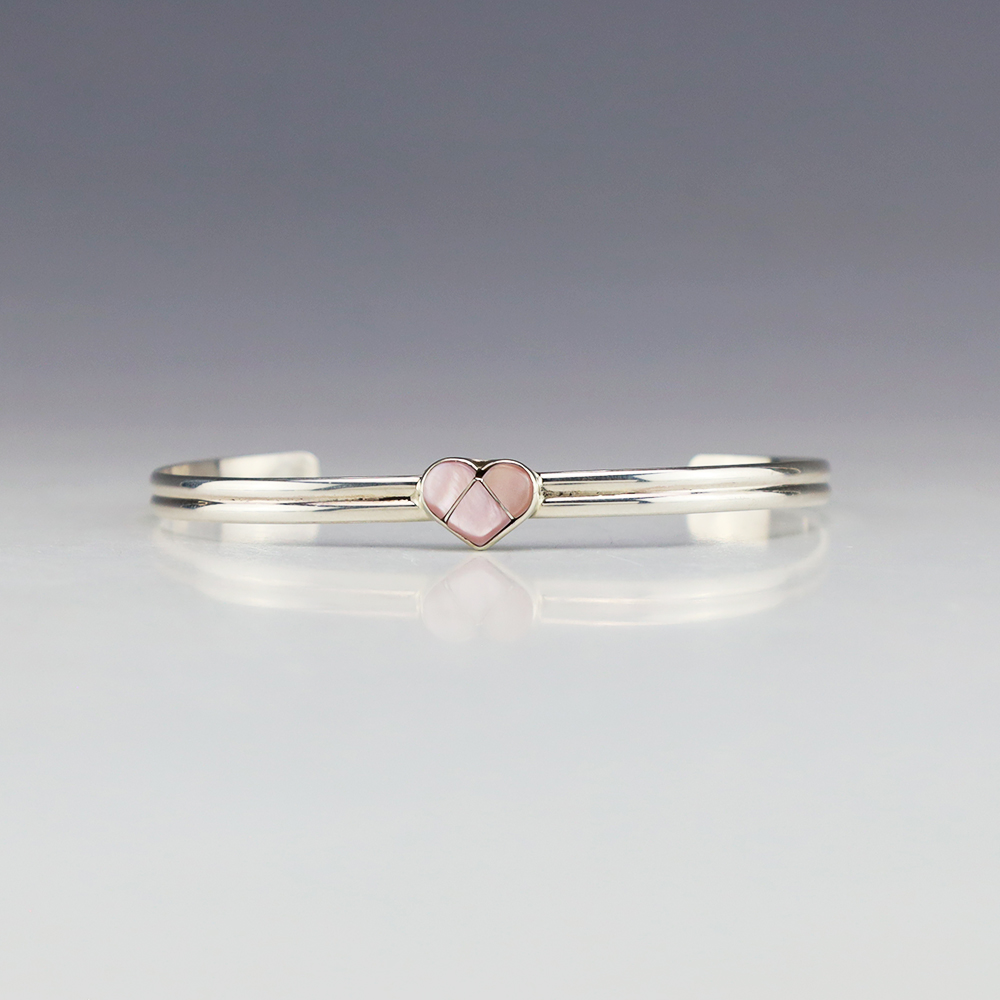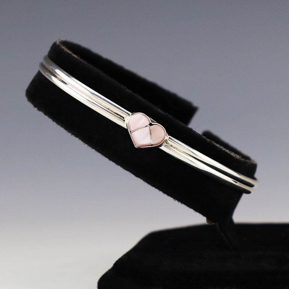 Zuni artist Linda Chavez made this lovely heart bracelet. Zuni artists are known for their fine lapidary skills. Each stone is hand cut, polished, and set into a sterling silver setting. This lovely bracelet is sterling silver and inlaid with Pink Mussel. Weighs 6 grams.