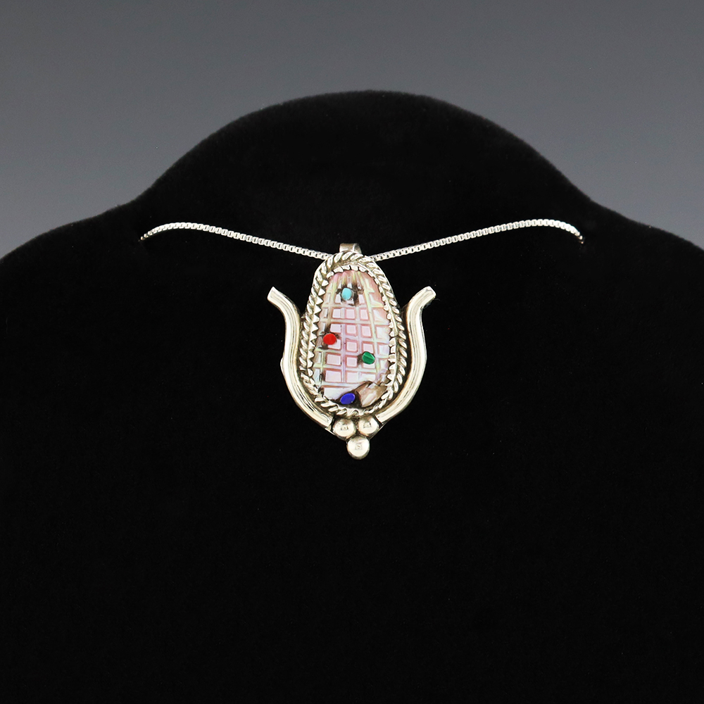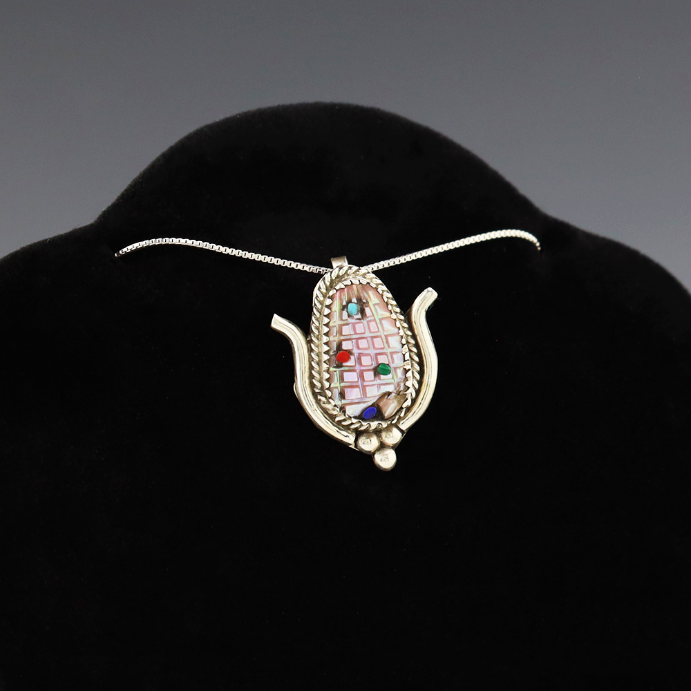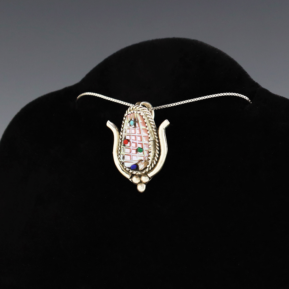 Zuni artist Tracy Bowekaty made this beautiful corn pendant. Zuni artists are known for their fine lapidary skills. Each stone is hand cut, polished, and set into a sterling silver setting. The pendant is inlaid with Pink Mussel, Coral, Turquoise, Lapis, and Malachite. Weighs 4 grams. Signed. (Chain not included) note-there is natural fracturing in shell