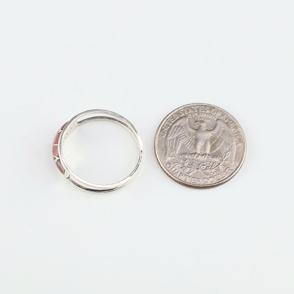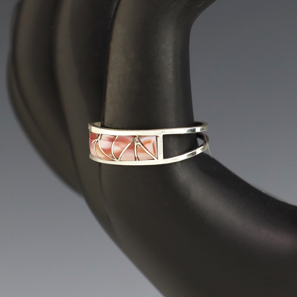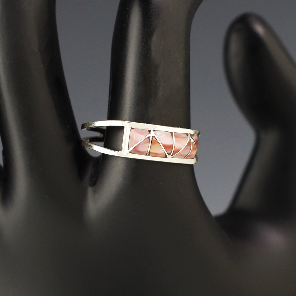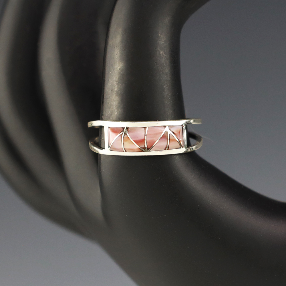 Zuni artists are known for their fine lapidary skills. Each stone is hand cut, polished, and set into a sterling silver setting. The ring is set with Pink Mussel stones. Hand made by Zuni artist Gloria Tucson. Weighs 2 grams. Size 10. Signed