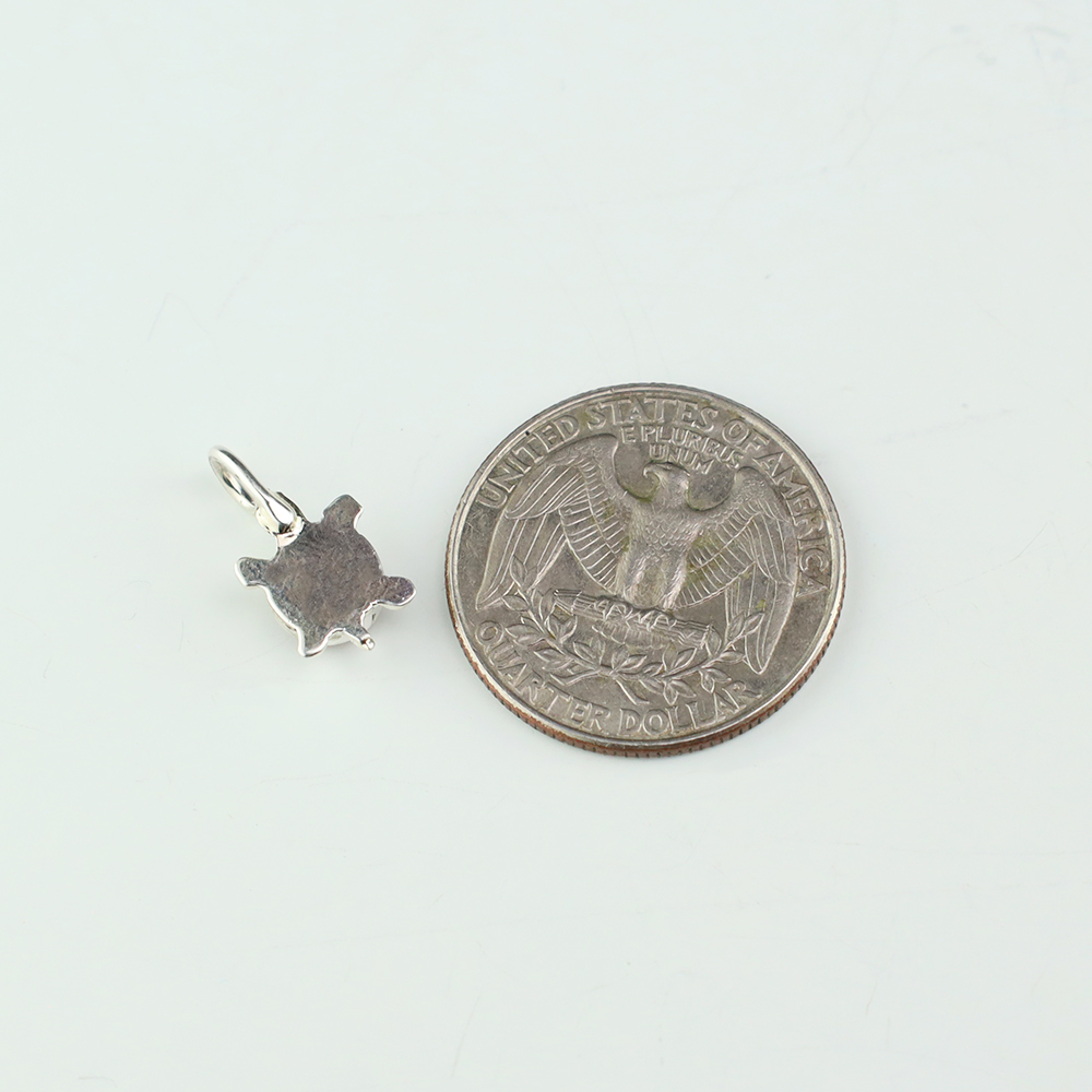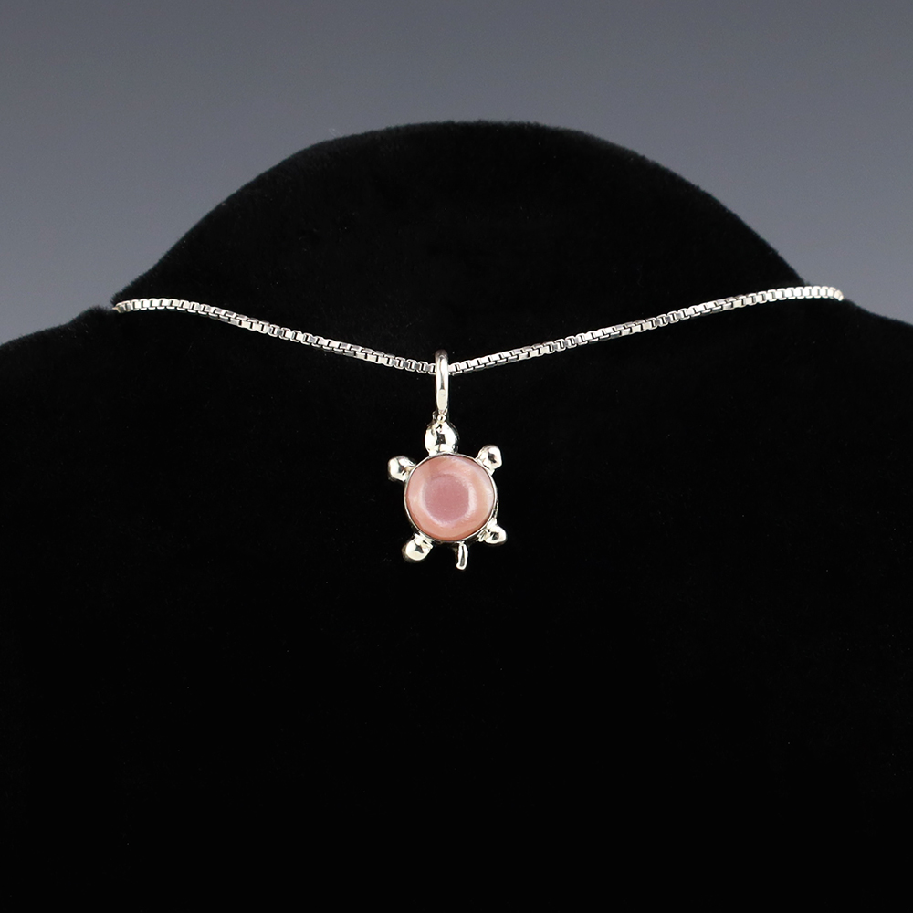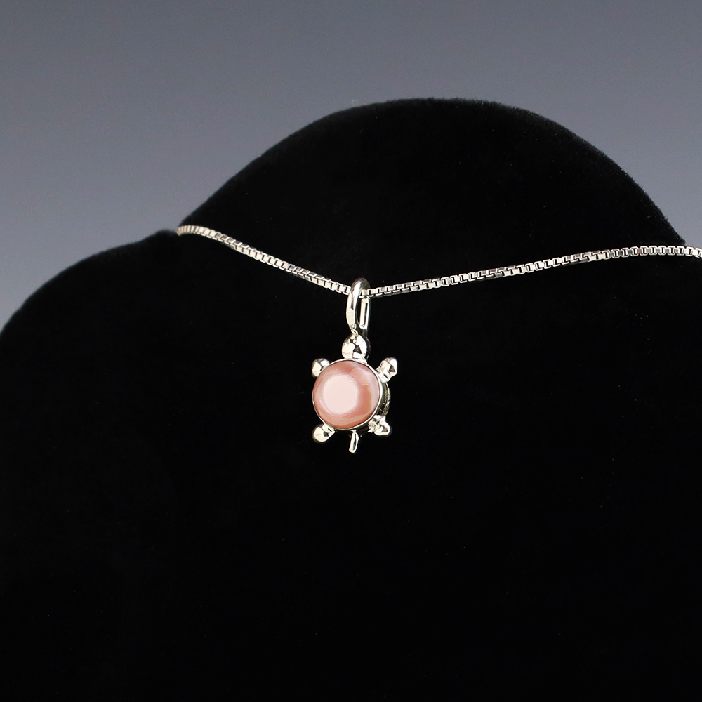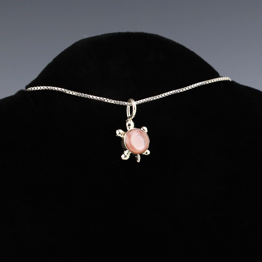 Zuni artists are known for their fine lapidary skills. Each stone is hand cut, polished, and set into a sterling silver setting. This wonderful turtle pendant is inlaid with a Pink Mussel stone. Hand made by Zuni artist Trista Siow. Weighs 2 grams. (Chain not included)